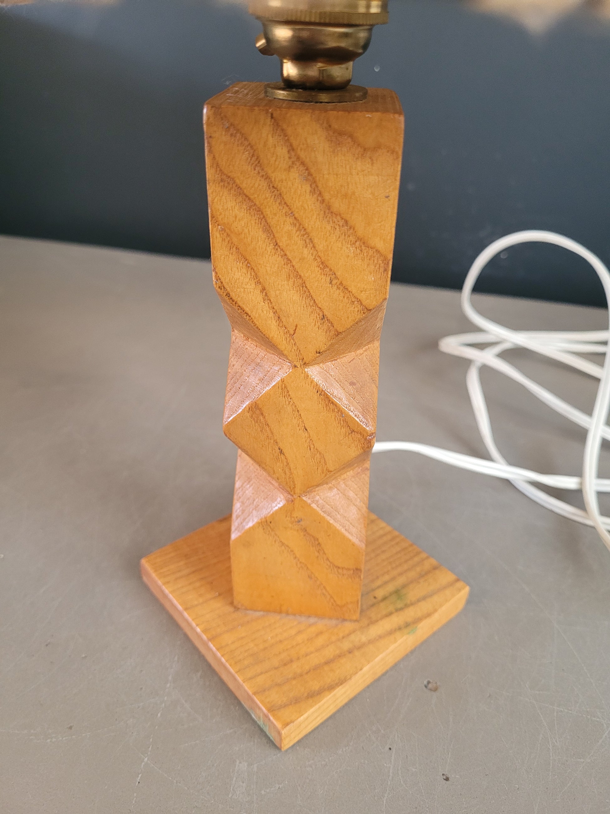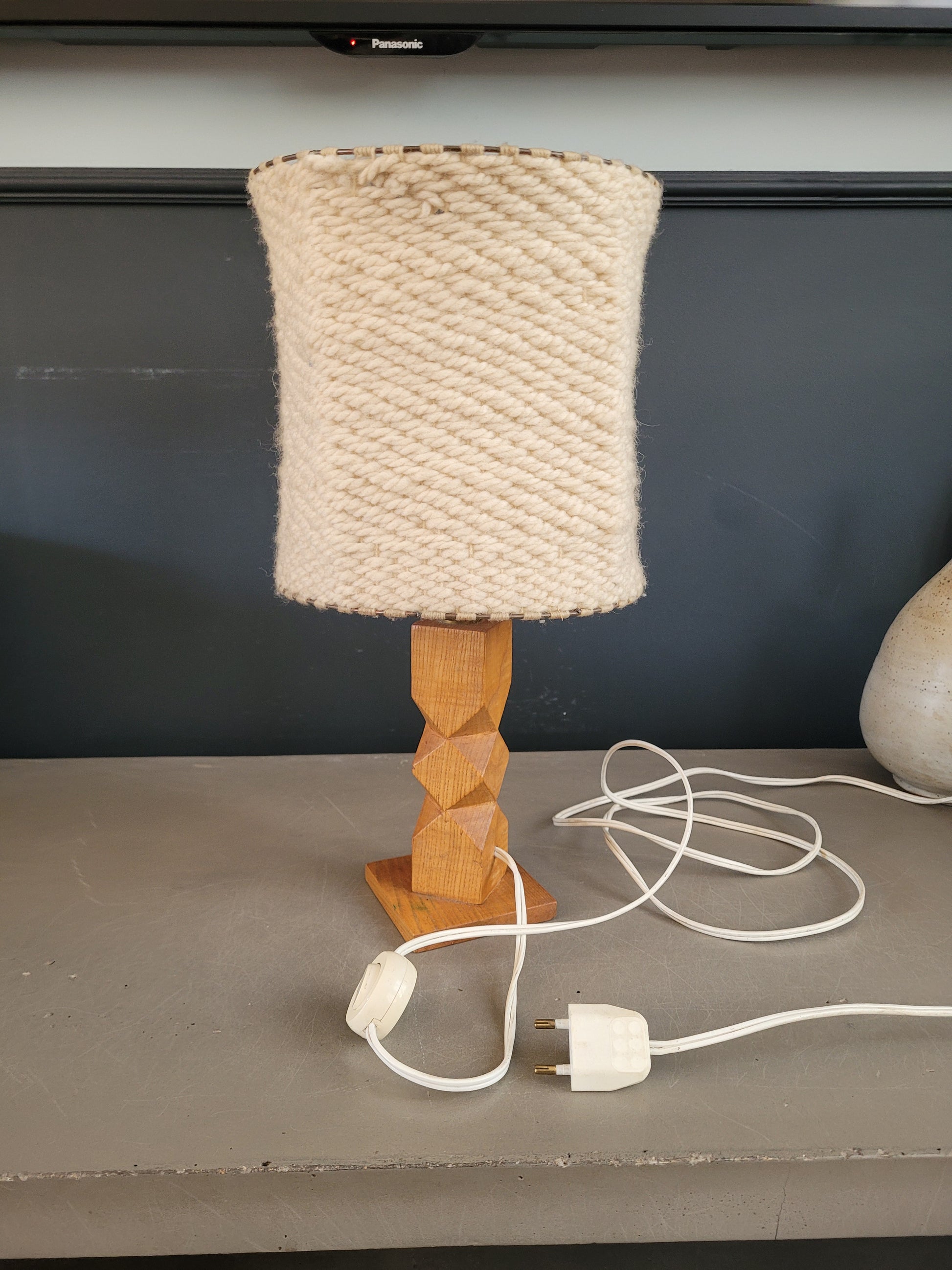 Très belle lampe à poser ancienne avec un pied en bois sculpté et abat-jour cylindre en laine naturelle tissée.