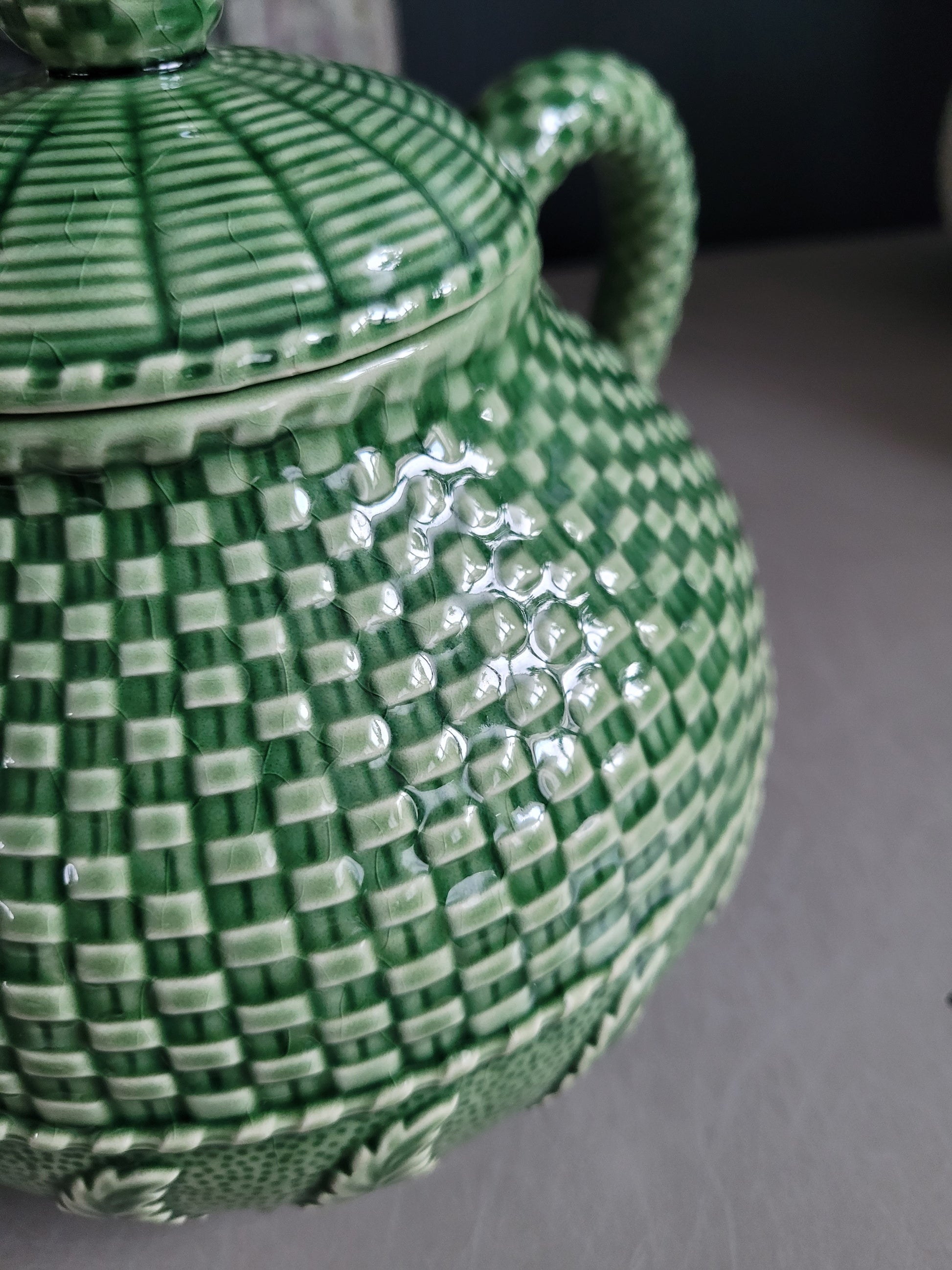 Sublime théière en porcelaine Bordallo Pinheiro du Portugal, de couleur vert sapin.