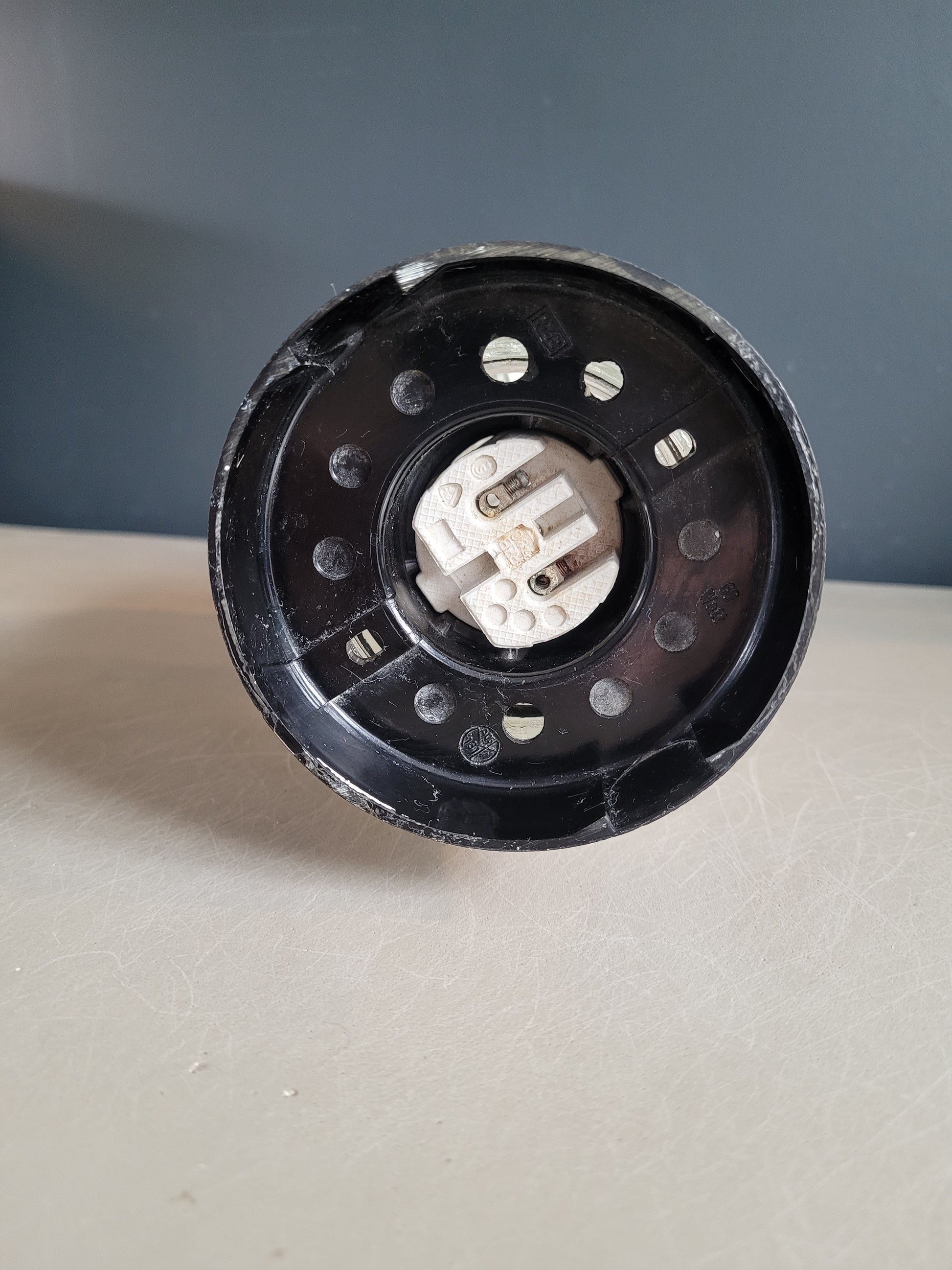 Le socle est en plastique noir et la douille convient pour une ampoule à vis E27.