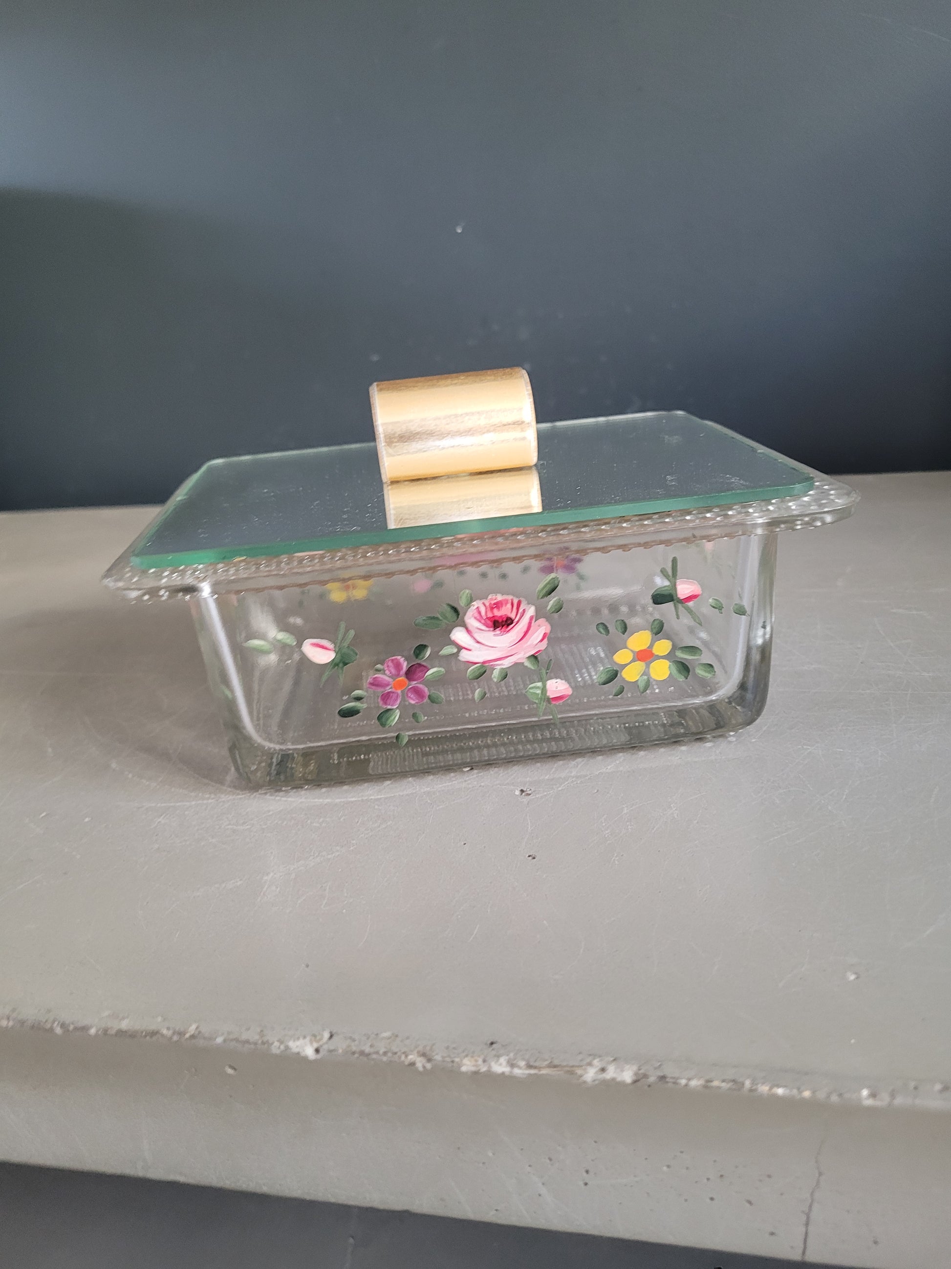 Superbe boîte à sucre en verre peinte à la main sur les 4 faces de motifs floraux.