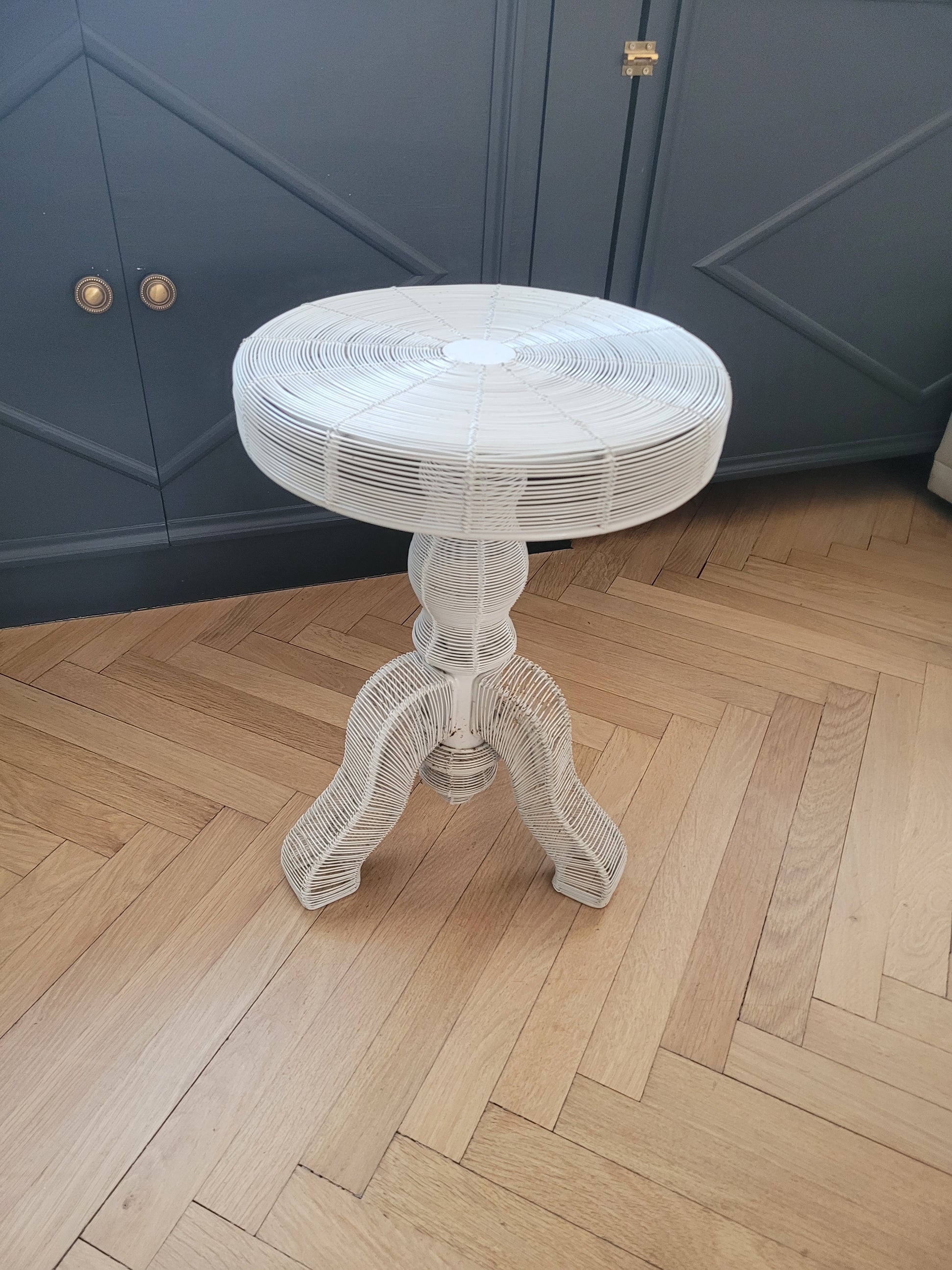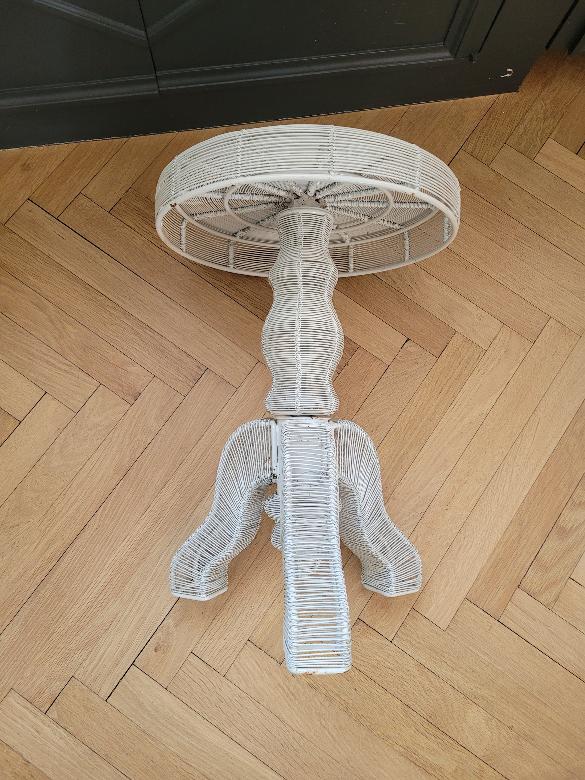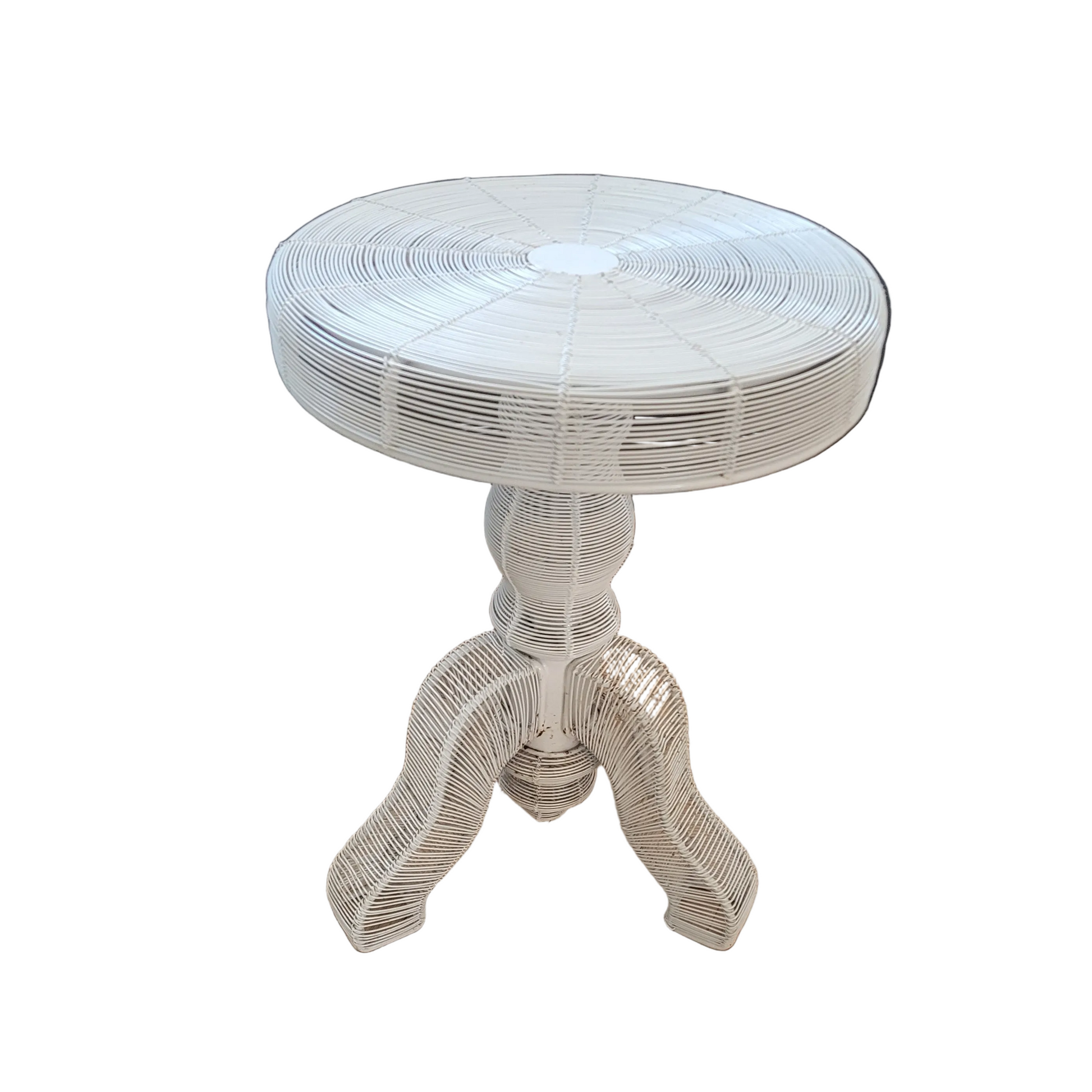 Table d'appoint en fil métallique laqué blanc, adoptant la silhouette d'un meuble d'époque.