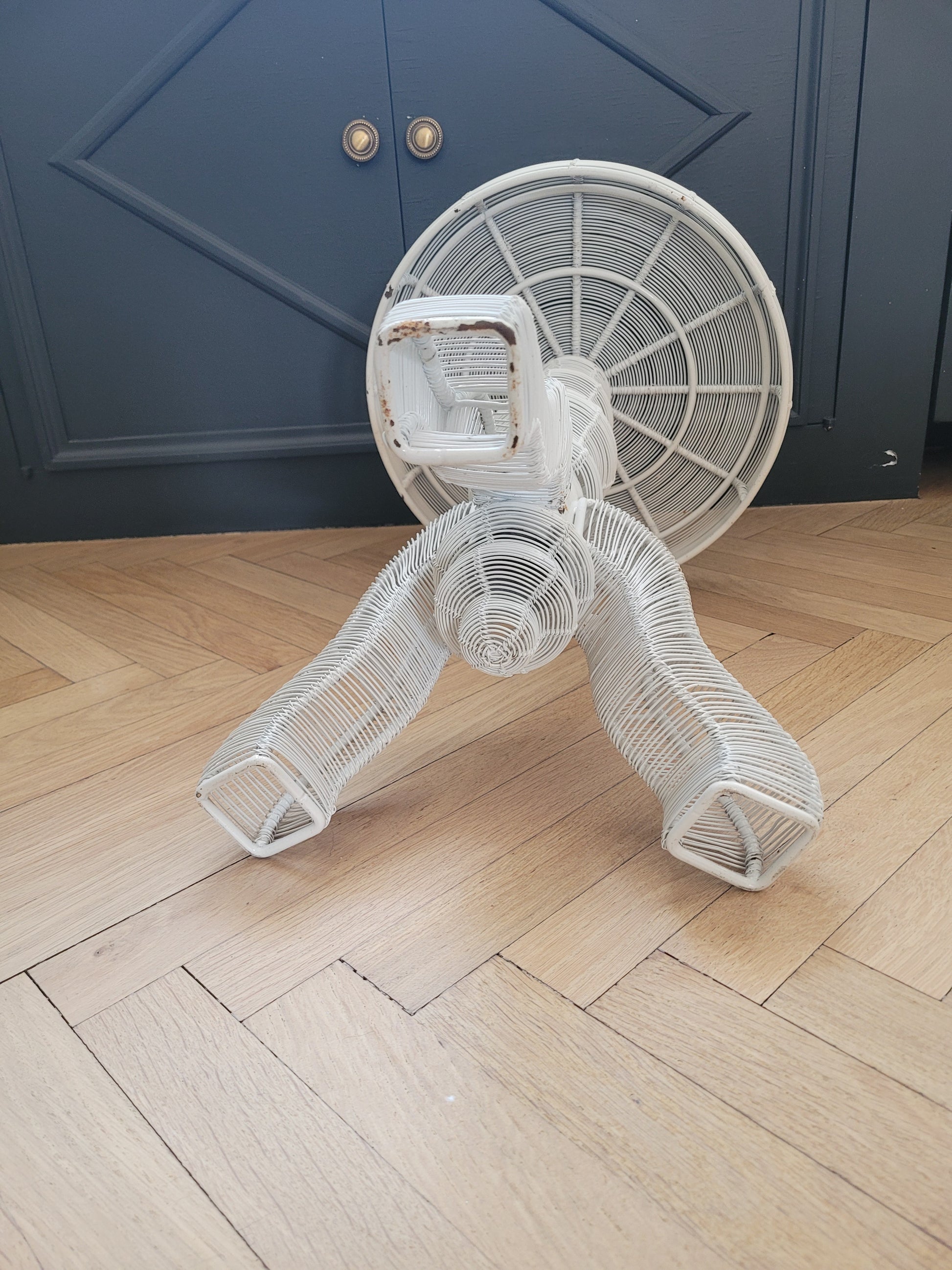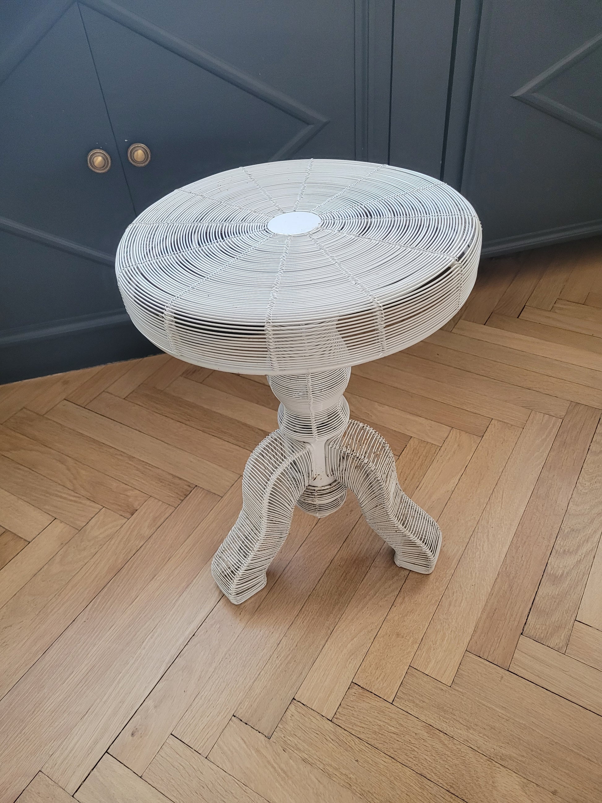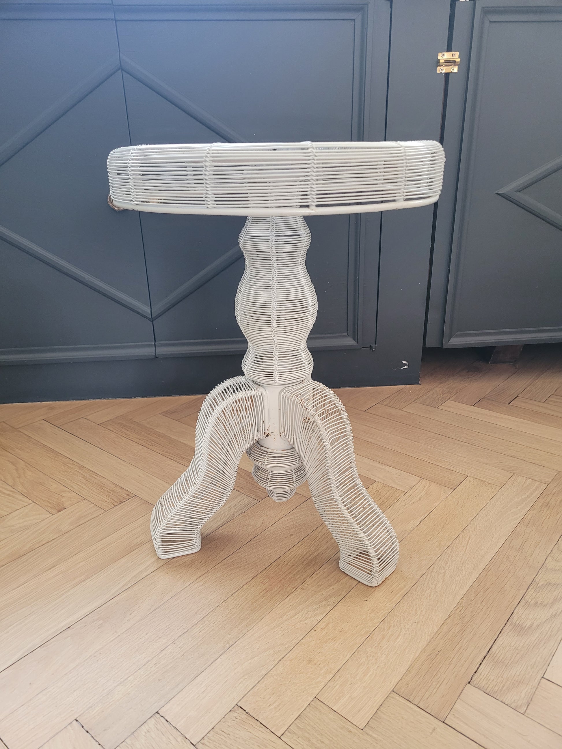 Table d'appoint en fil métallique laqué blanc, adoptant la silhouette d'un meuble d'époque.