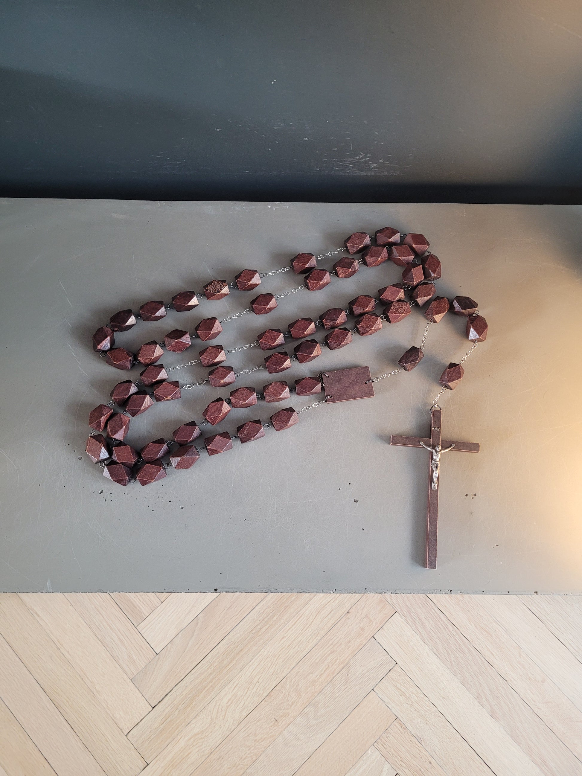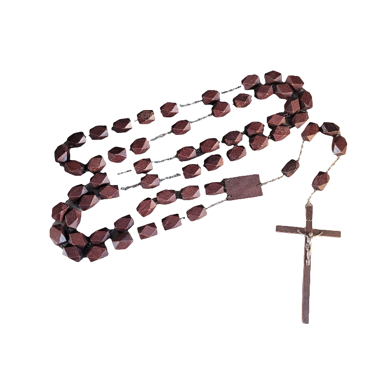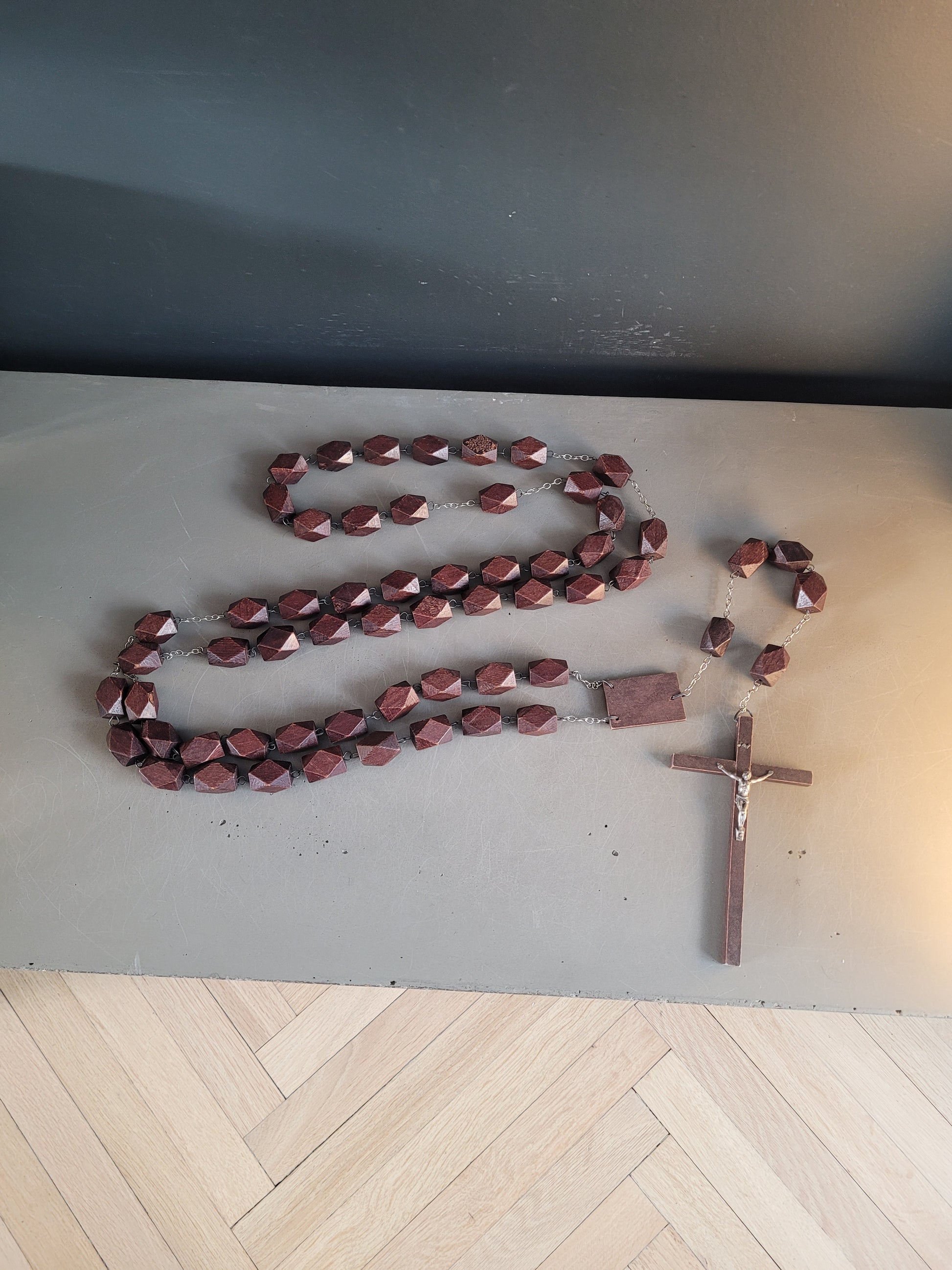 Ce grand chapelet ancien de 170 cm de long, est réalisé en perles de bois taillées, à 14 facettes chacune.