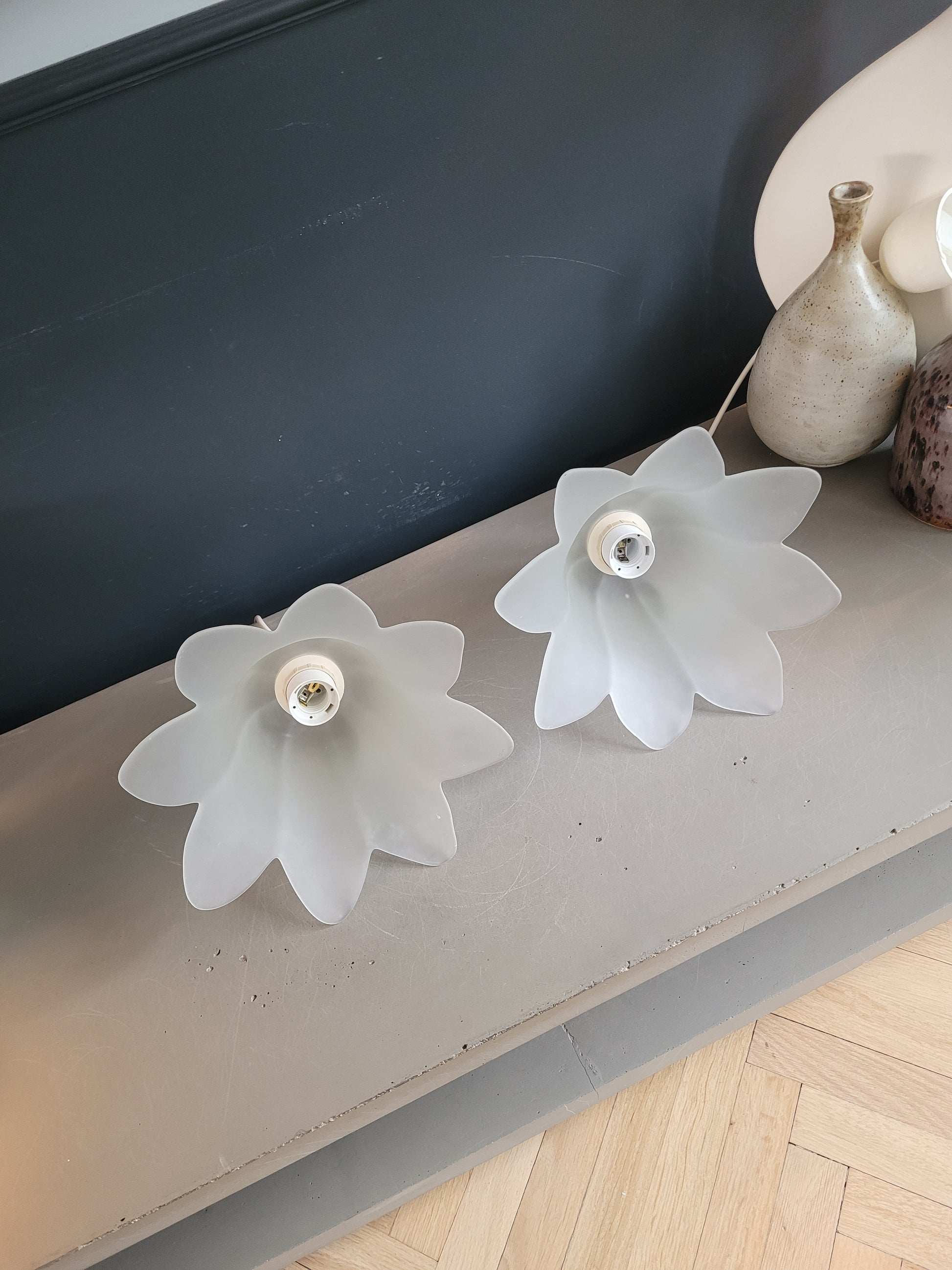 Magnifique paire de suspensions vintage en forme de fleurs, en verre dépoli transparent.