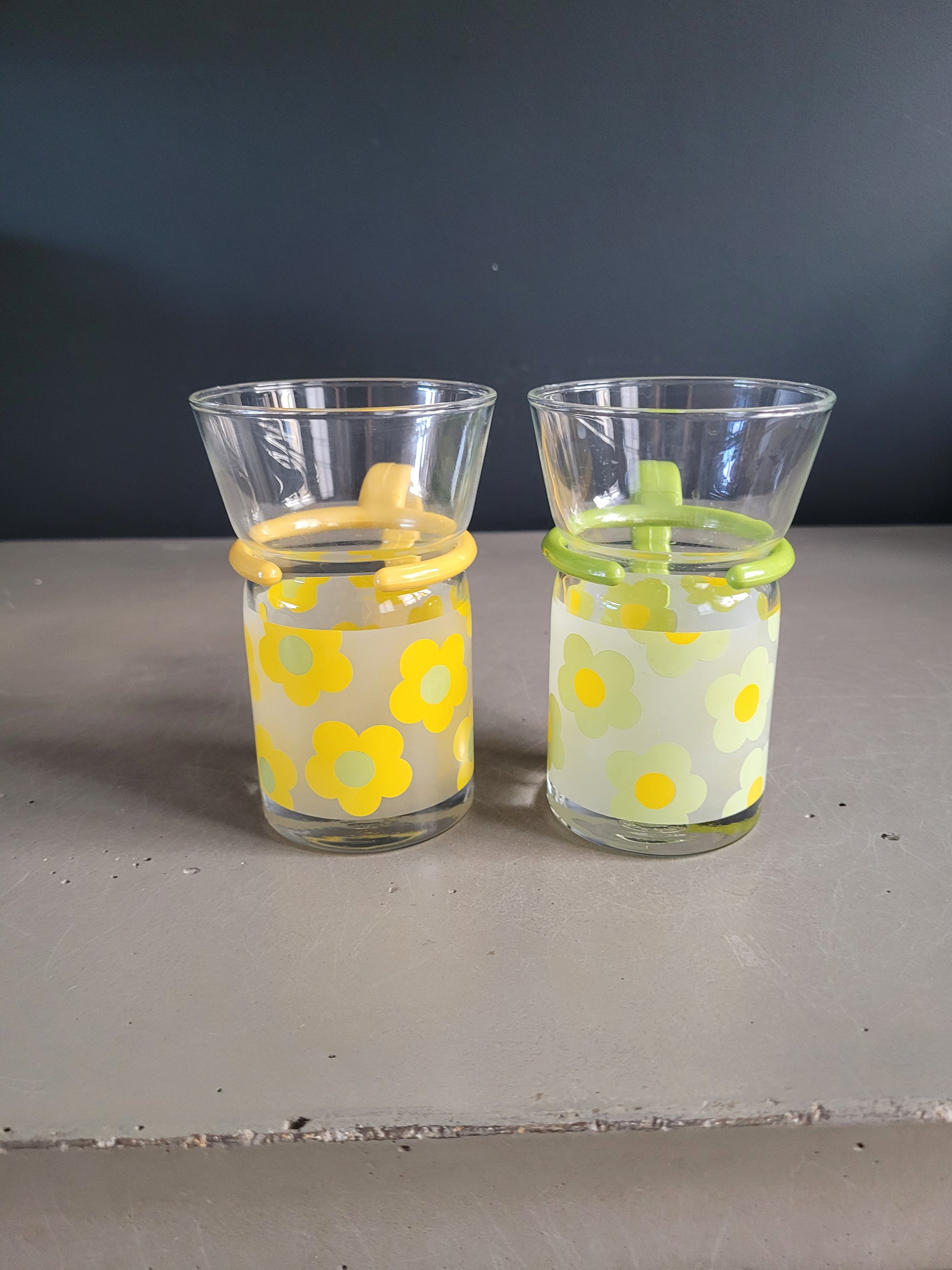 Superbe paire de tasses à thé vintage en verre à motif à fleurs et anse en plastique, assorties façon "toi et moi", une jaune et une verte.