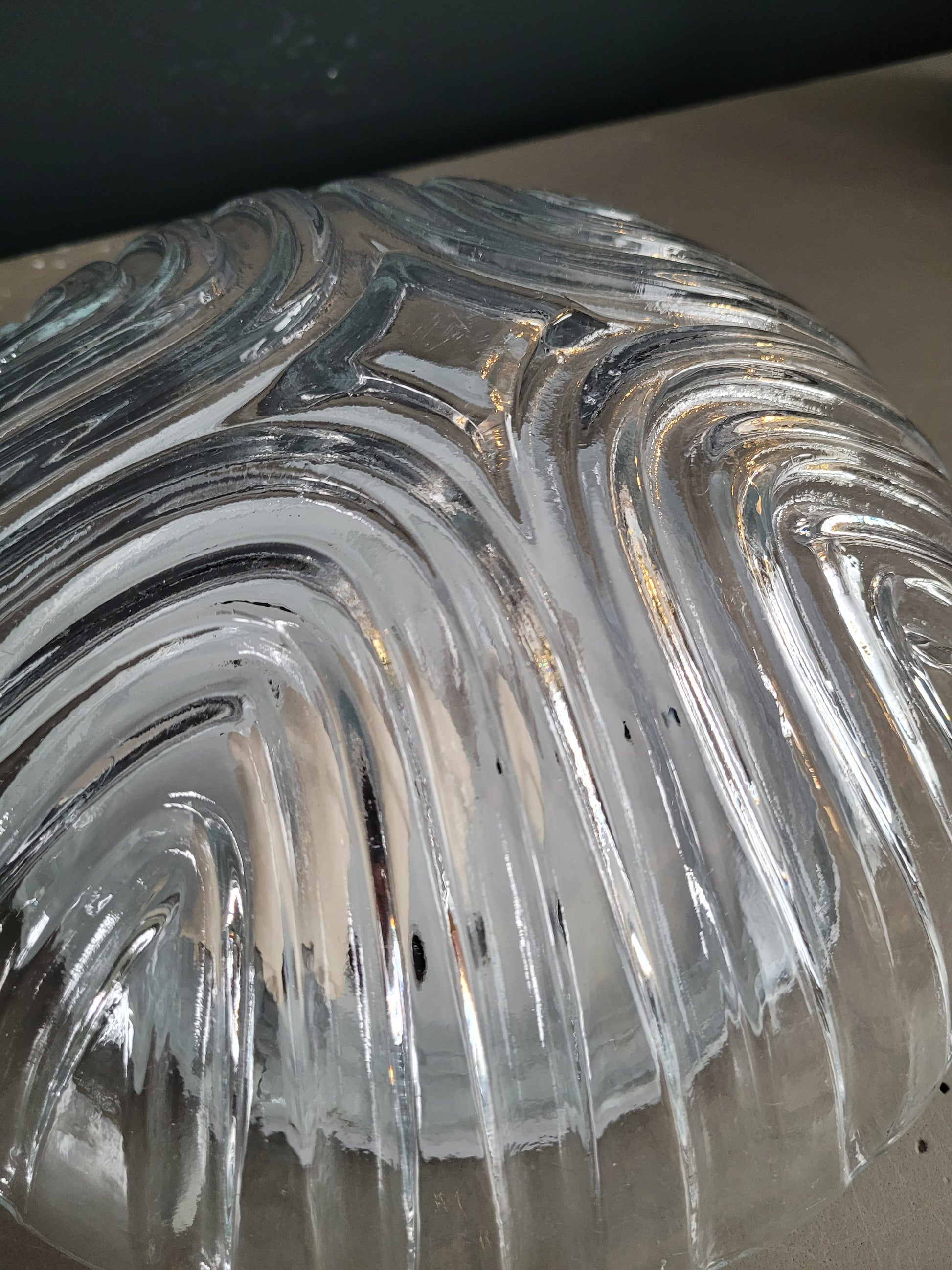 Sublime plafonnier ou applique, en forme de demi-sphère, en verre moulé ranspatent à motifs géométriques en relief.