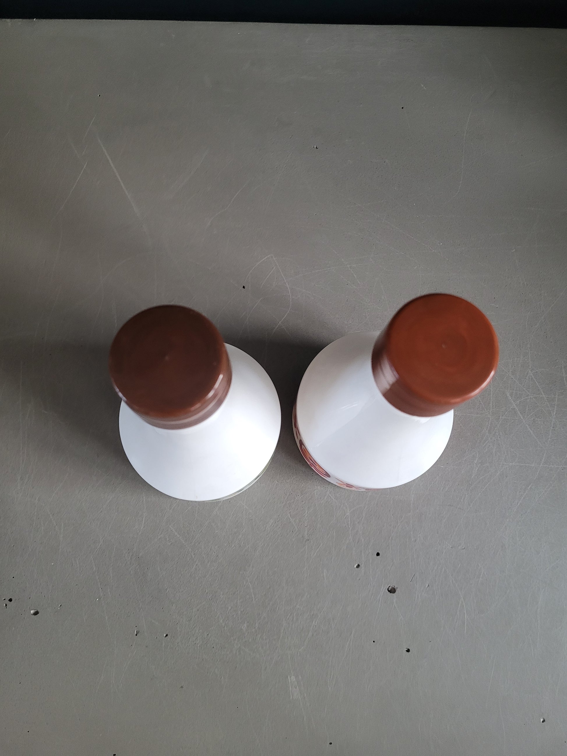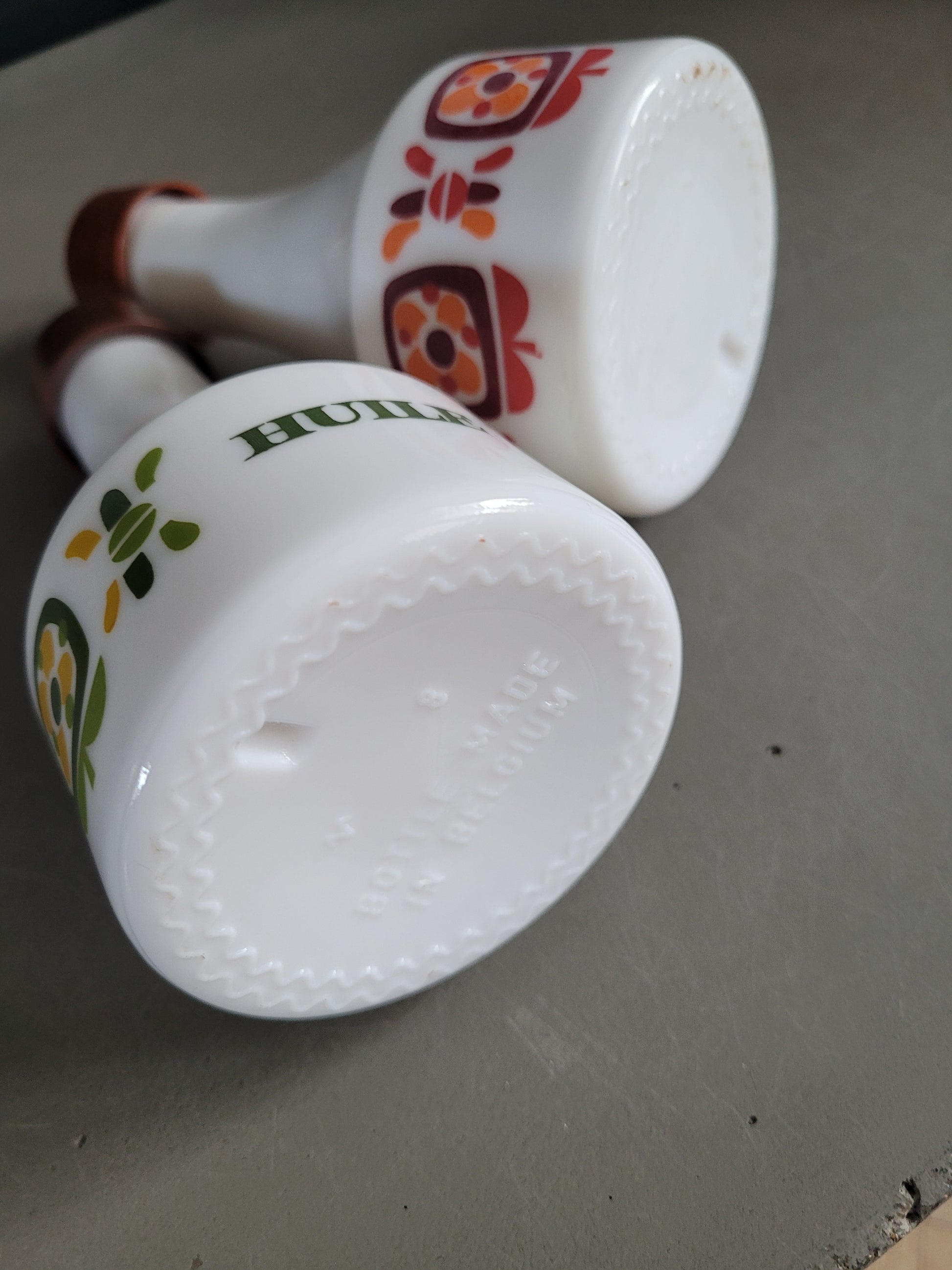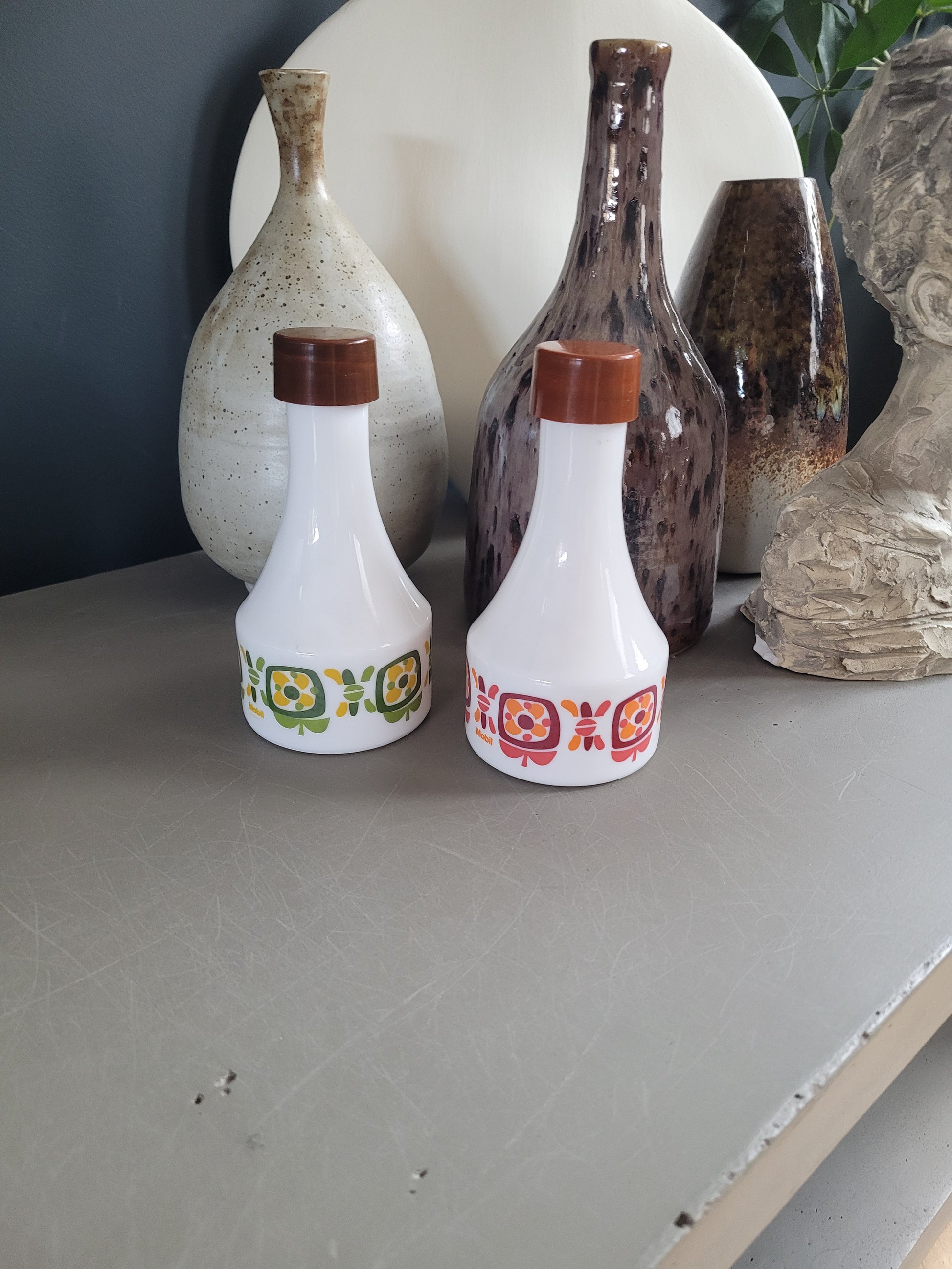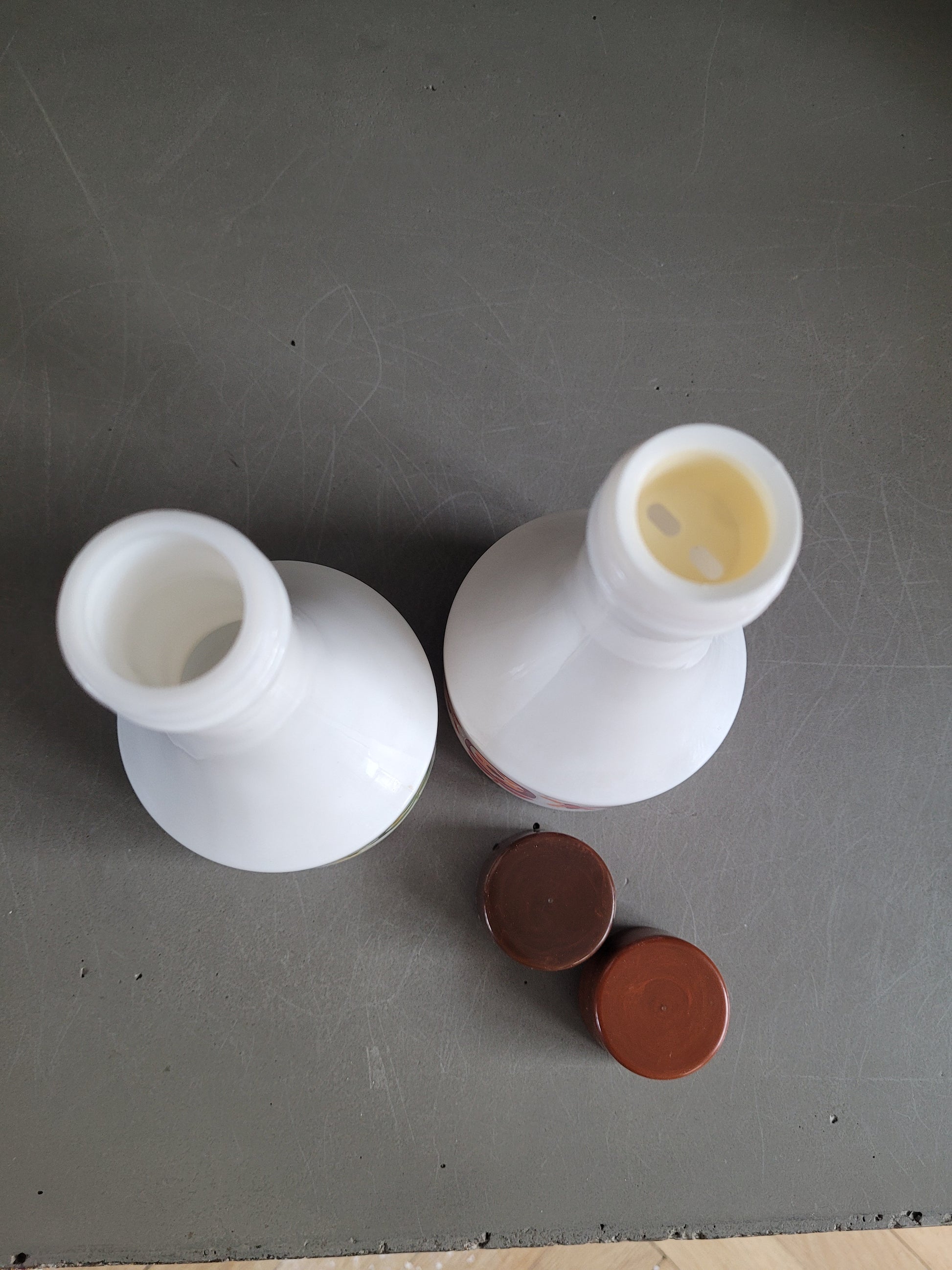 Superbe paire de bouteilles de service pour l'huile et le vinaigre, en verre opaque blanc, sérigraphié de couleurs assorties, vert/jaune pour l'huile et rouge/orange pour le vinaigre.