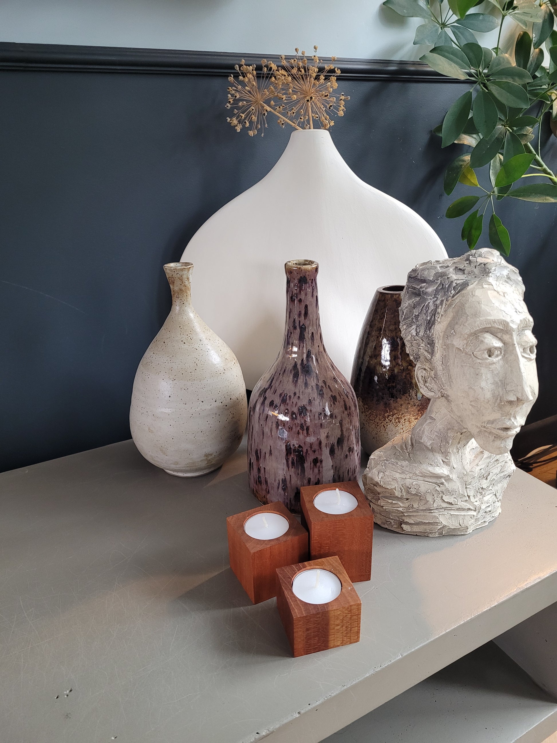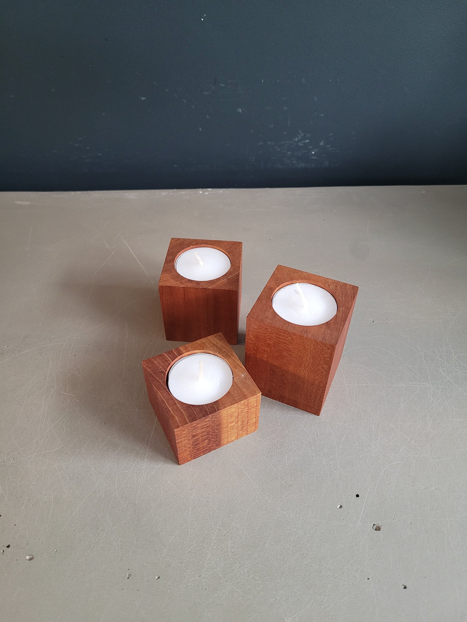 Magnifique trio de bougeoirs vintages, de hauteurs différentes, en teck massif.
