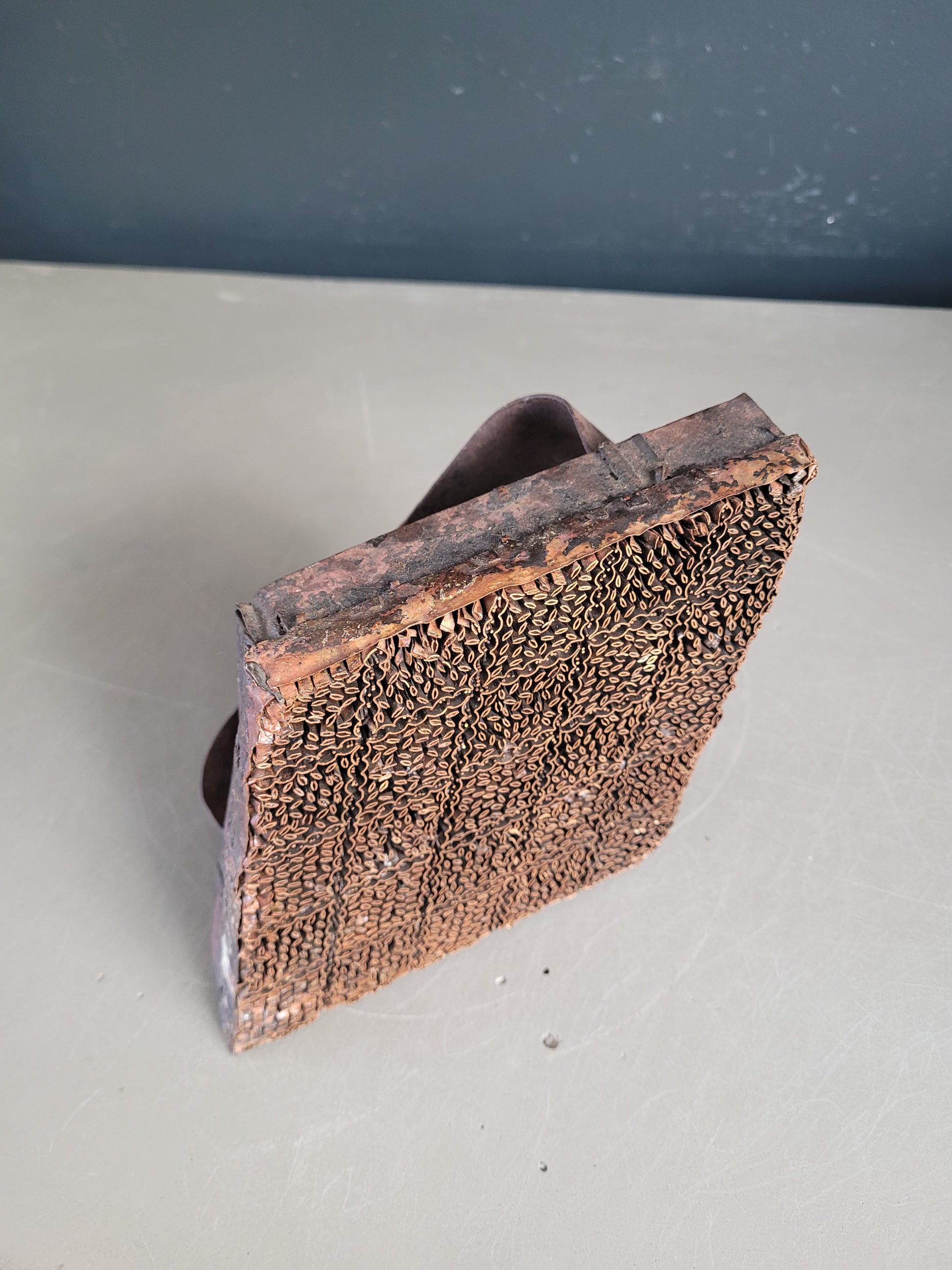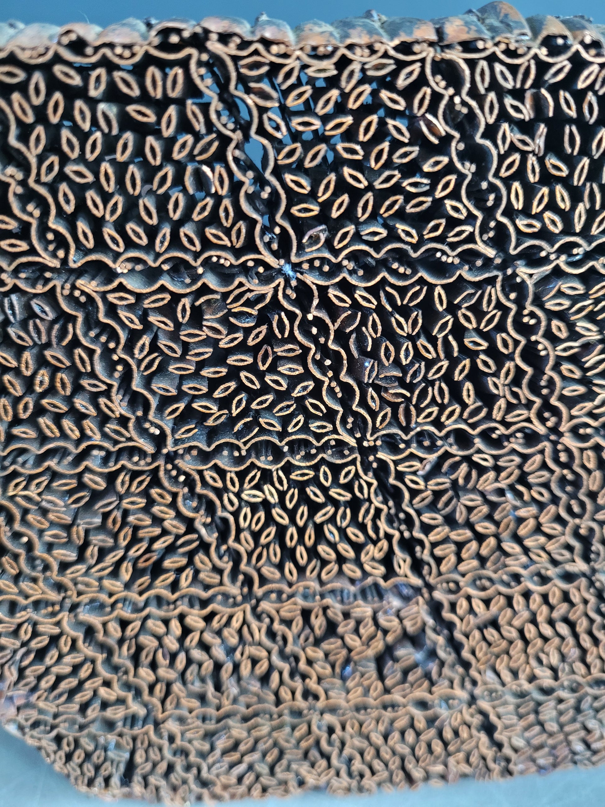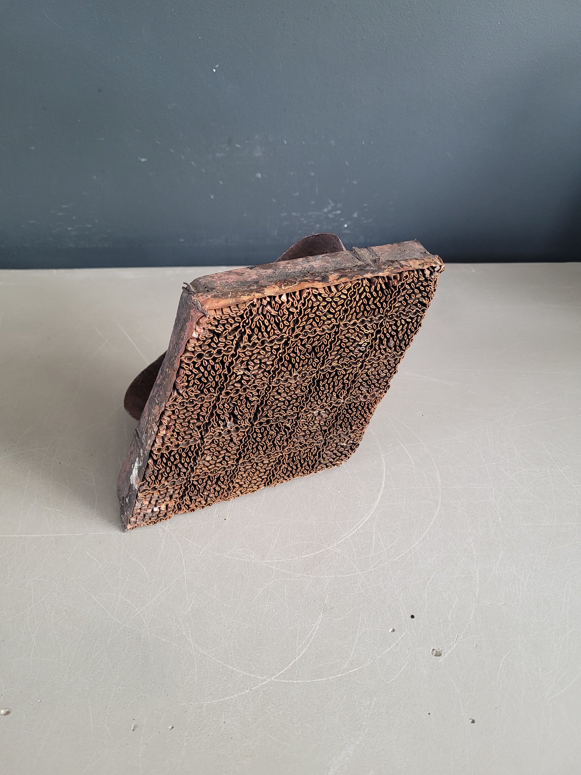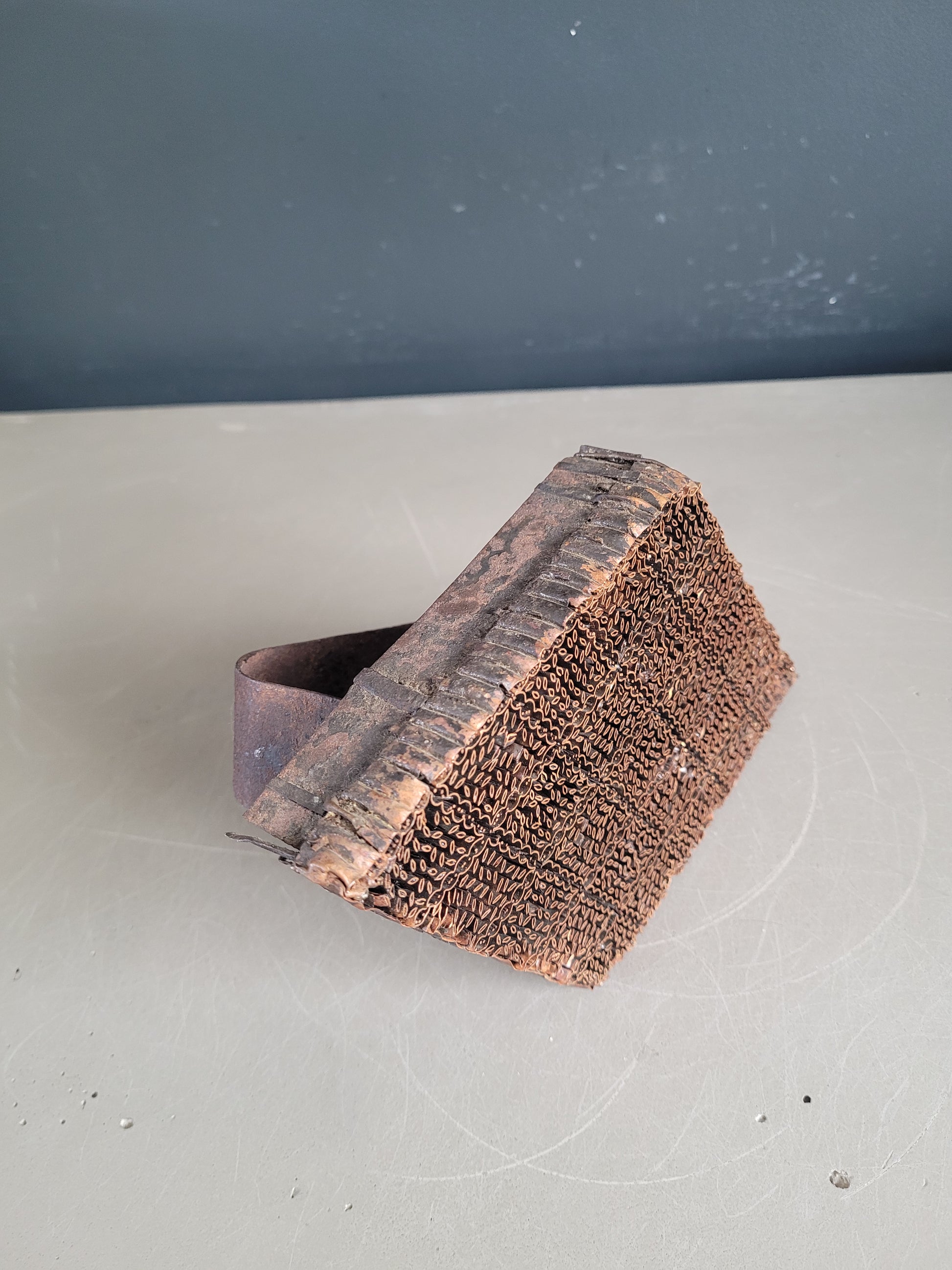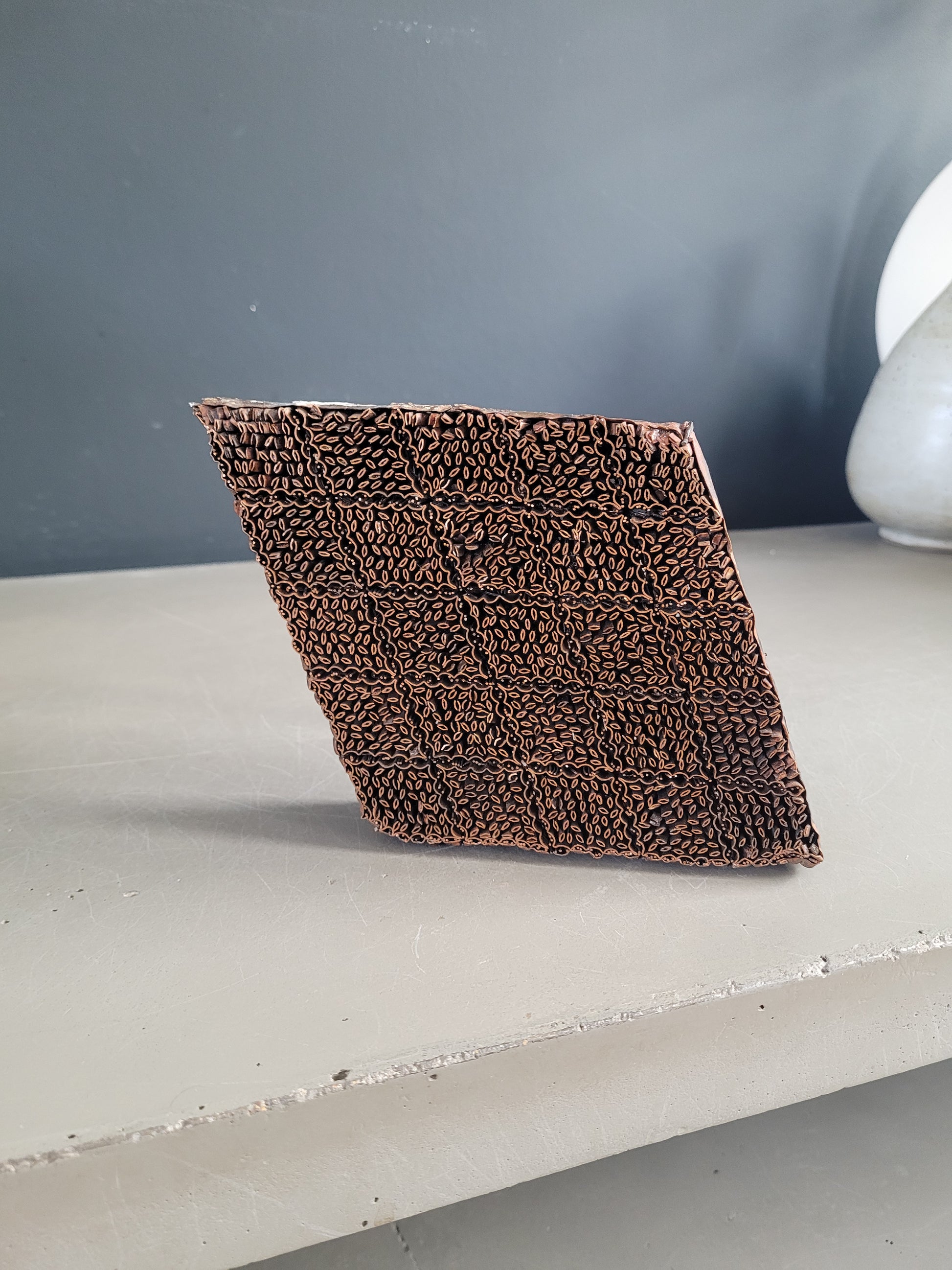 Tampon textile artisanal entièrement en cuivre, formé de fines lamelles pliées créant un motif géométrique très dense.