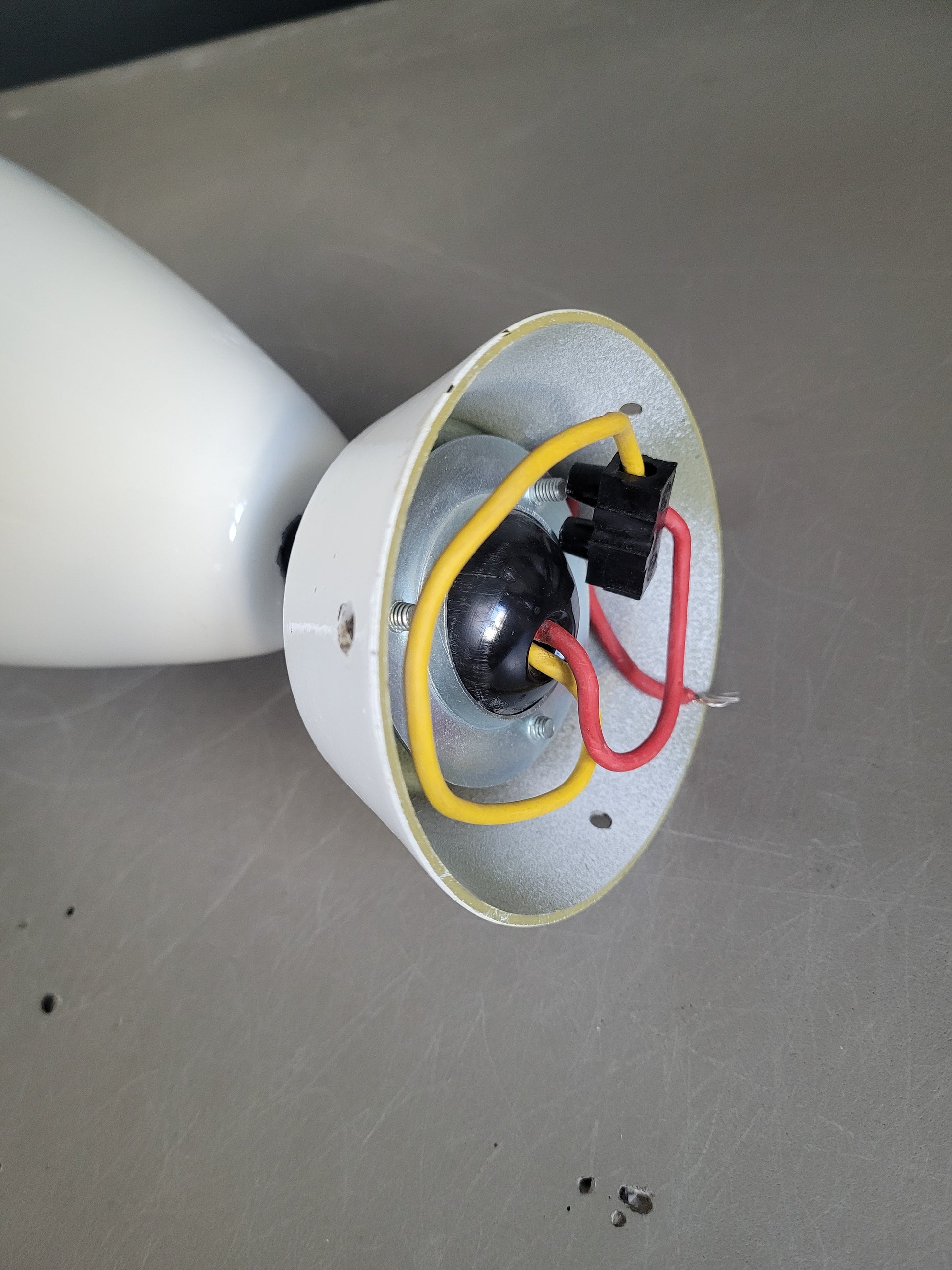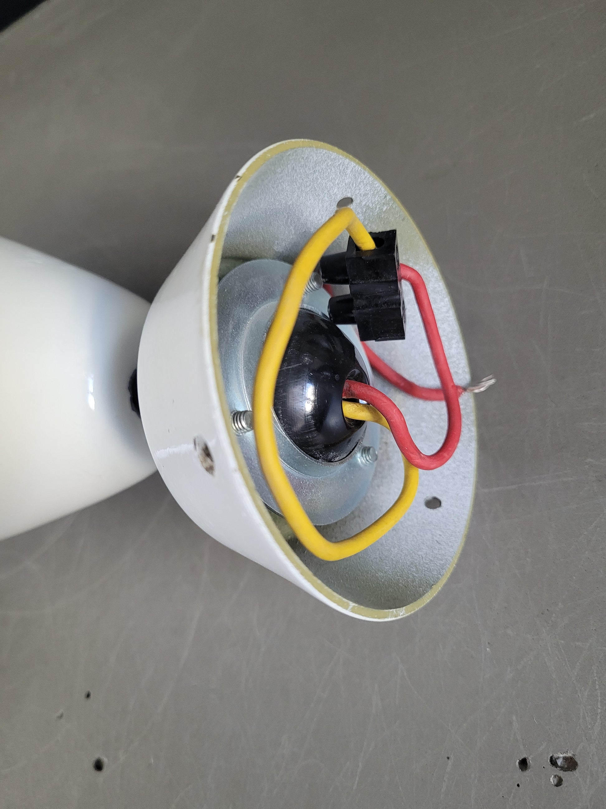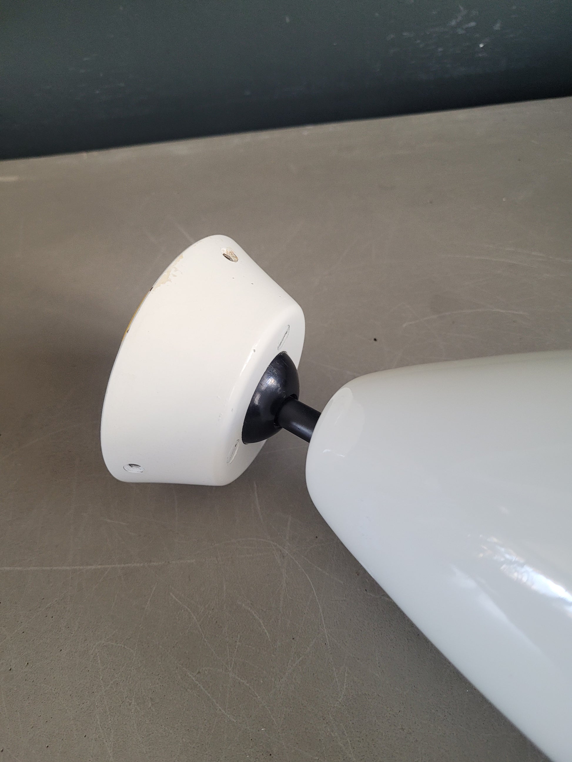 La lampe est fixée à la rosace sur une rotule en bakélite noire, que l'on peut orienter dans toutes les directions et bloquer en position.