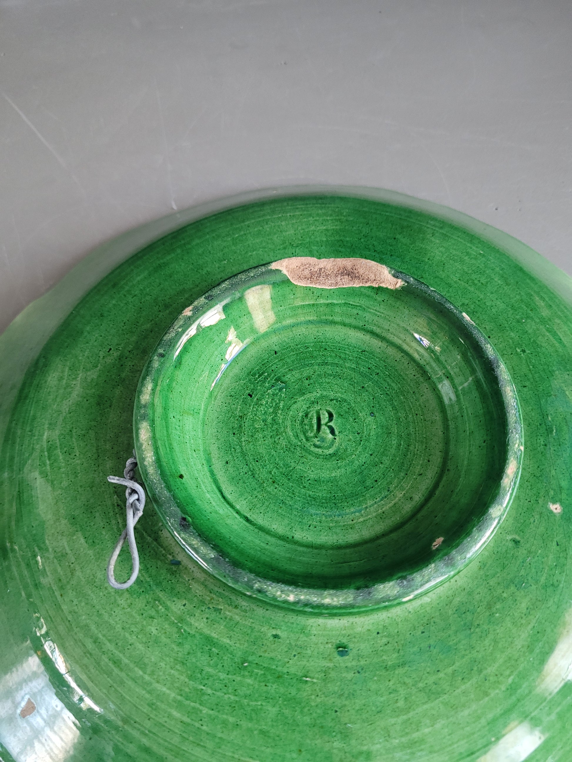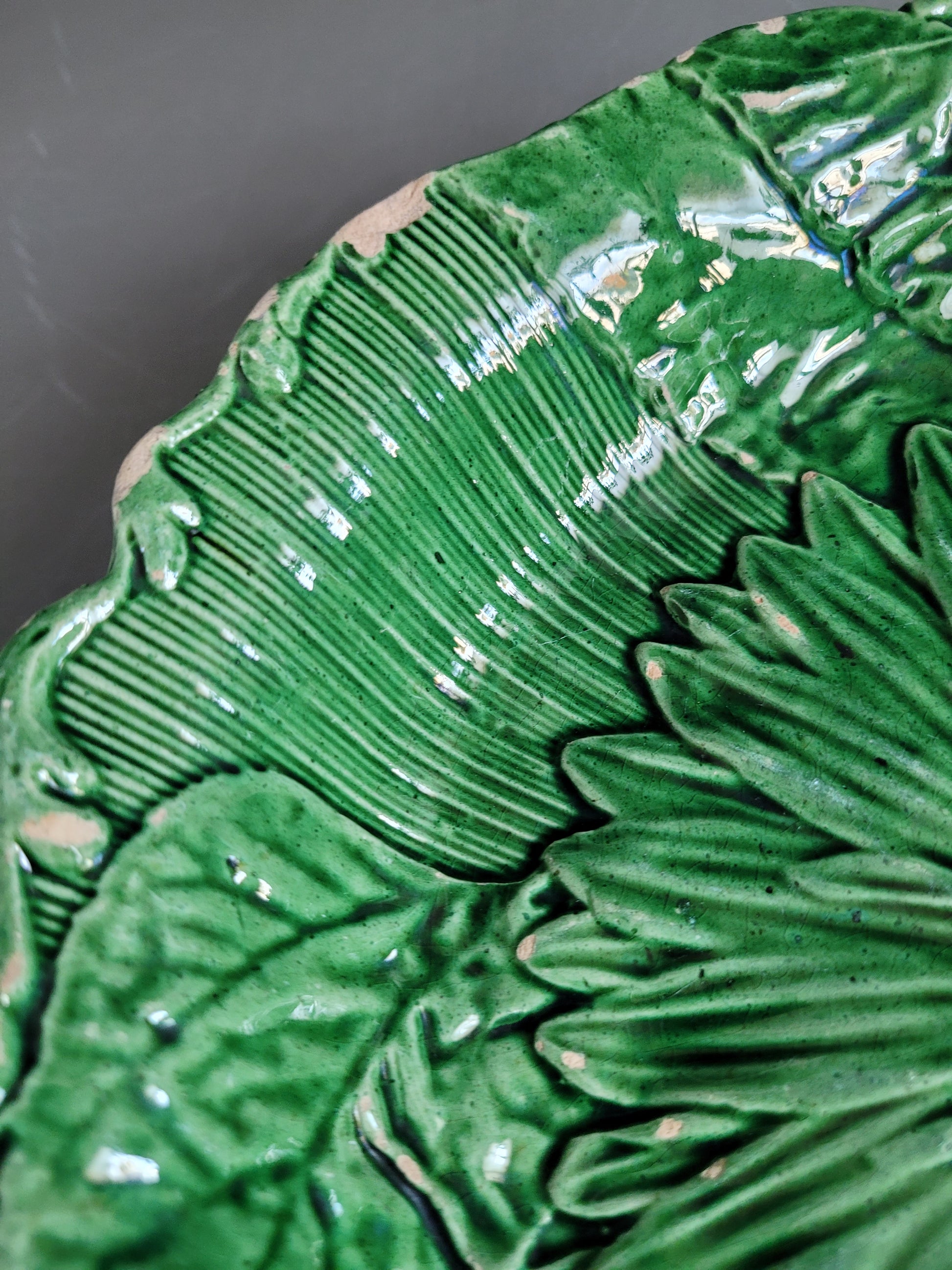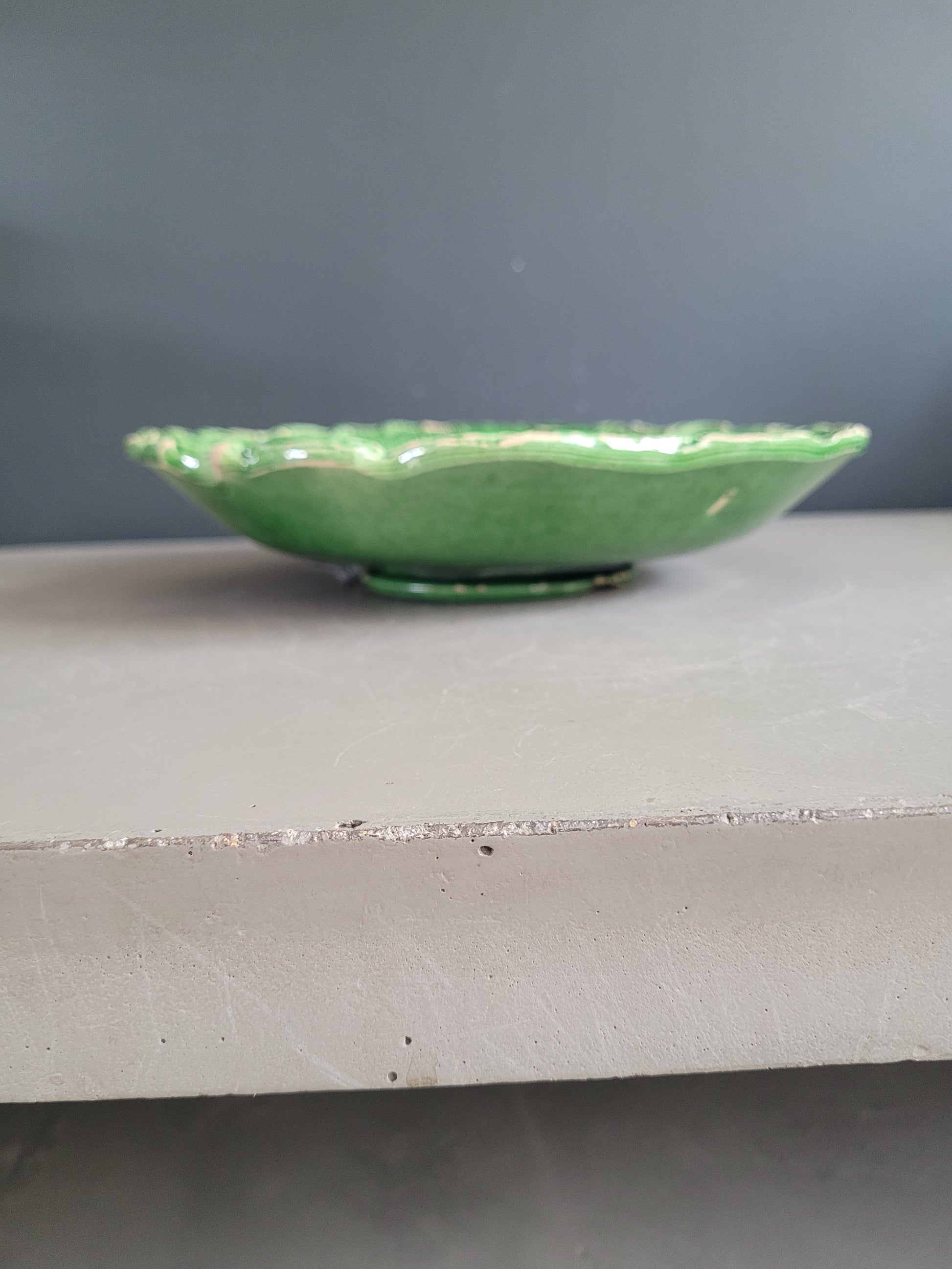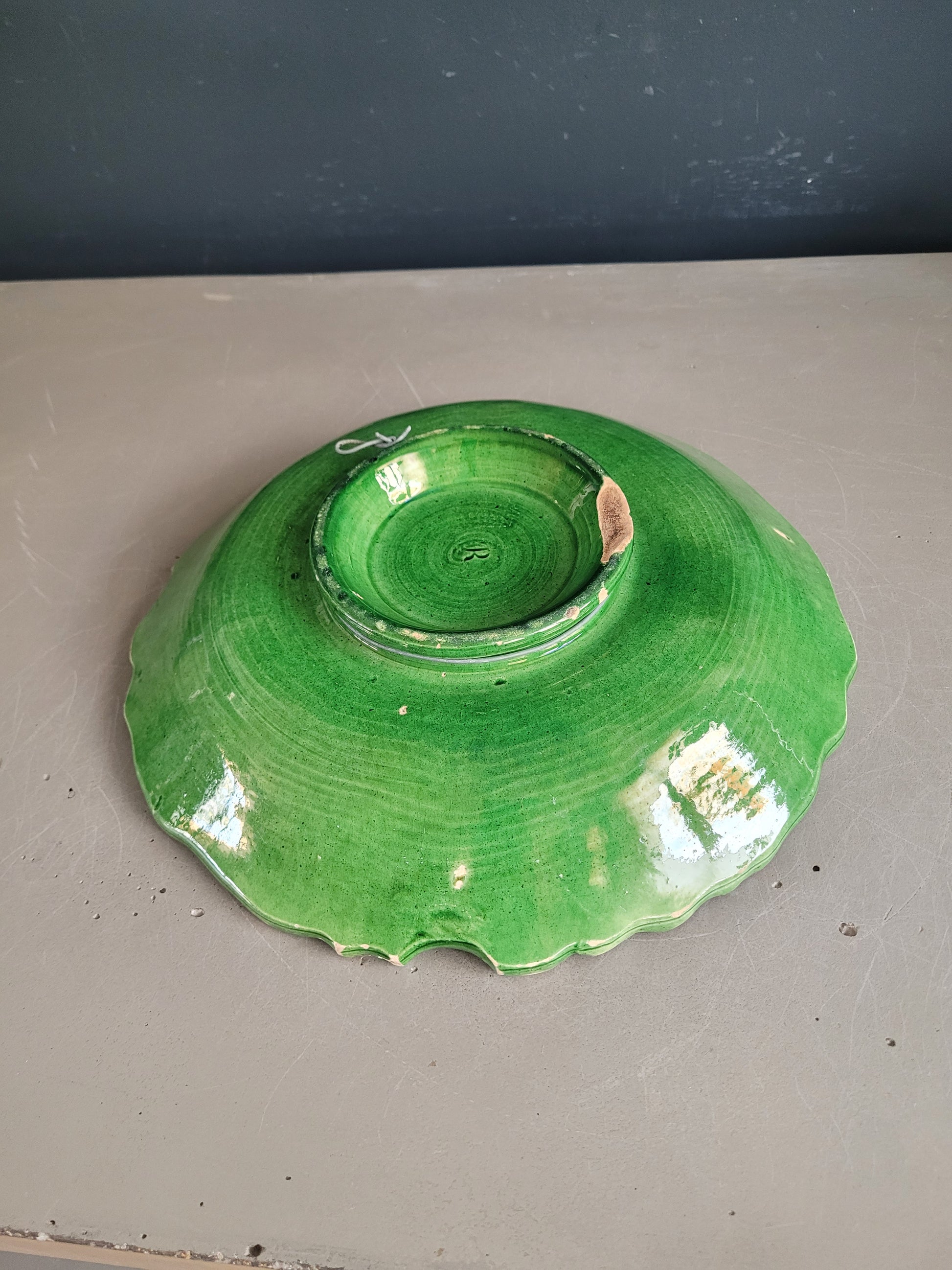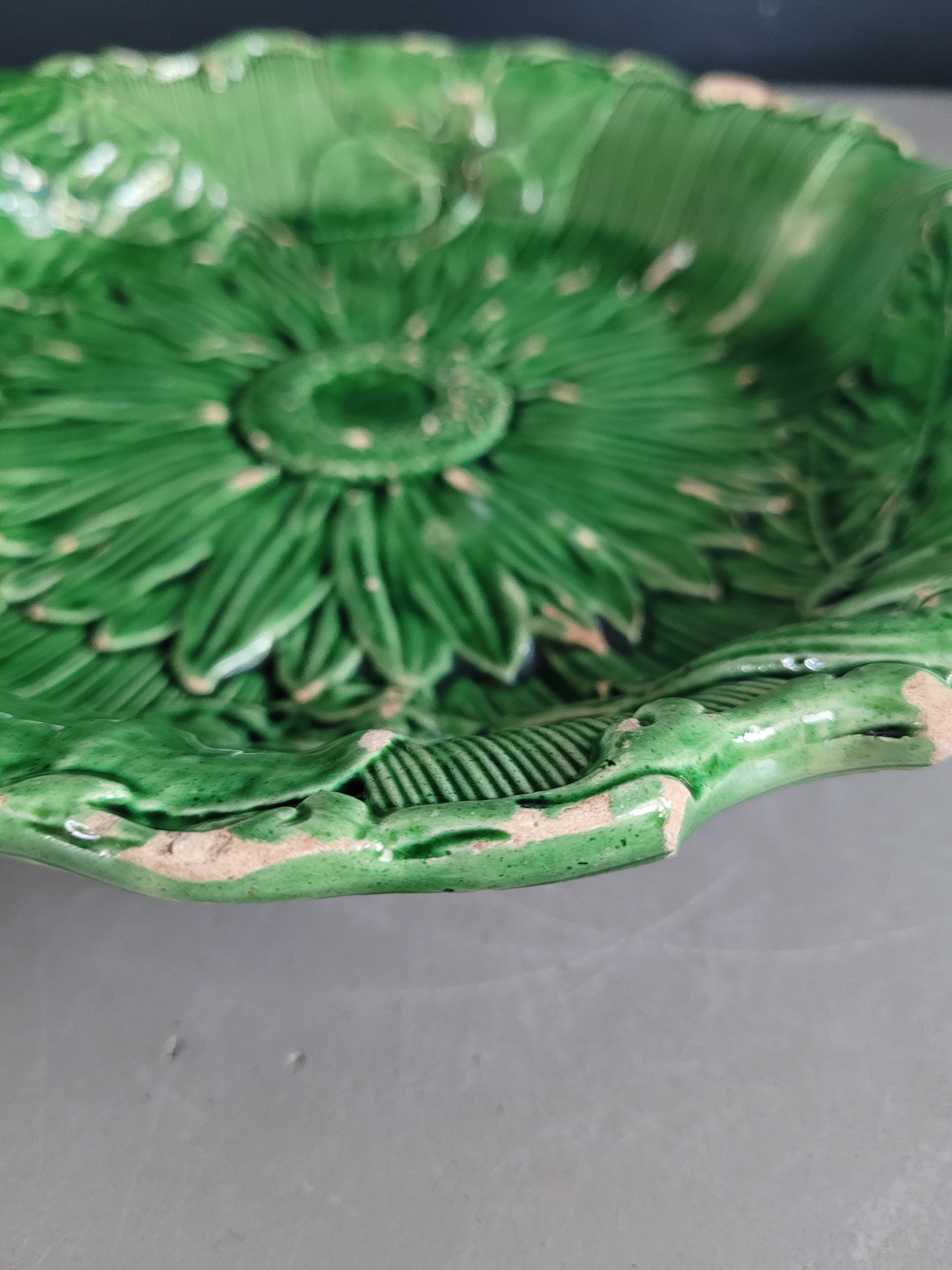 Sublime assiette montée ancienne en barbotine émaillée verte, ornée d'un grand motif de tournesol.