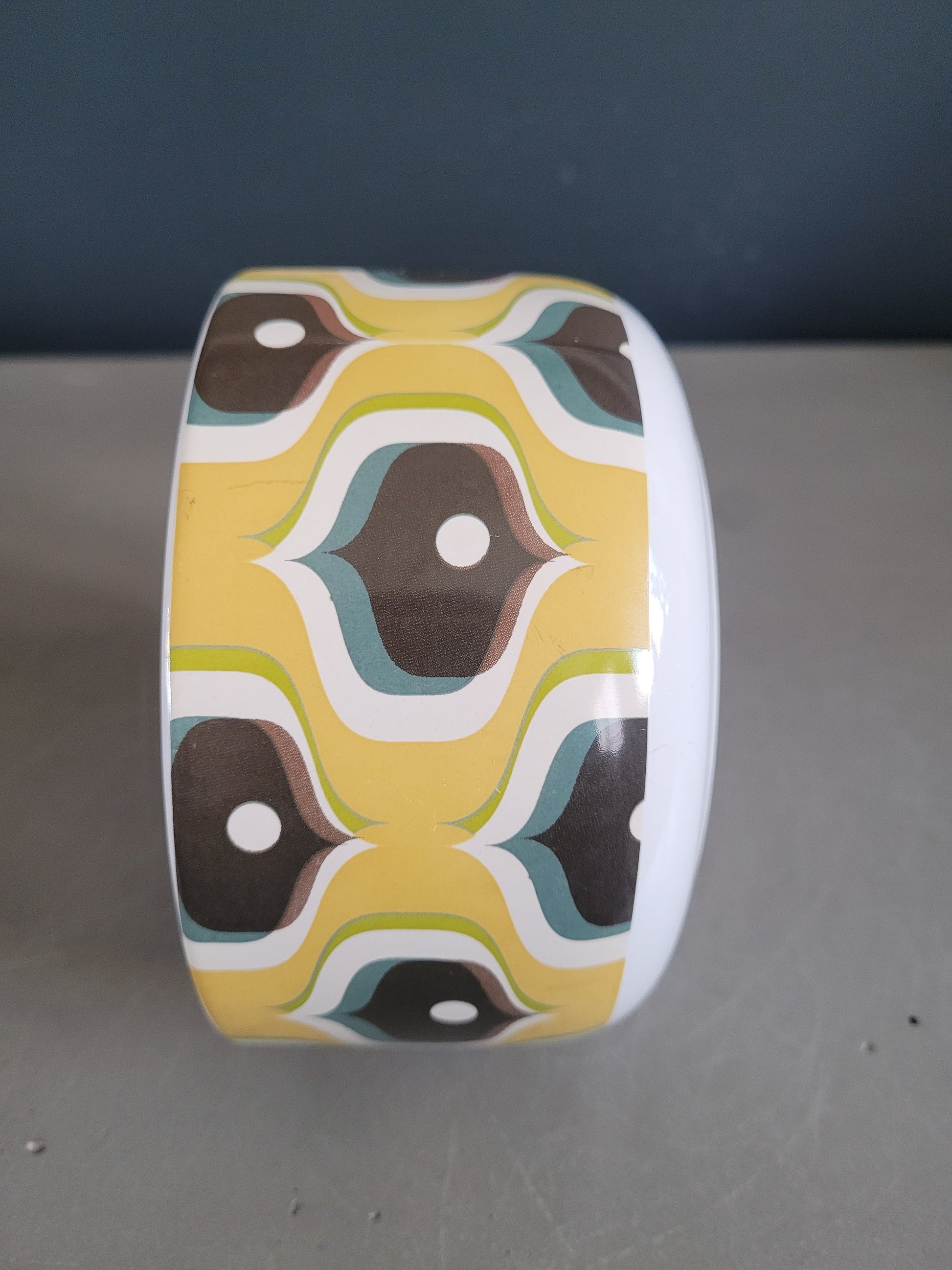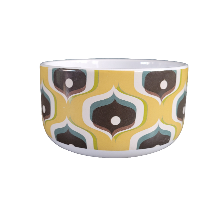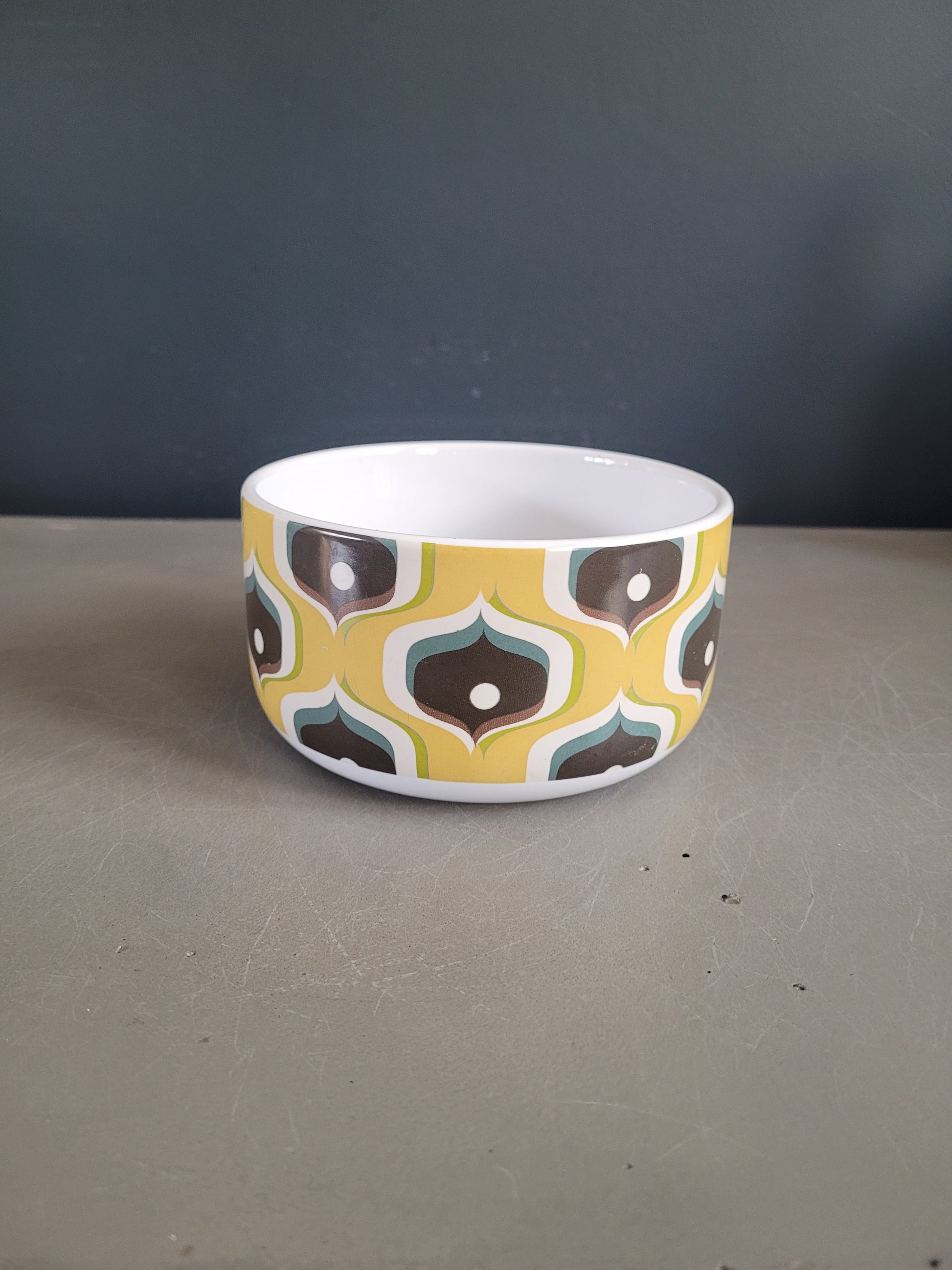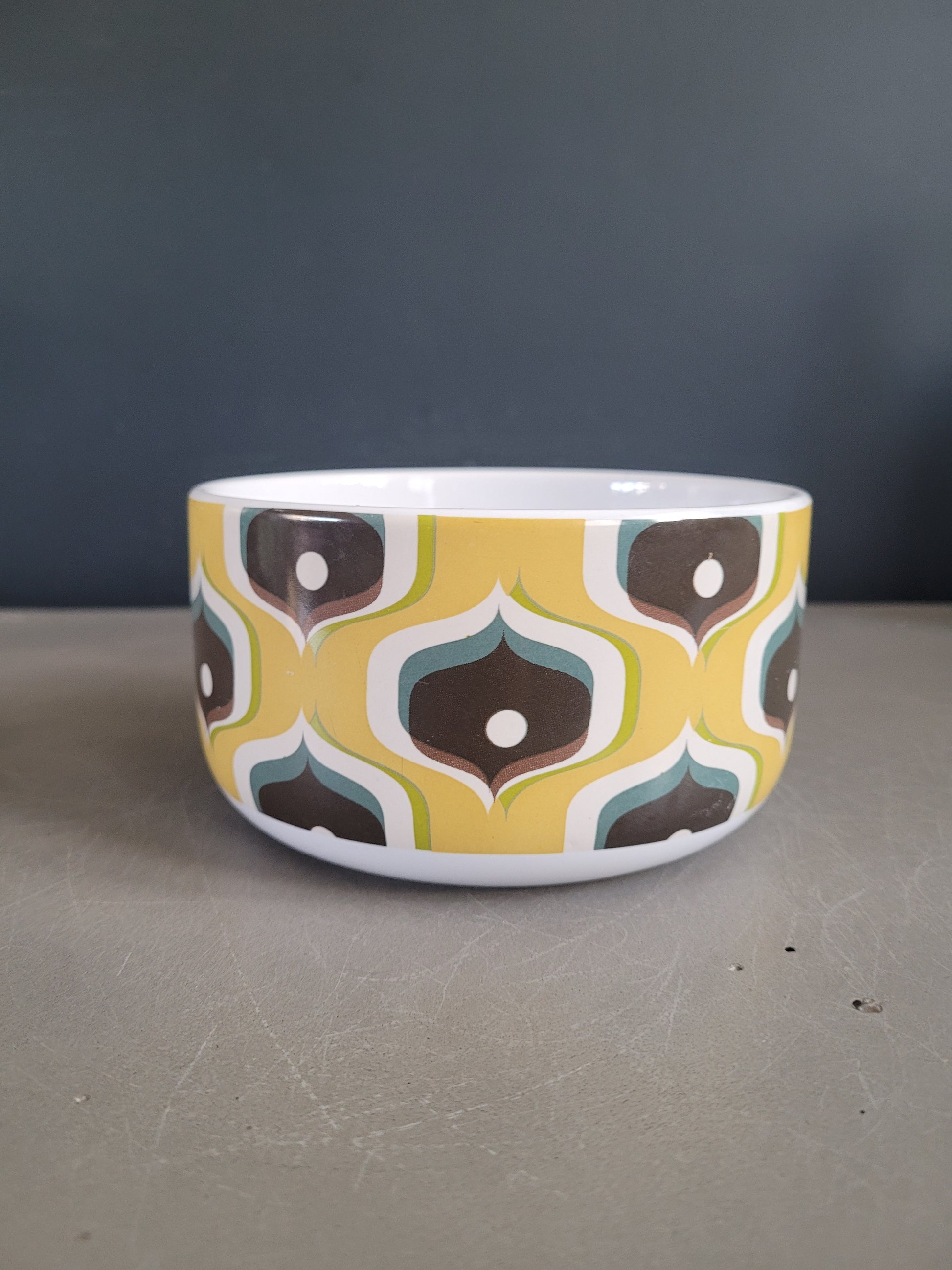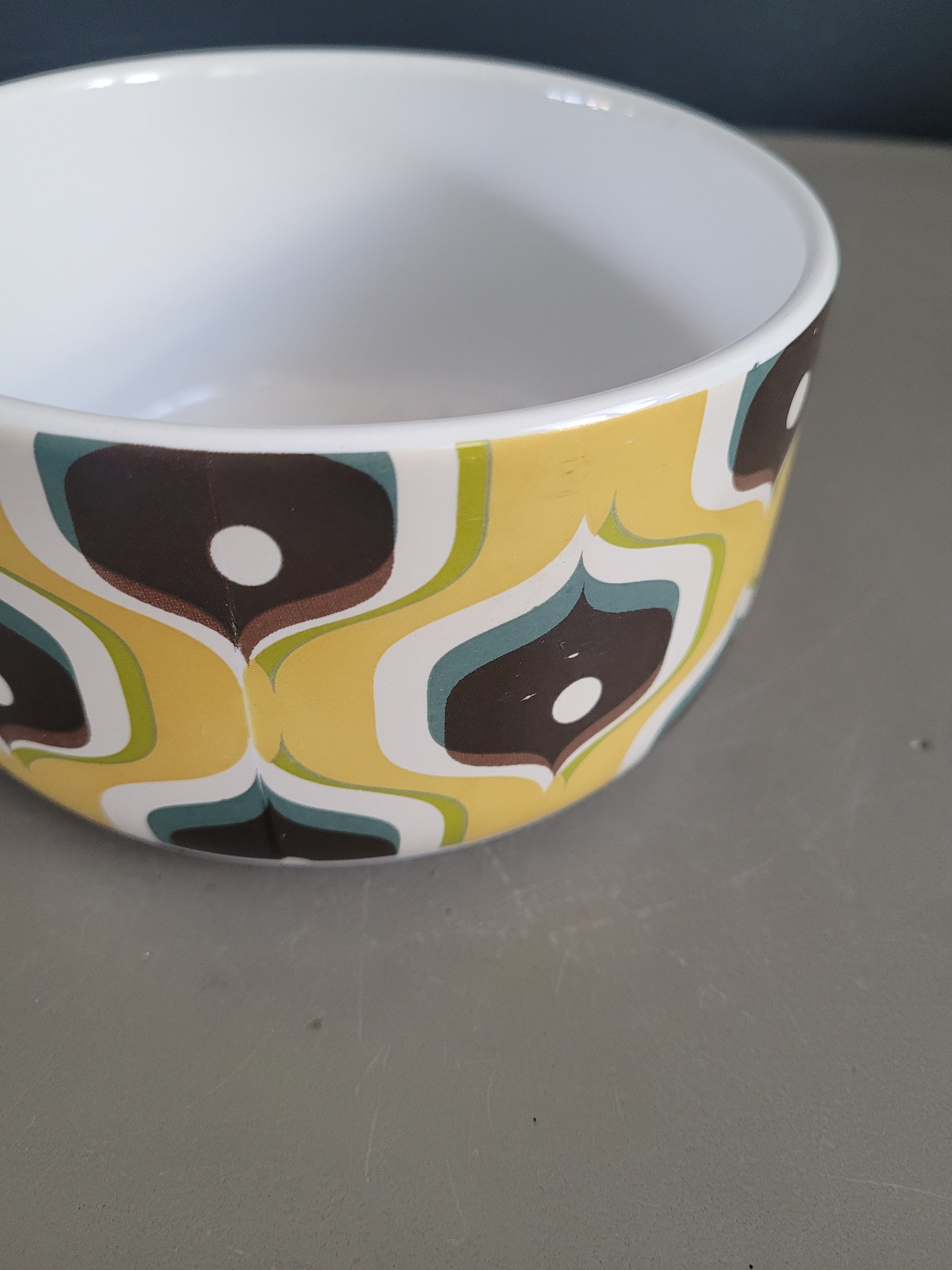 Bol à salade vintage, à magnifique motif 60's, dans les tons moutarde/kaki/pétrole.