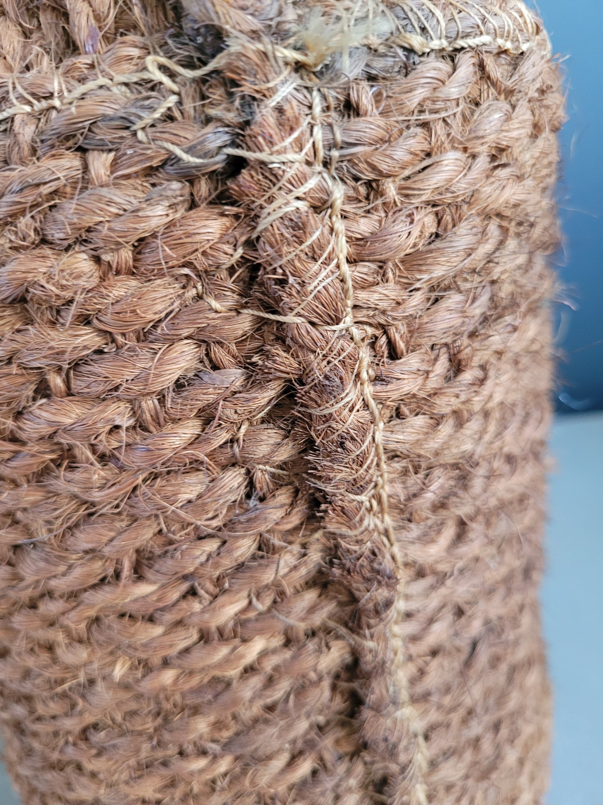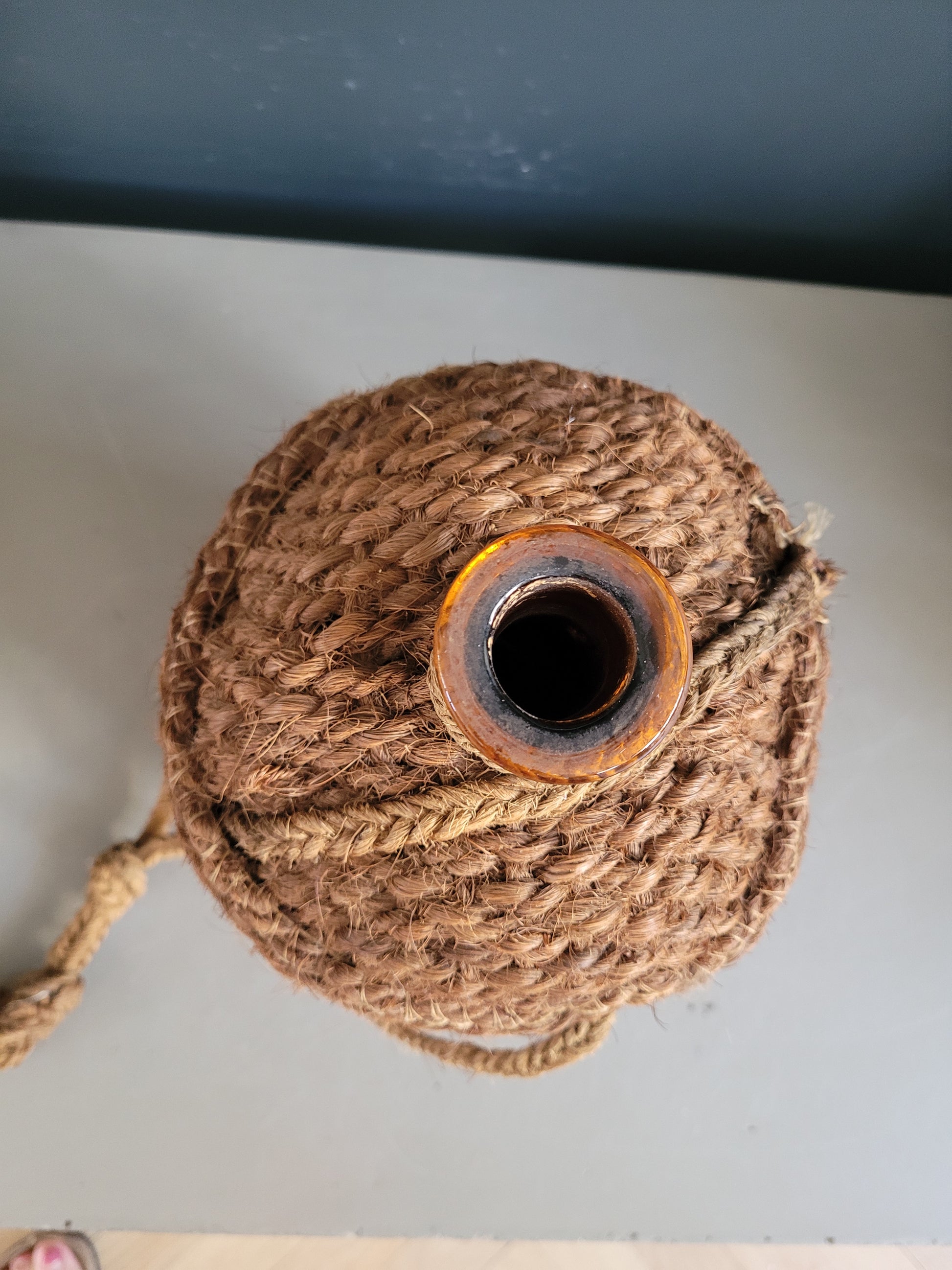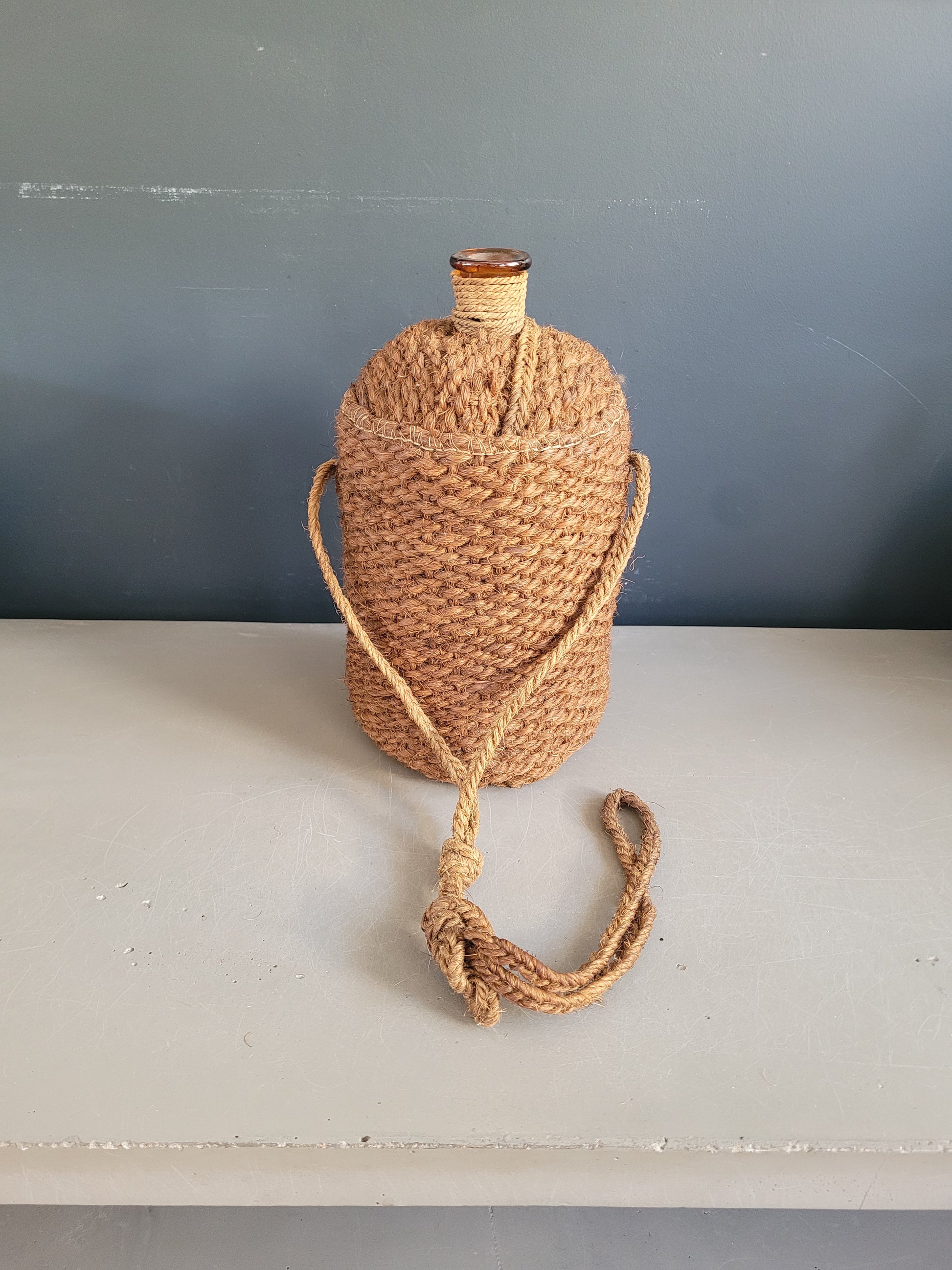 Très ancienne bouteille en verre soufflé ambré enveloppée dans un sac de corde de chanvre tissé avec sa bandoulière tressée, fin XIXème - début XXème.
