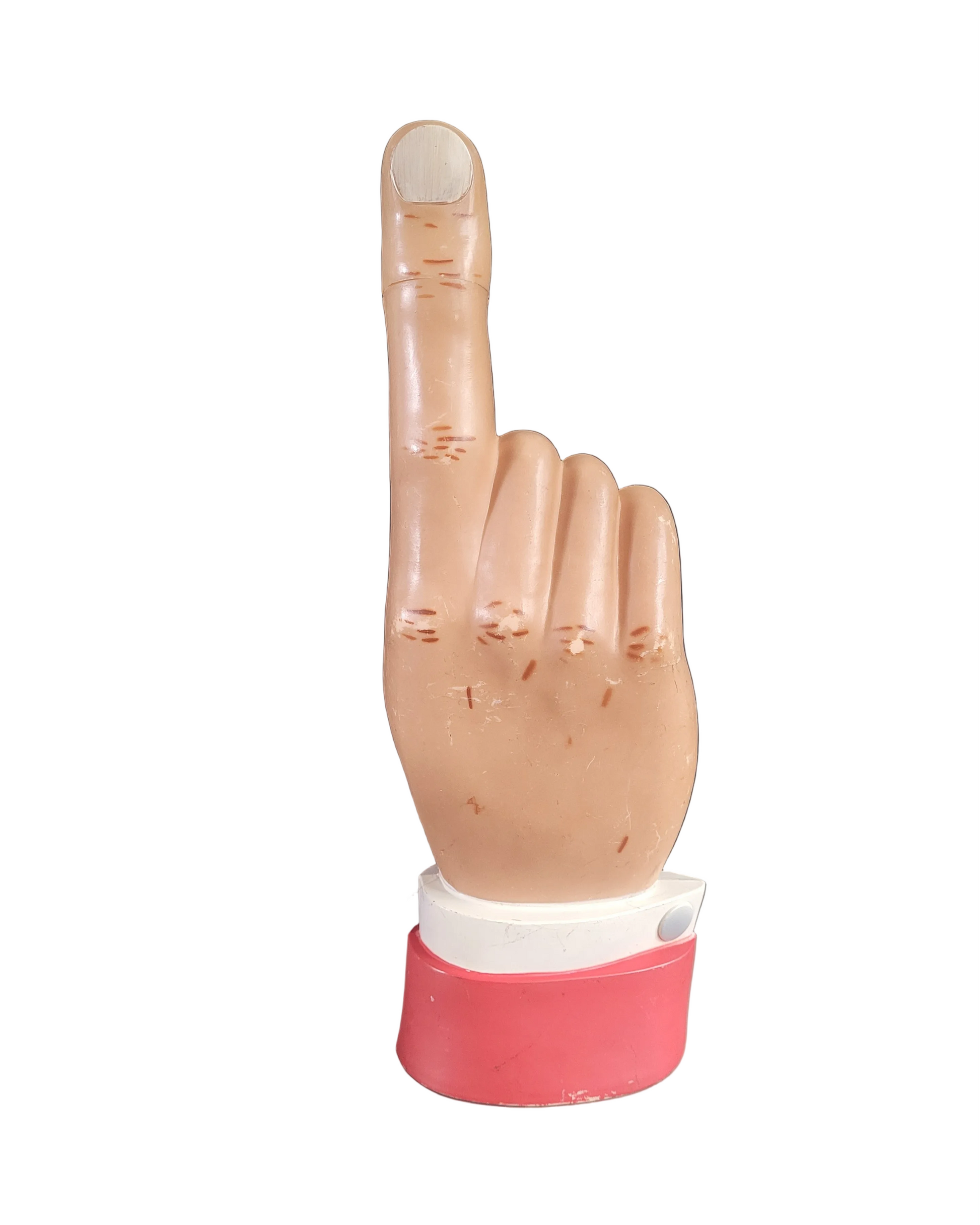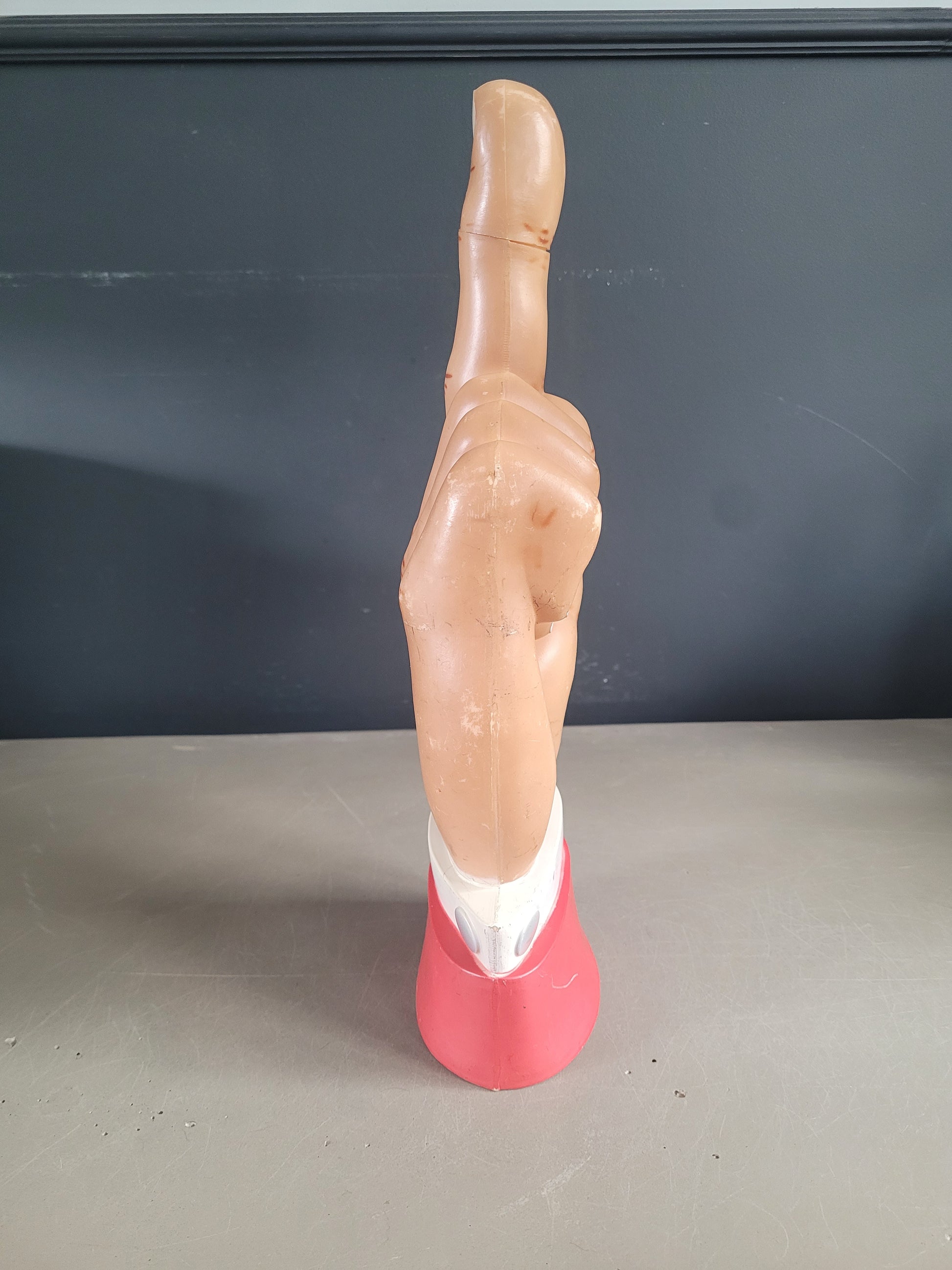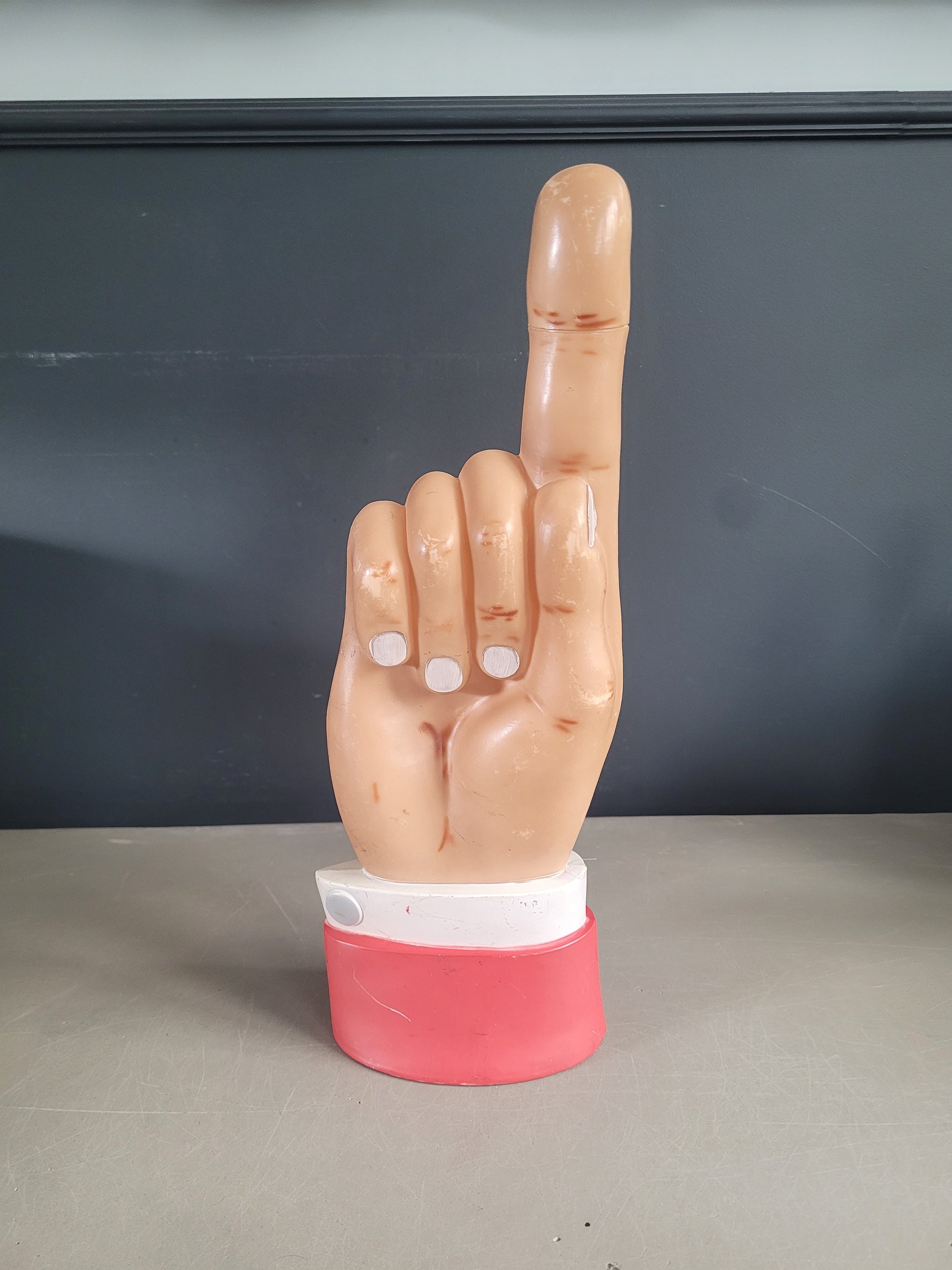 Elle peut aussi être suspendue, très légère, et utilisée comme indicateur de direction, c'est d'ailleurs l'usage qu'elle avait dans sa précédente vie, dans un pub où elle indiquait la direction des toilettes ! Il reste un fil nylon au niveau du poignet qui servait à la suspendre.