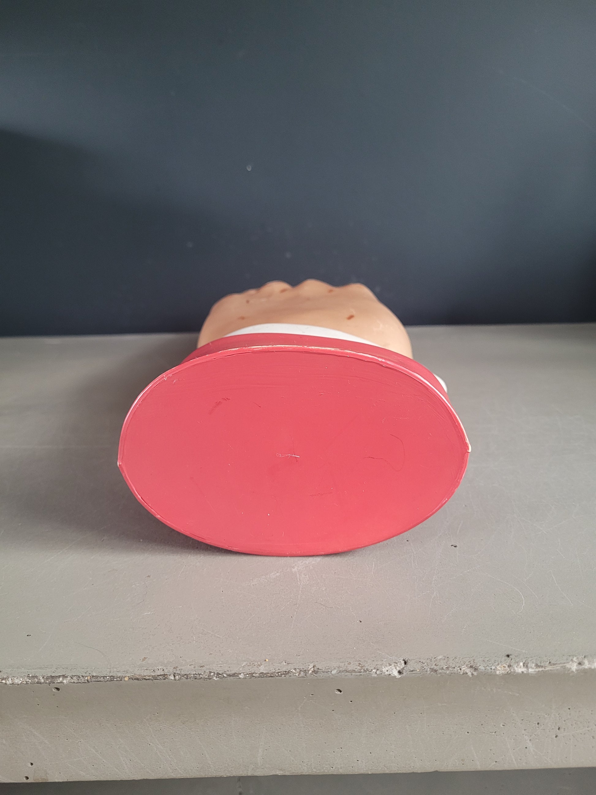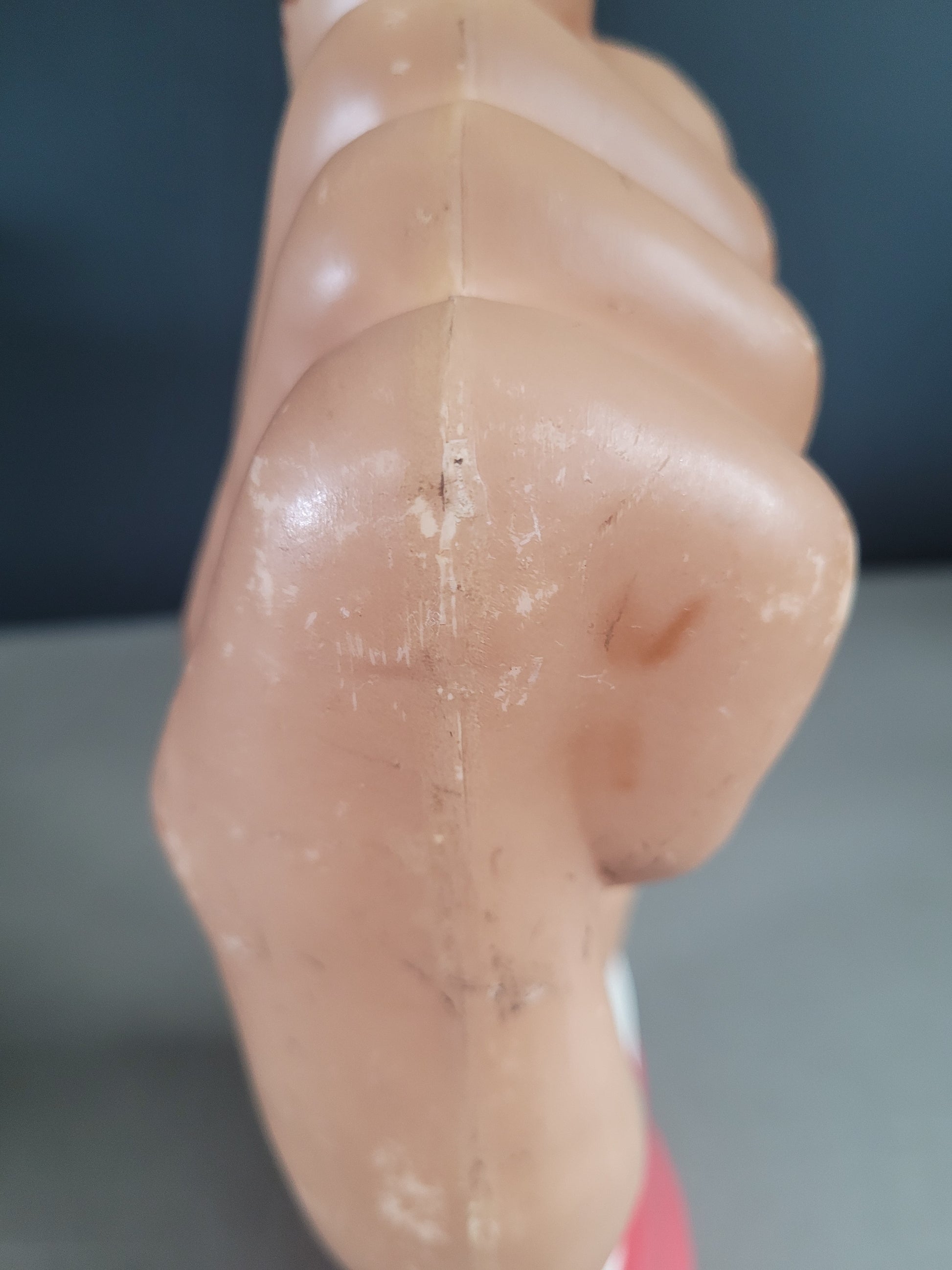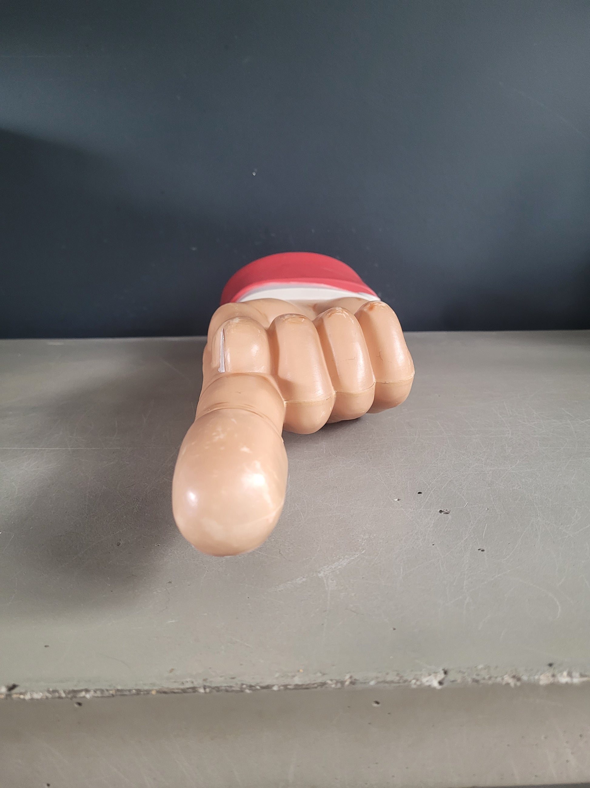 Elle peut aussi être suspendue, très légère, et utilisée comme indicateur de direction, c'est d'ailleurs l'usage qu'elle avait dans sa précédente vie, dans un pub où elle indiquait la direction des toilettes ! Il reste un fil nylon au niveau du poignet qui servait à la suspendre.