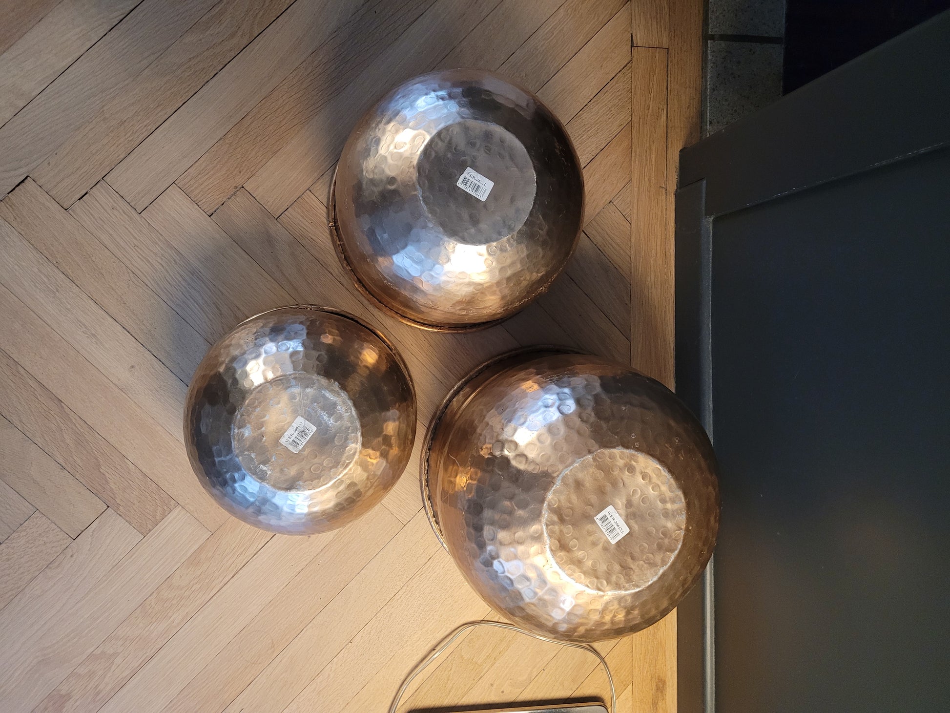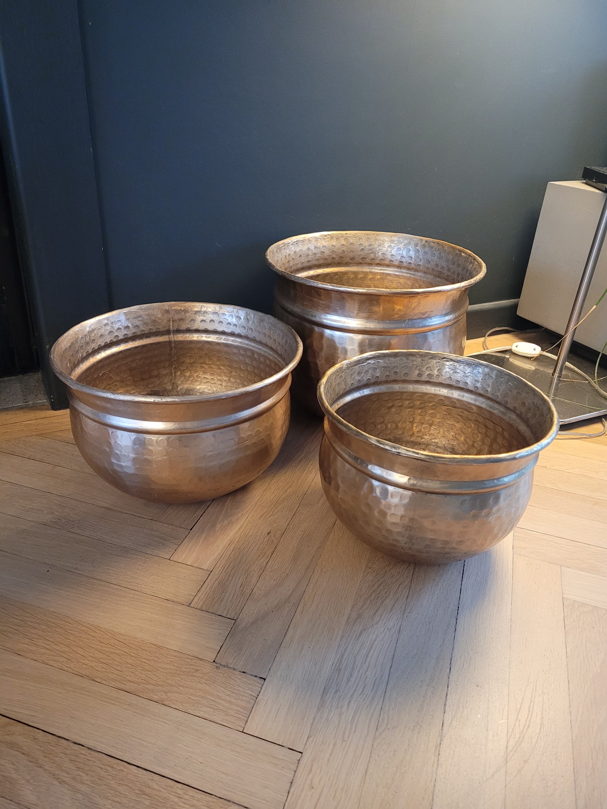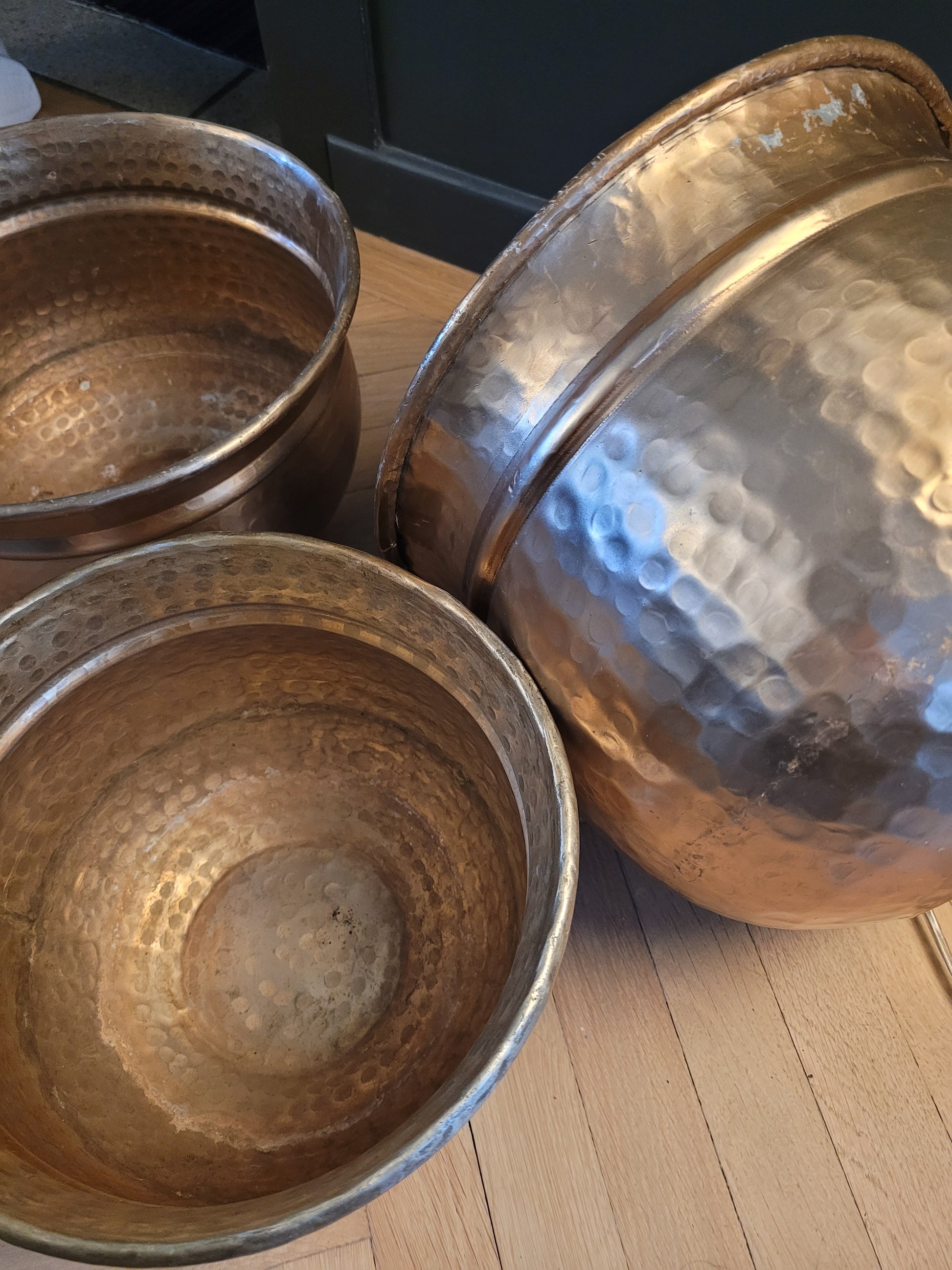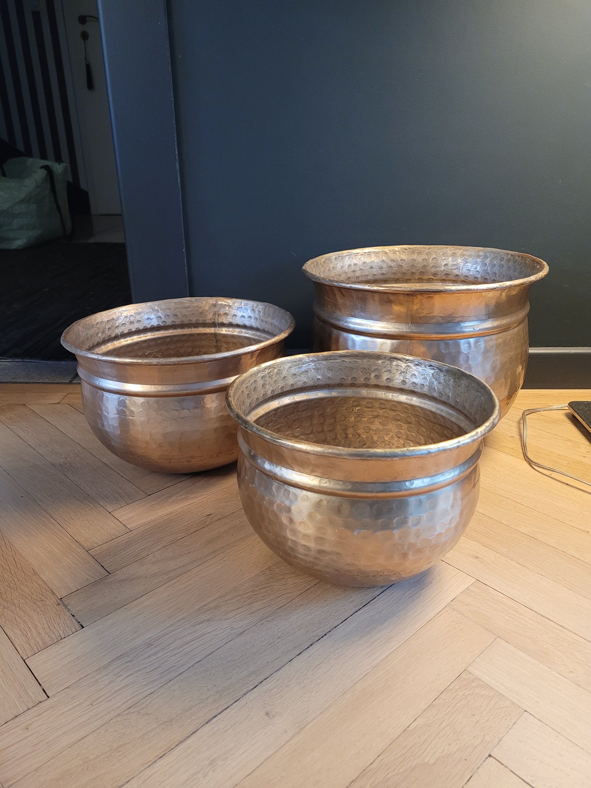 Superbe lot de 3 cache-pots gigogne en métal doré martelé.
