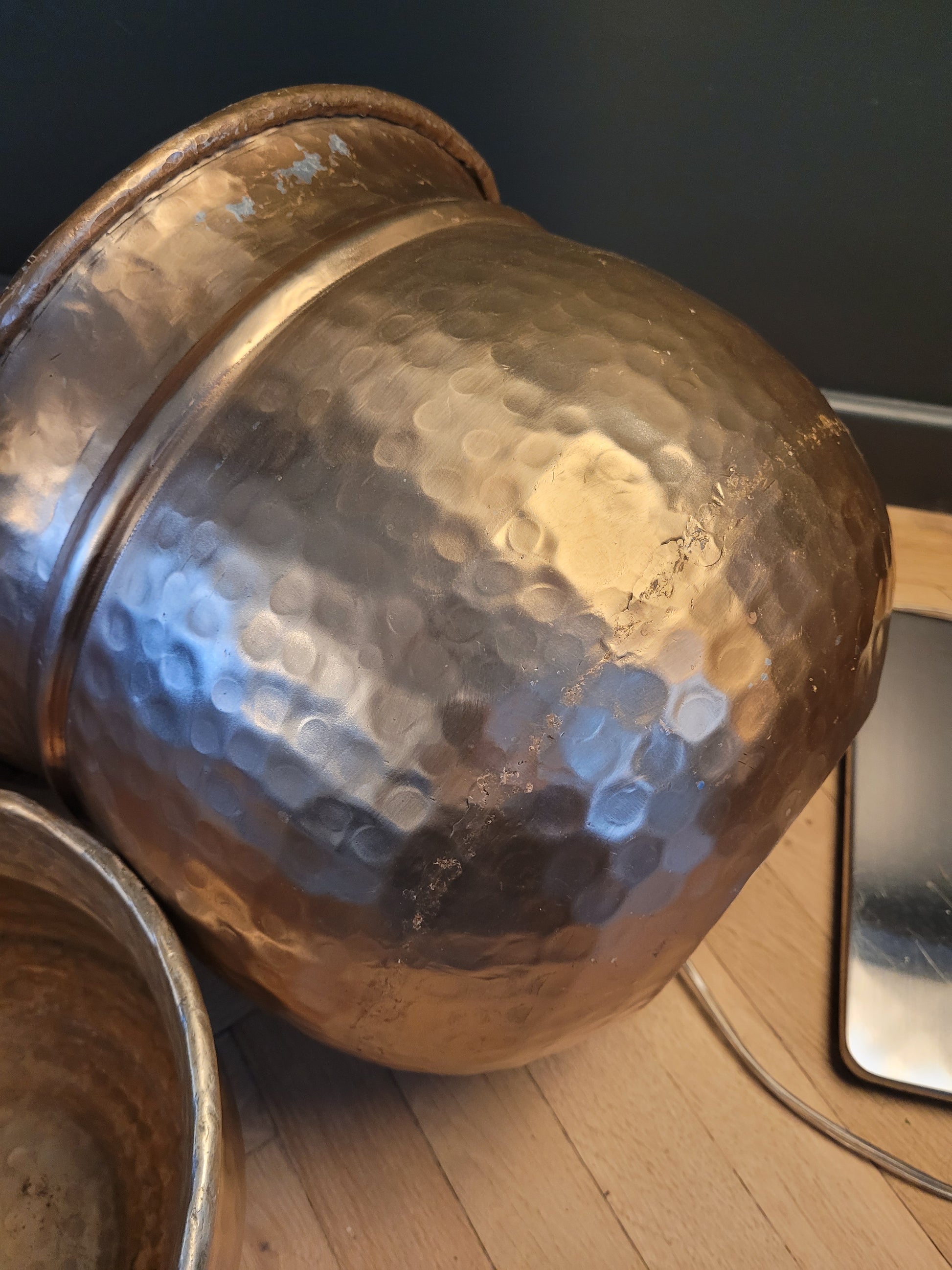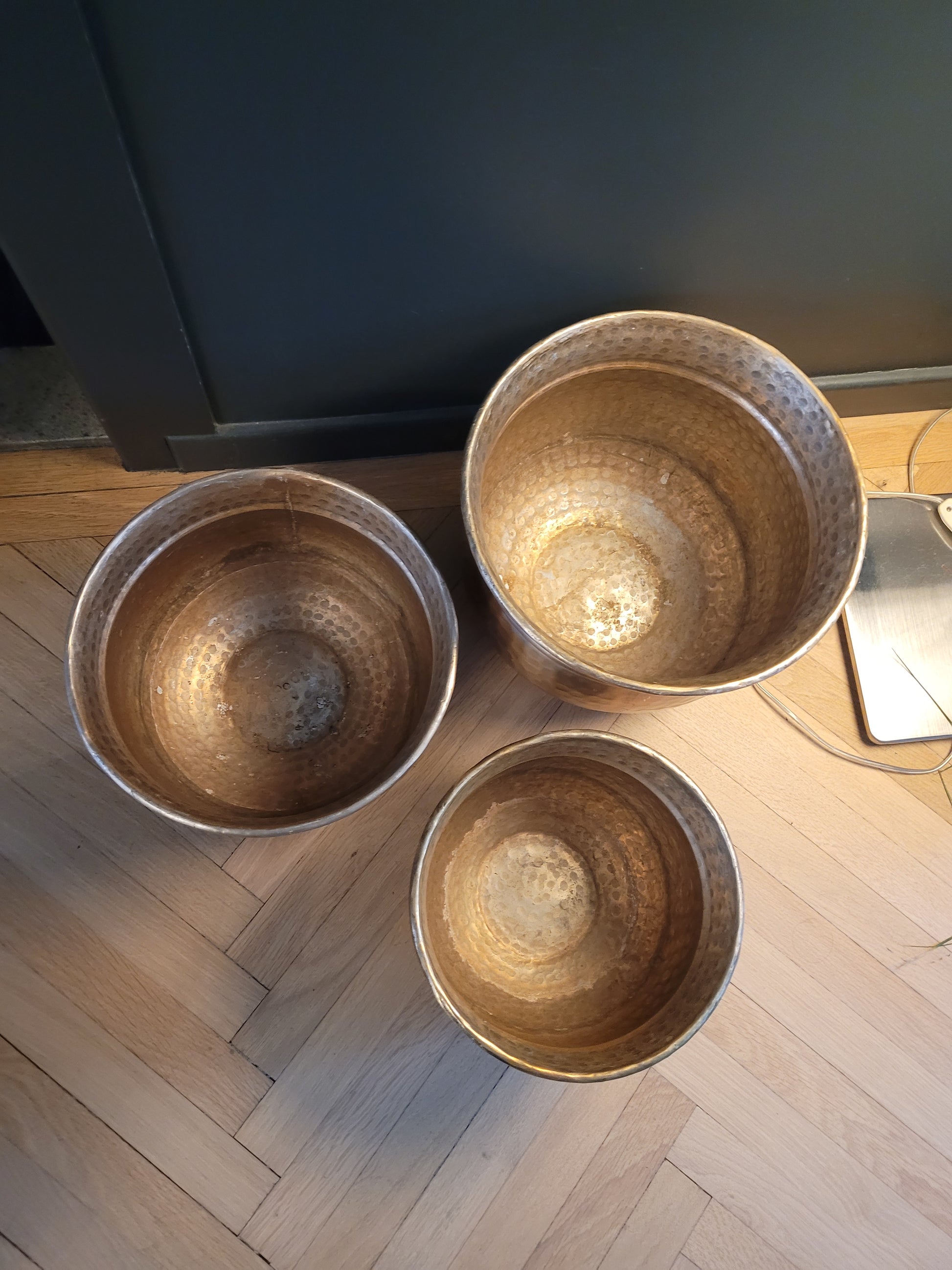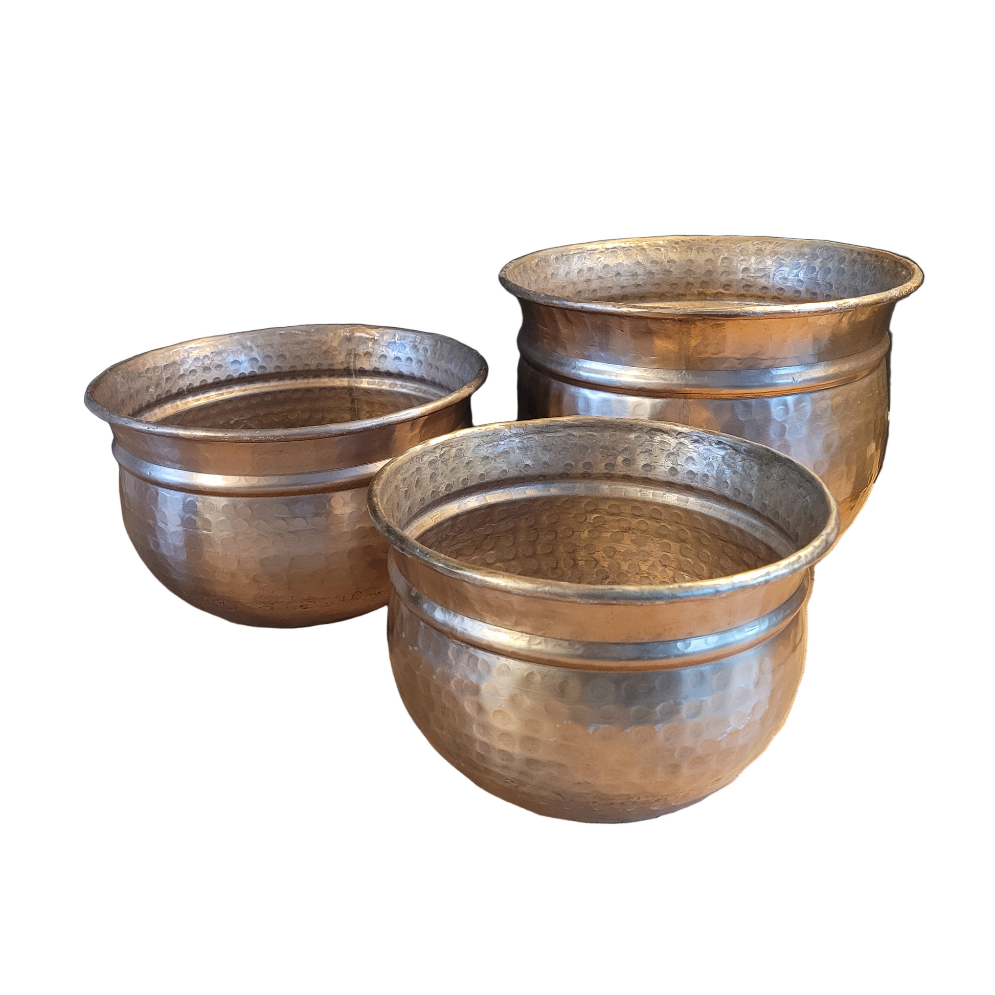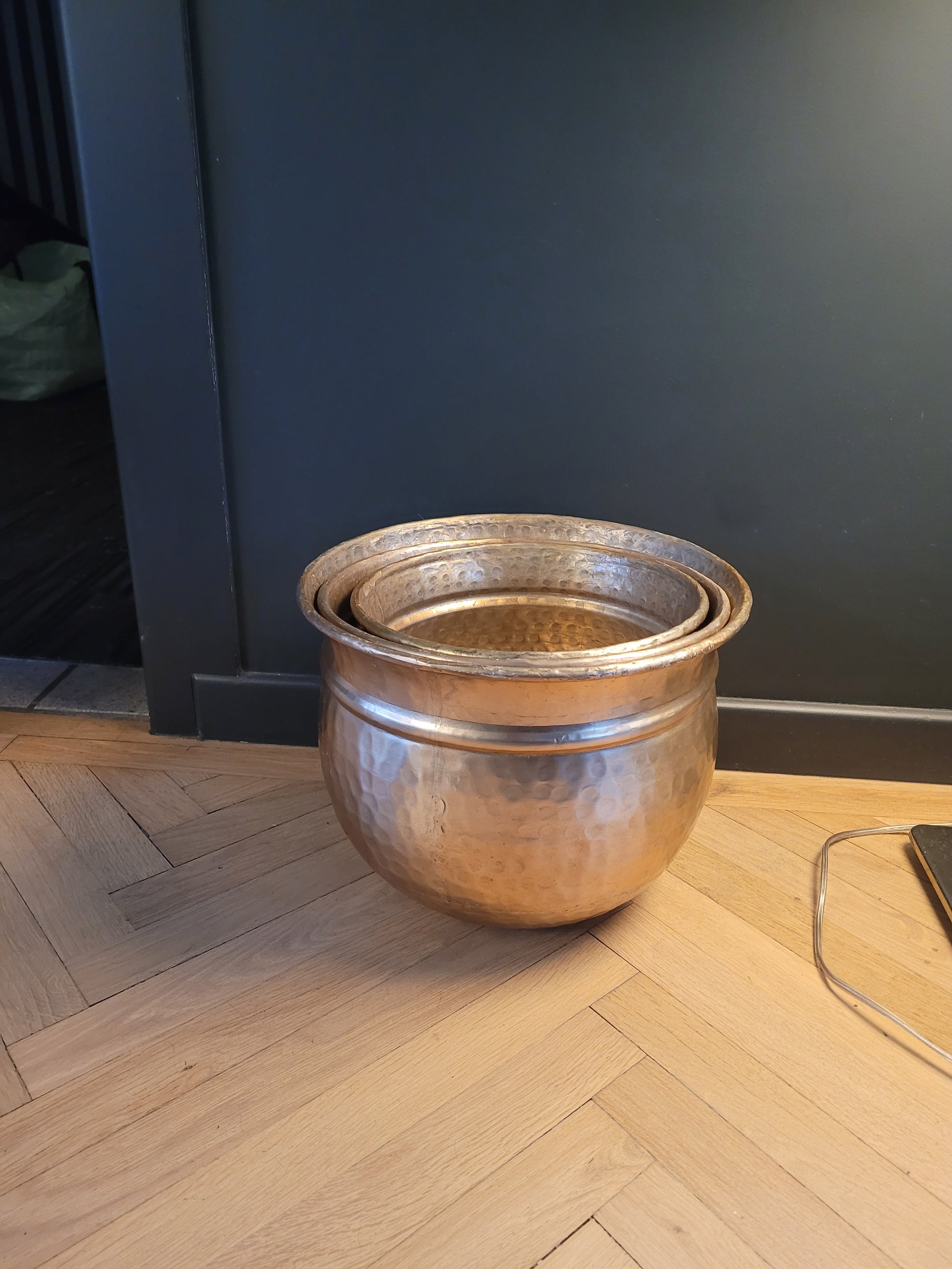 Superbe lot de 3 cache-pots gigogne en métal doré martelé.