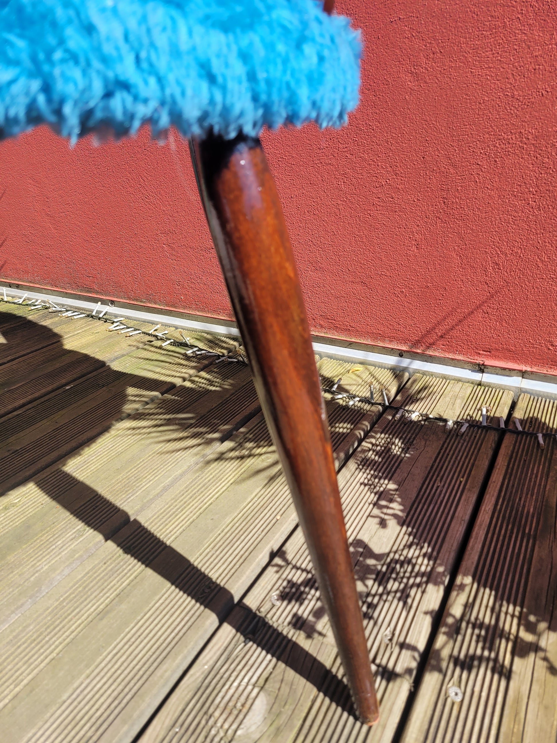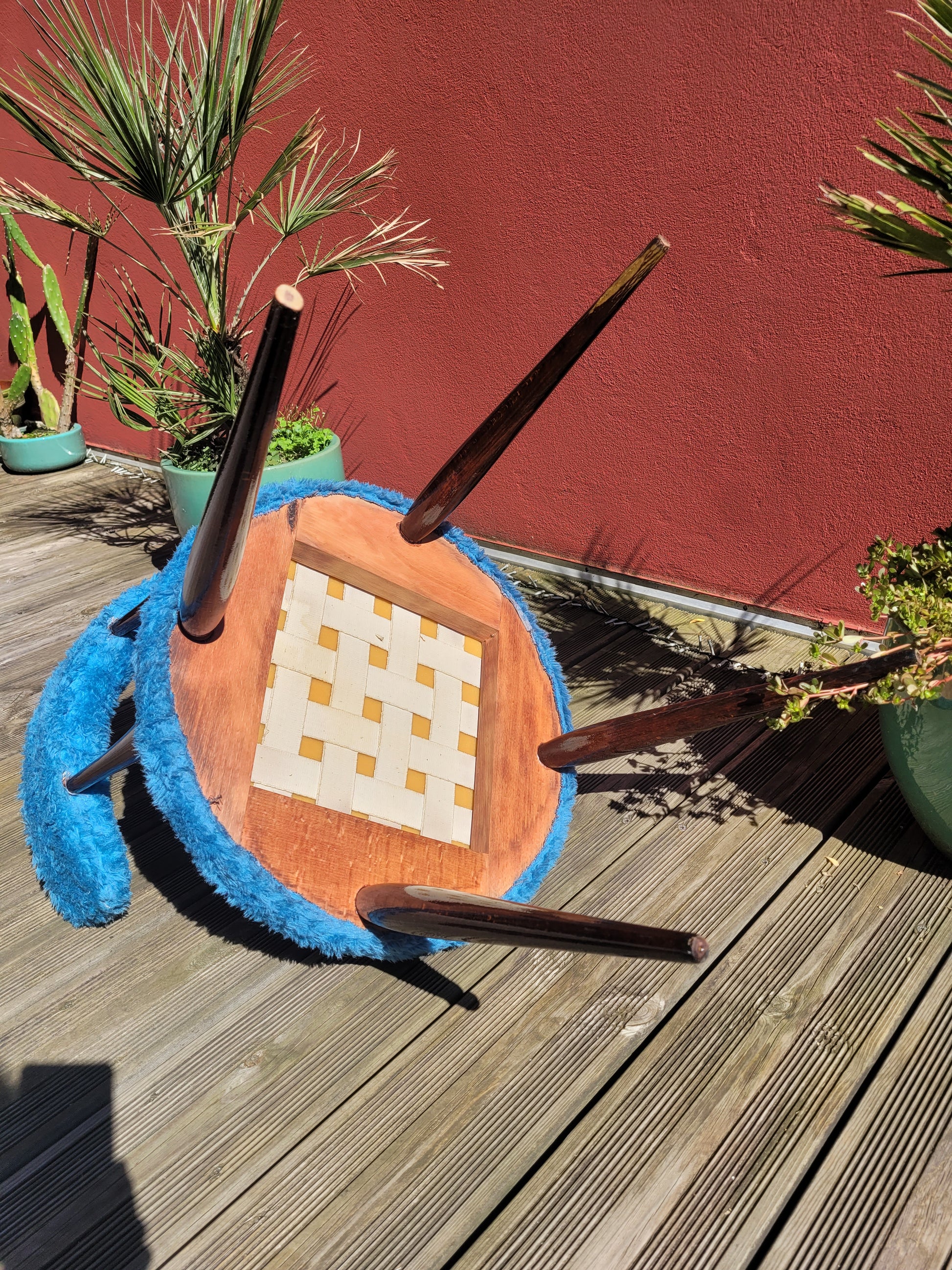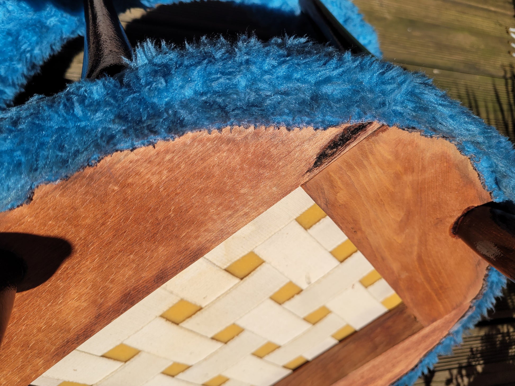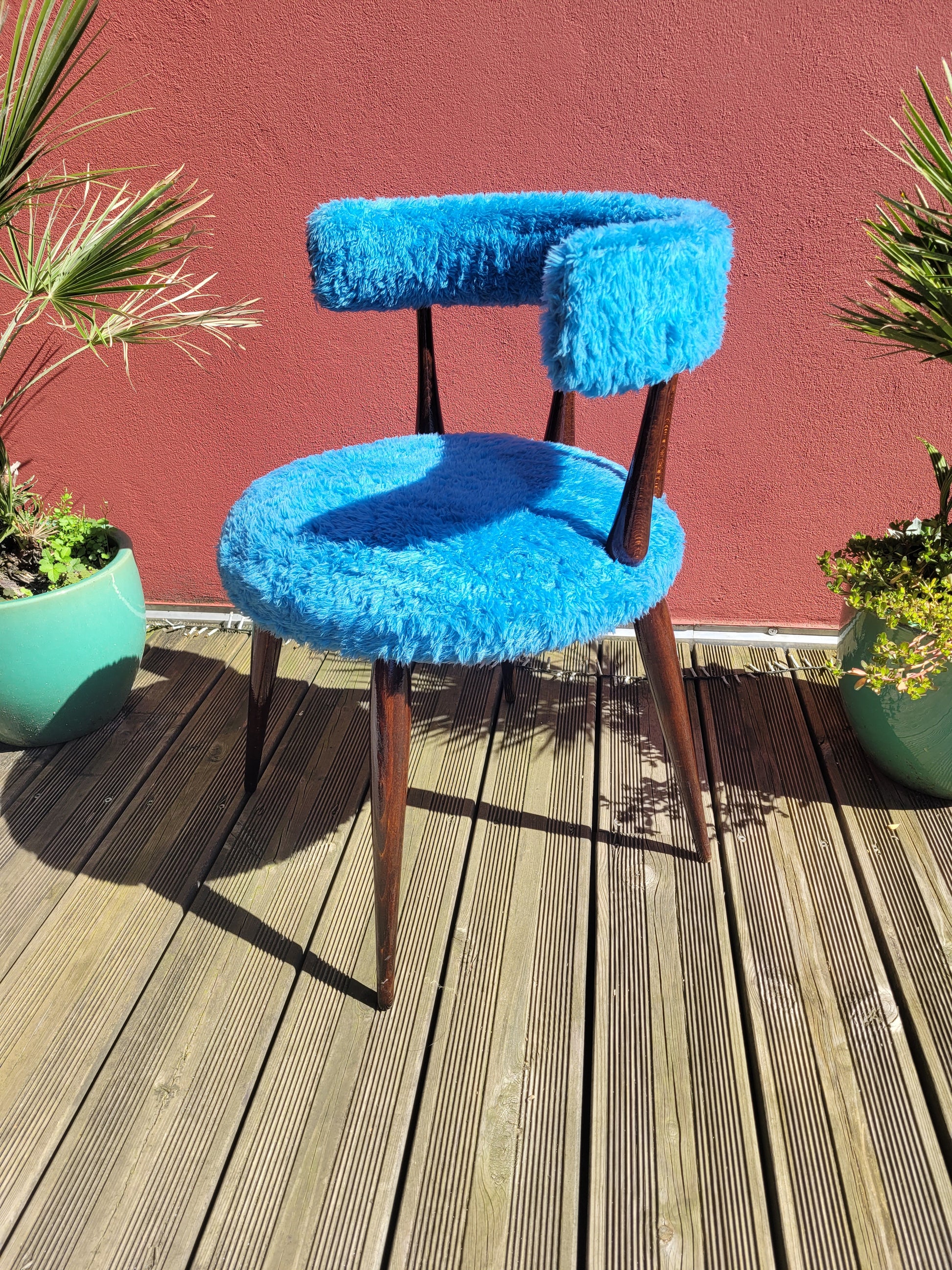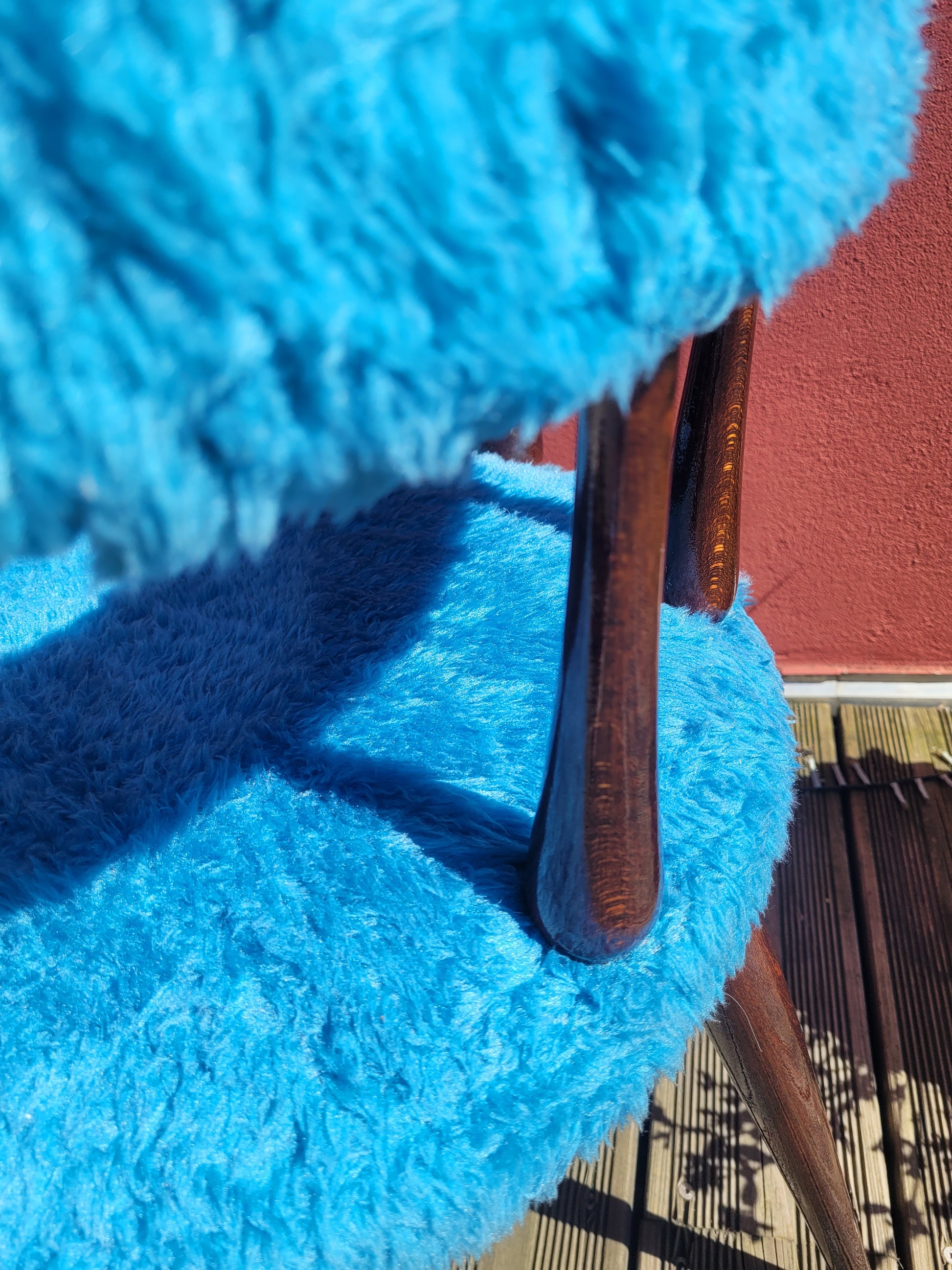 Coup de cœur assuré pour cette chaise des années 60 en moumoute bleue et bois vernis teinté couleur acajou.