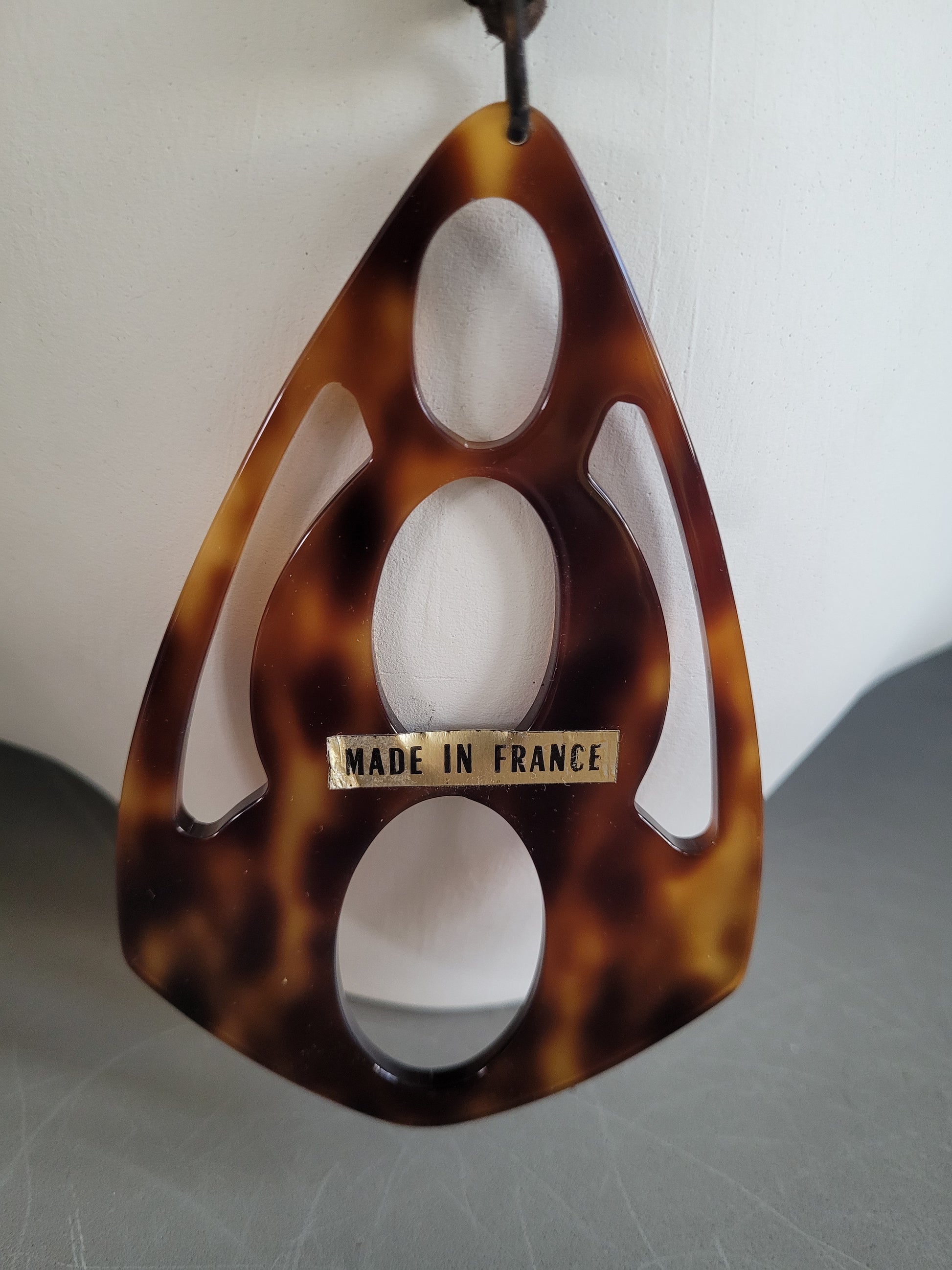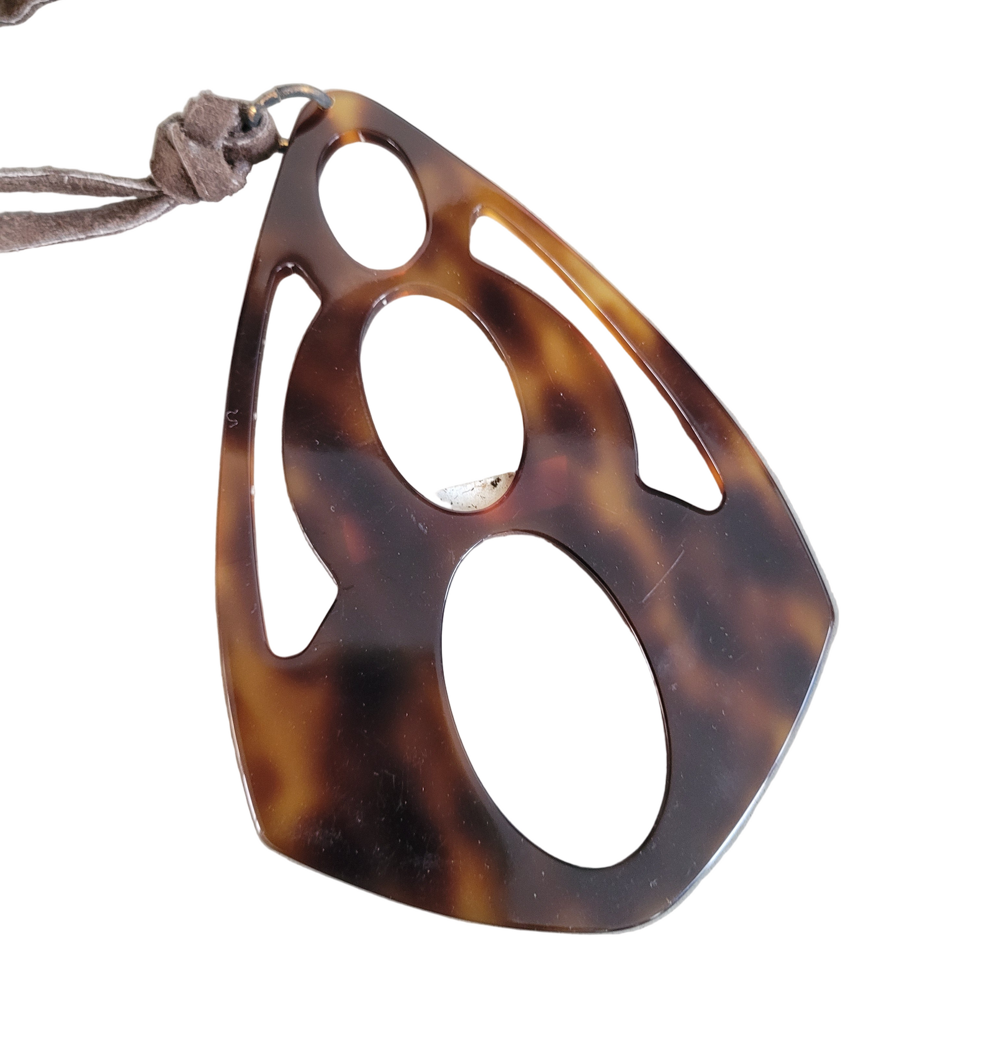 Superbe collier avec grand pendentif ajouré en acétate marron/feu façon écailles et lien en cuir marron.