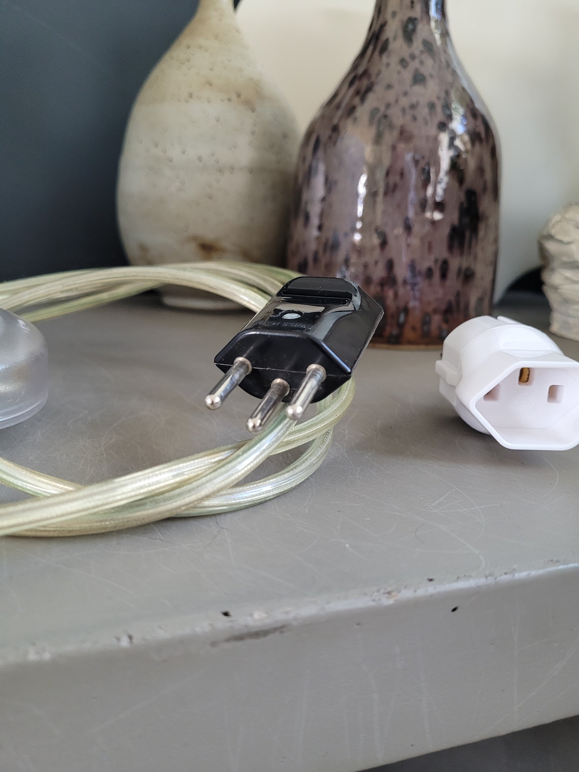 L'éclairage fonctionne au moyen d'un interrupteur à pied sur un fil de 2m avec une prise suisse (fonctionne très bien avec un adaptateur, voir photo)