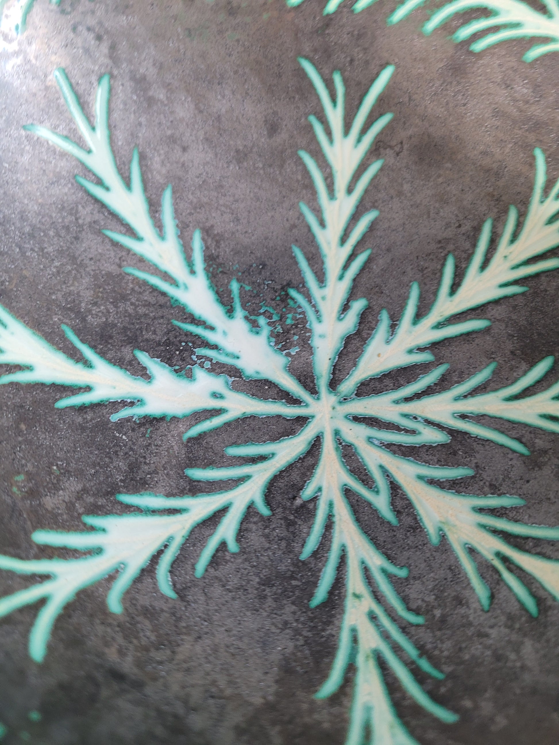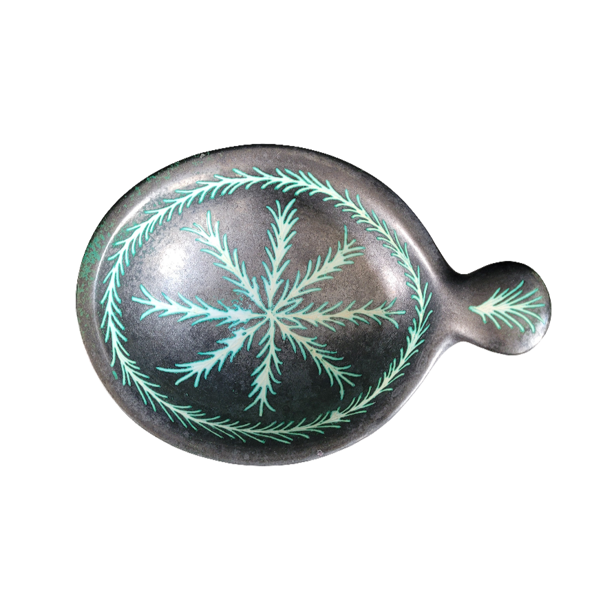 Le motif évoque des brins de romarin et laisse apparaître, de part la technique du gravage, les différentes épaisseurs d'email, blanc, vert et enfin noir métallisé. C'est cette technique qui donne le rendu si particulier et la profondeur au décor.