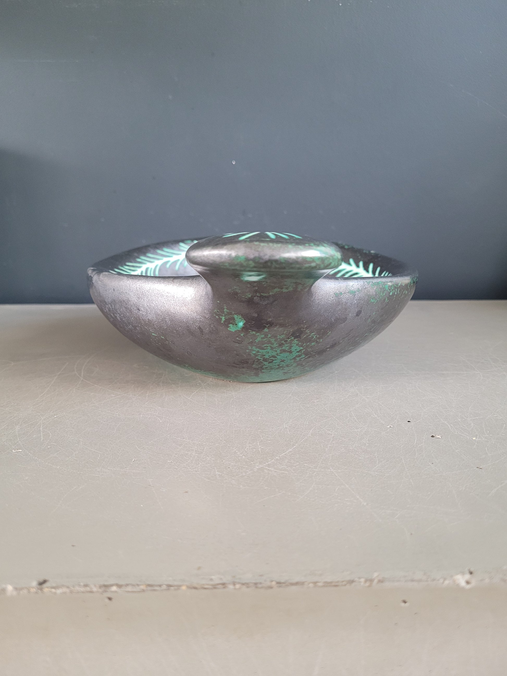 La coupelle est lourde et épaisse, avec des formes brutes. C'est une pièce d'exception qui capte la lumière grâce à son fini satiné et au côté métallisé de l'email.