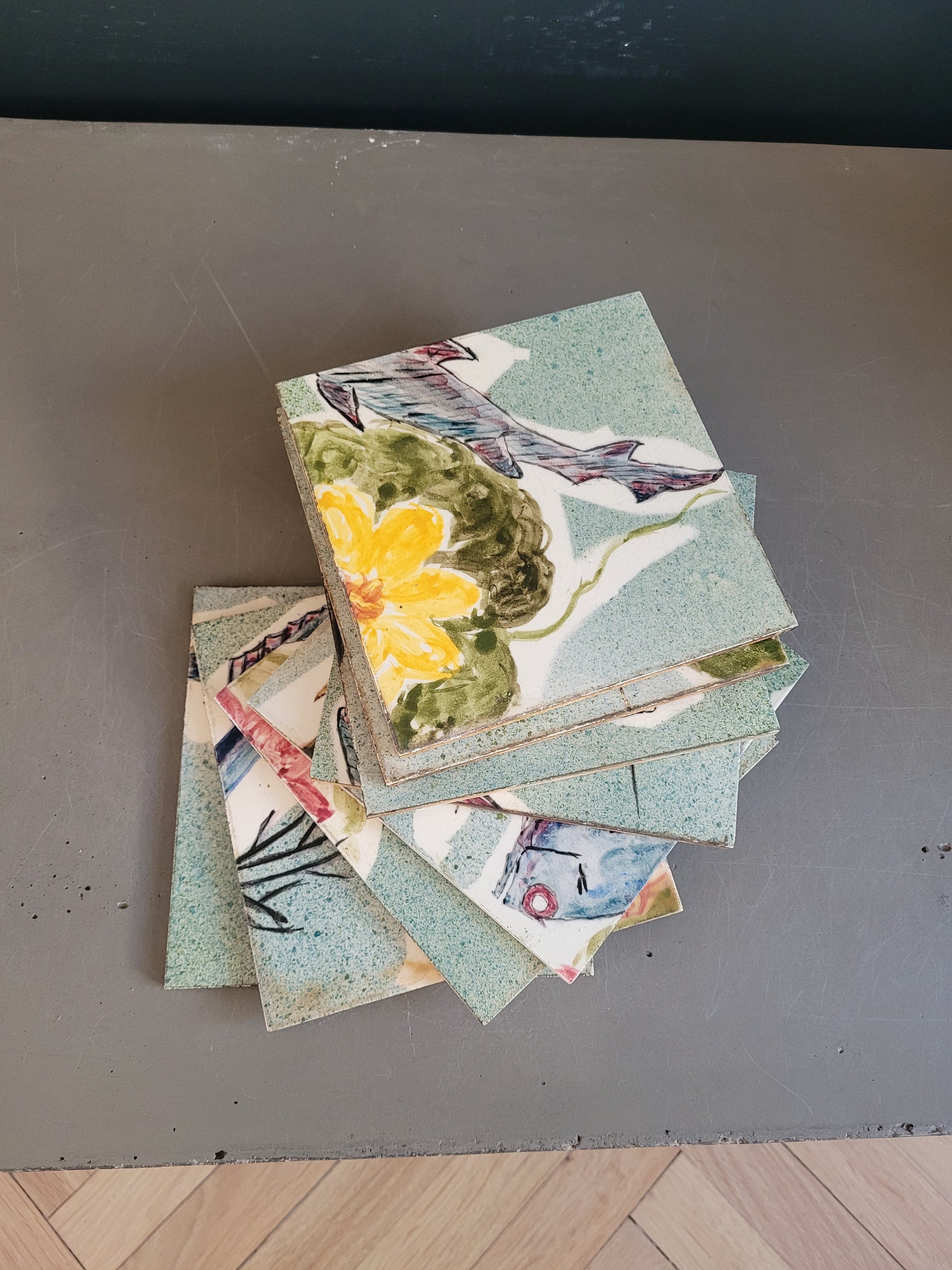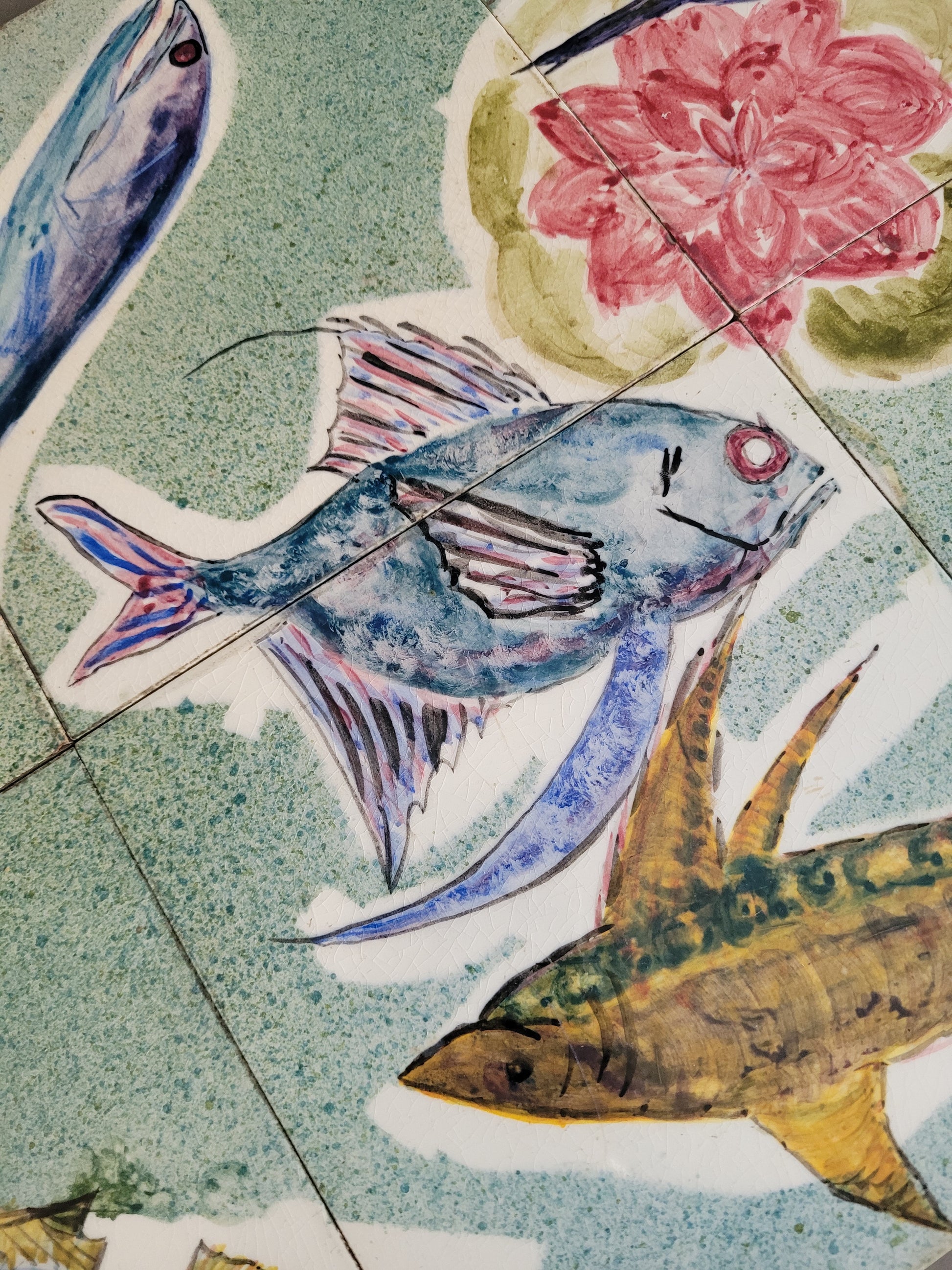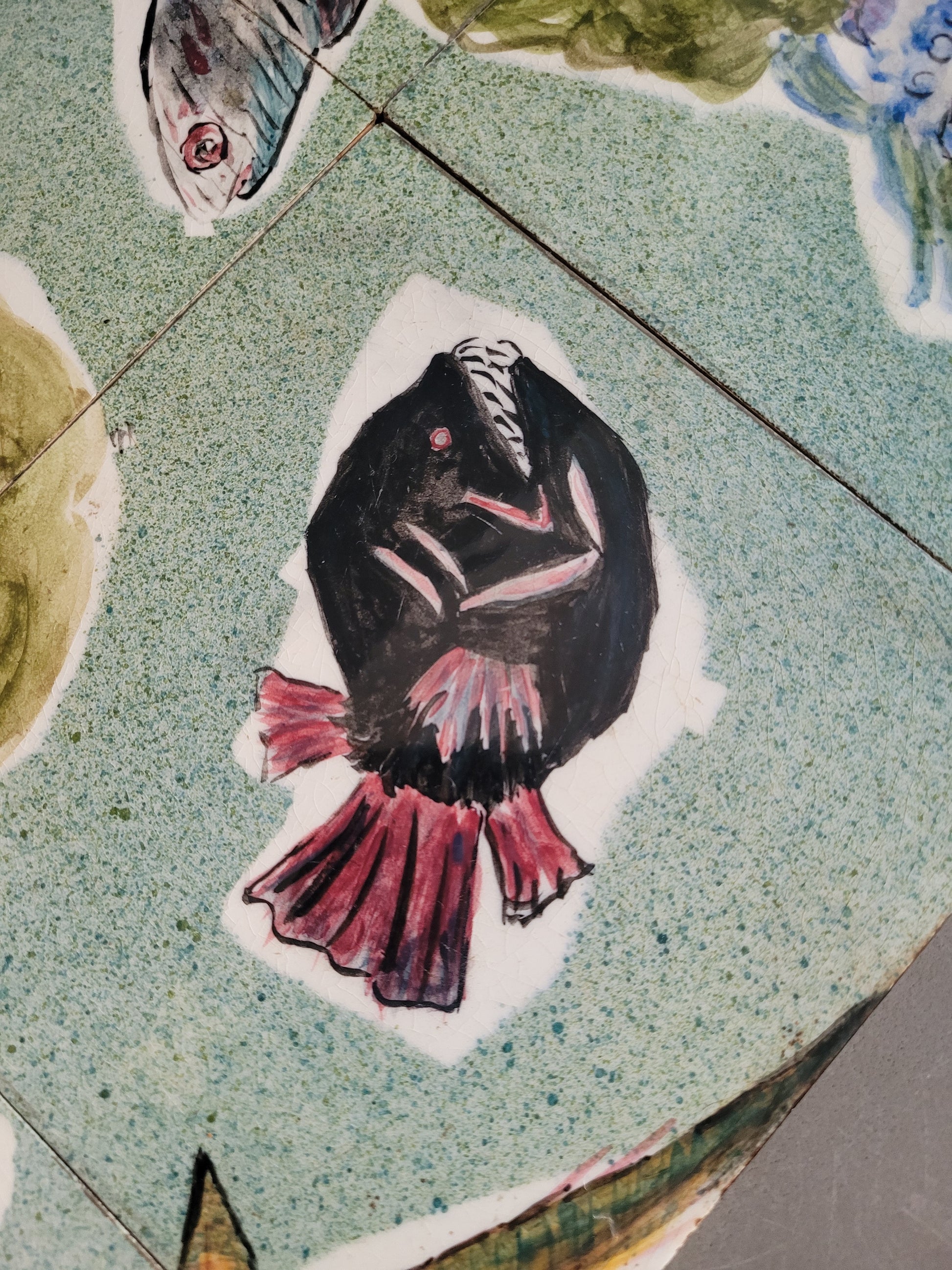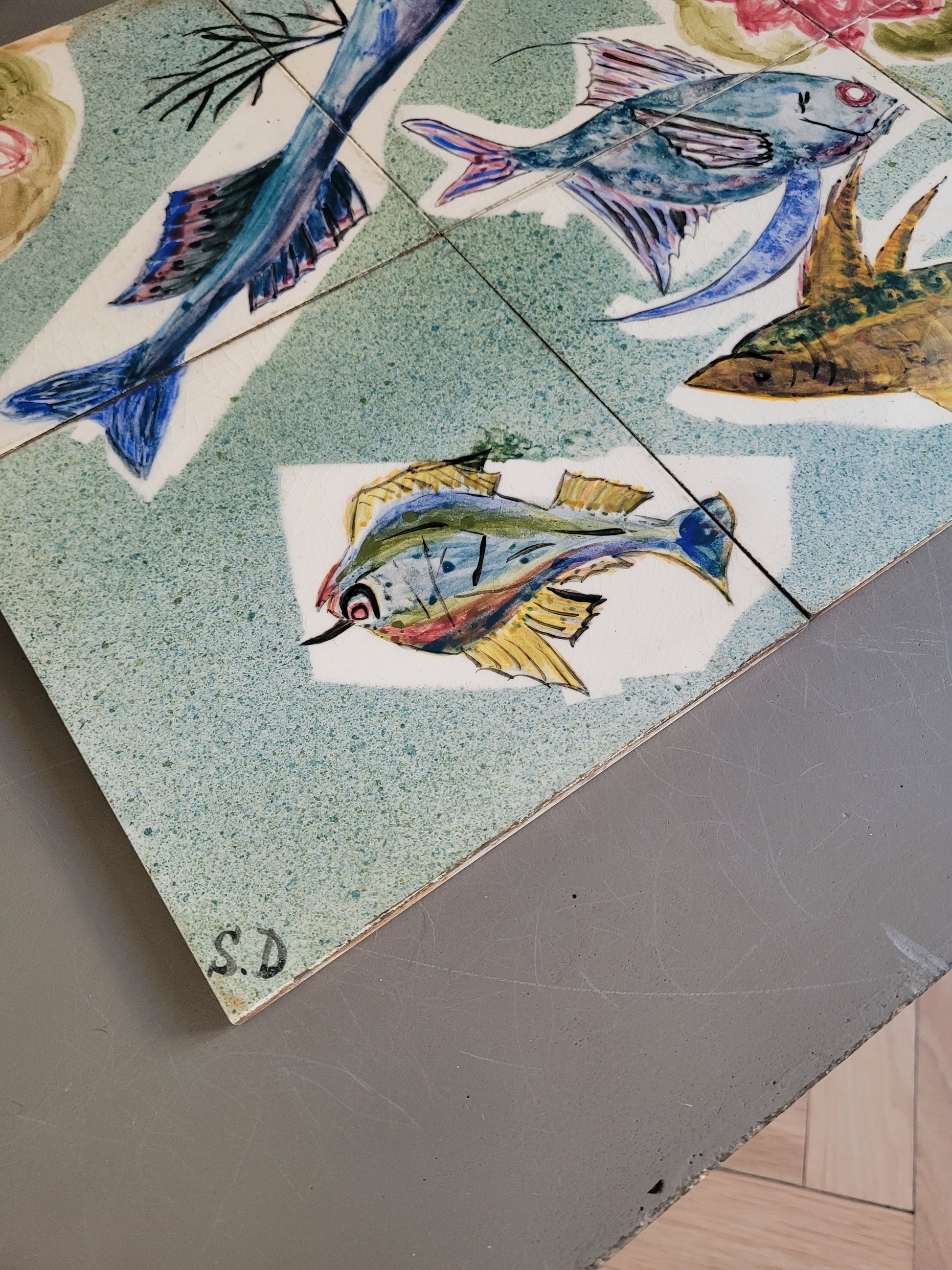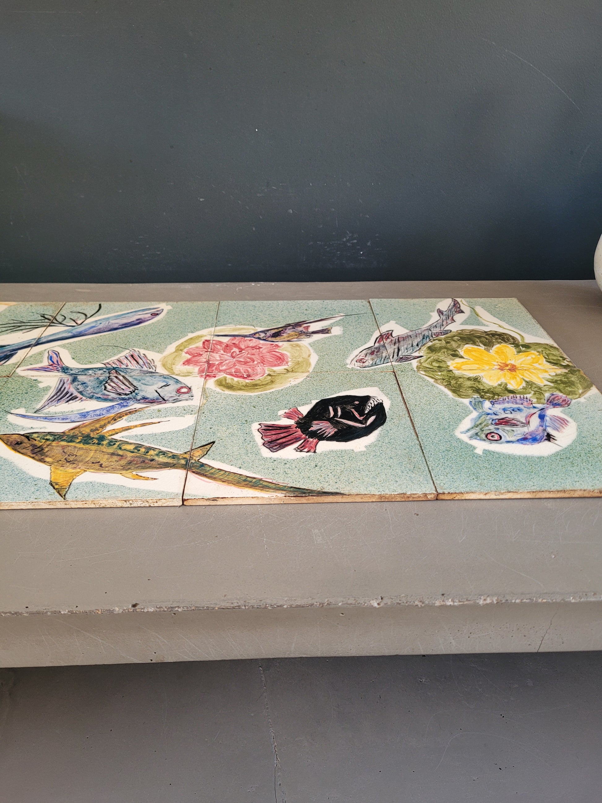 Superbe décor ancien de fond marin et de poissons en faïence, sur 8 carreaux de la faïencerie suisse Laufen.