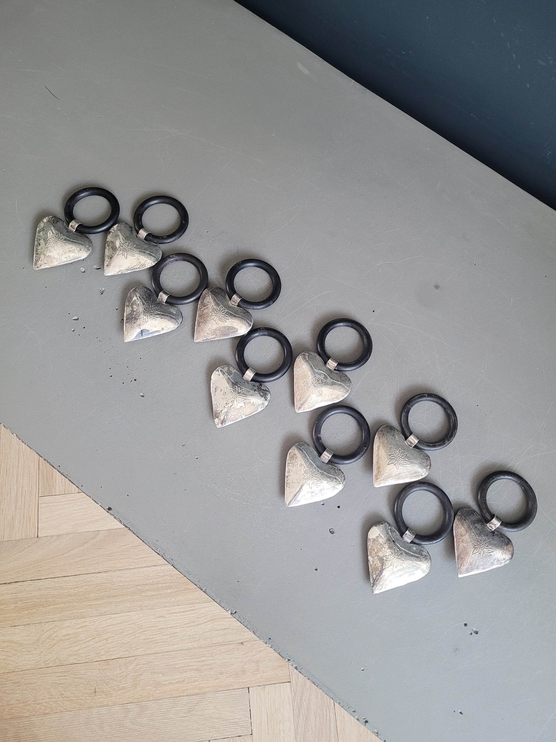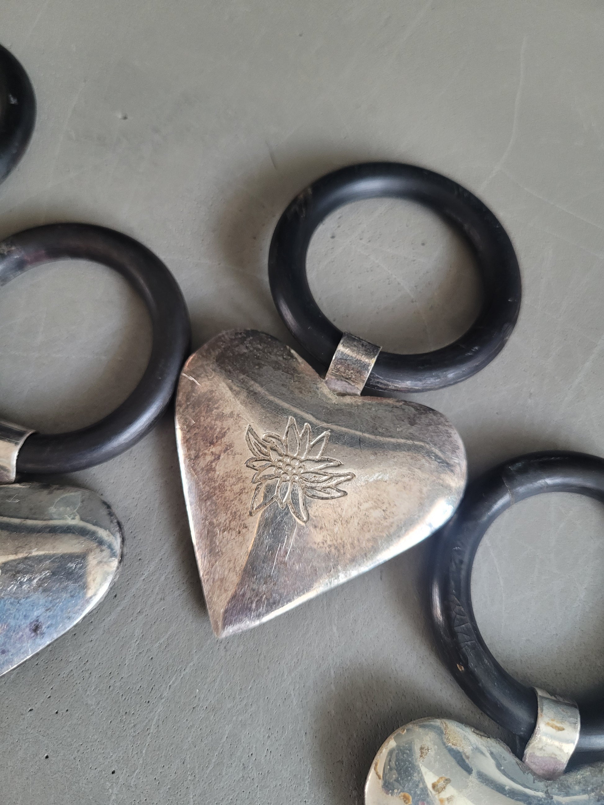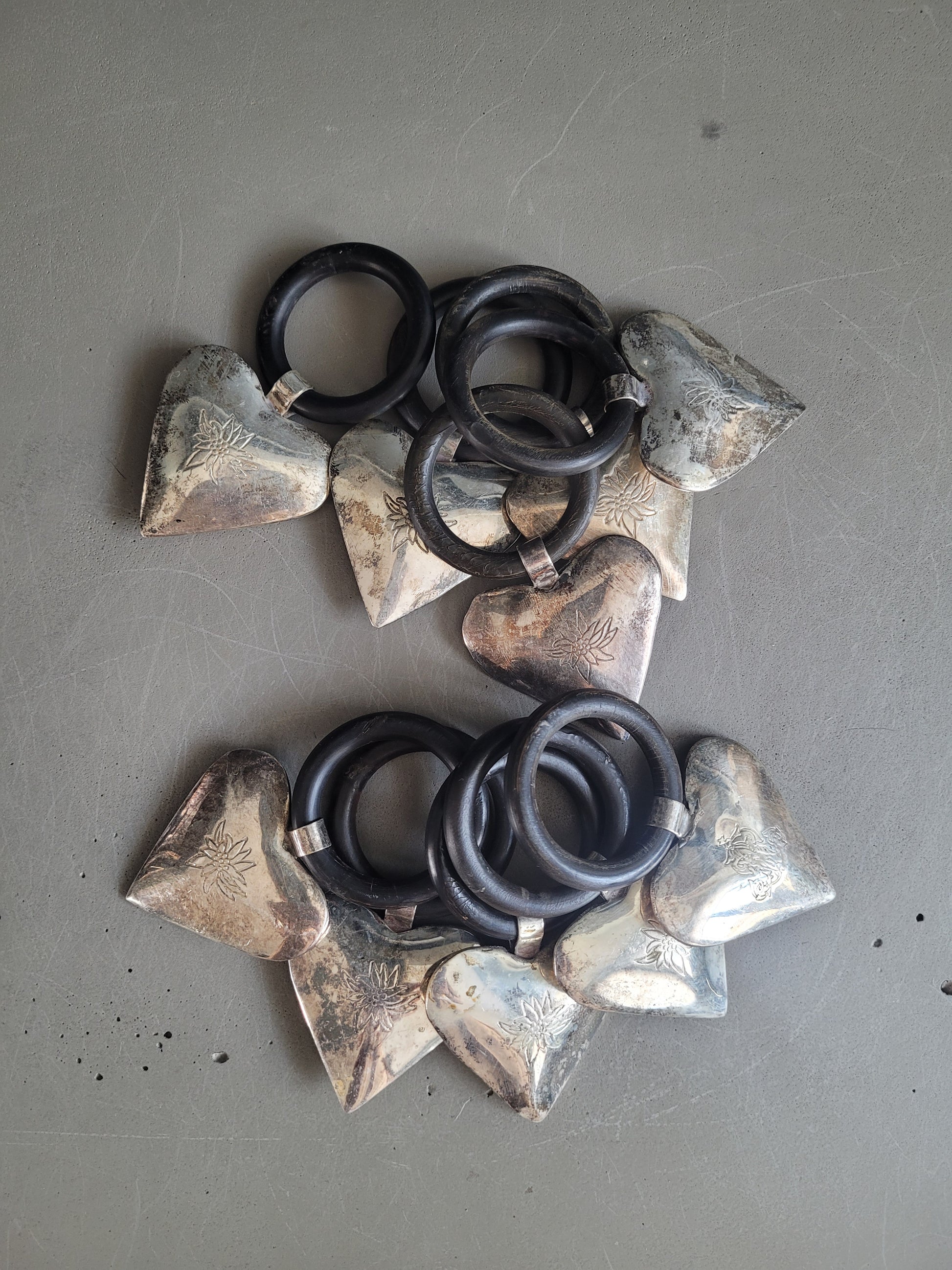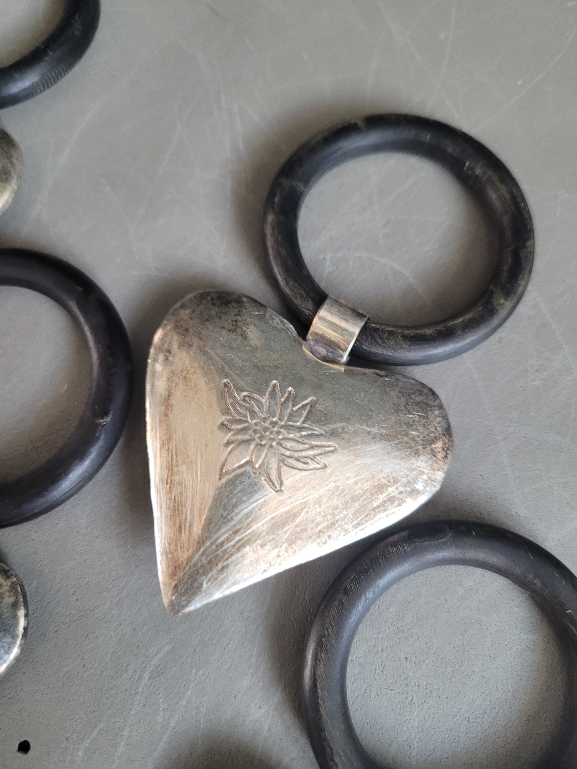 Très bel ensemble de 10 anneaux avec un cœur en volume, gravé d'un motif edelweiss sur 1 face (sauf 1 qui a un autre motif, voir photos)