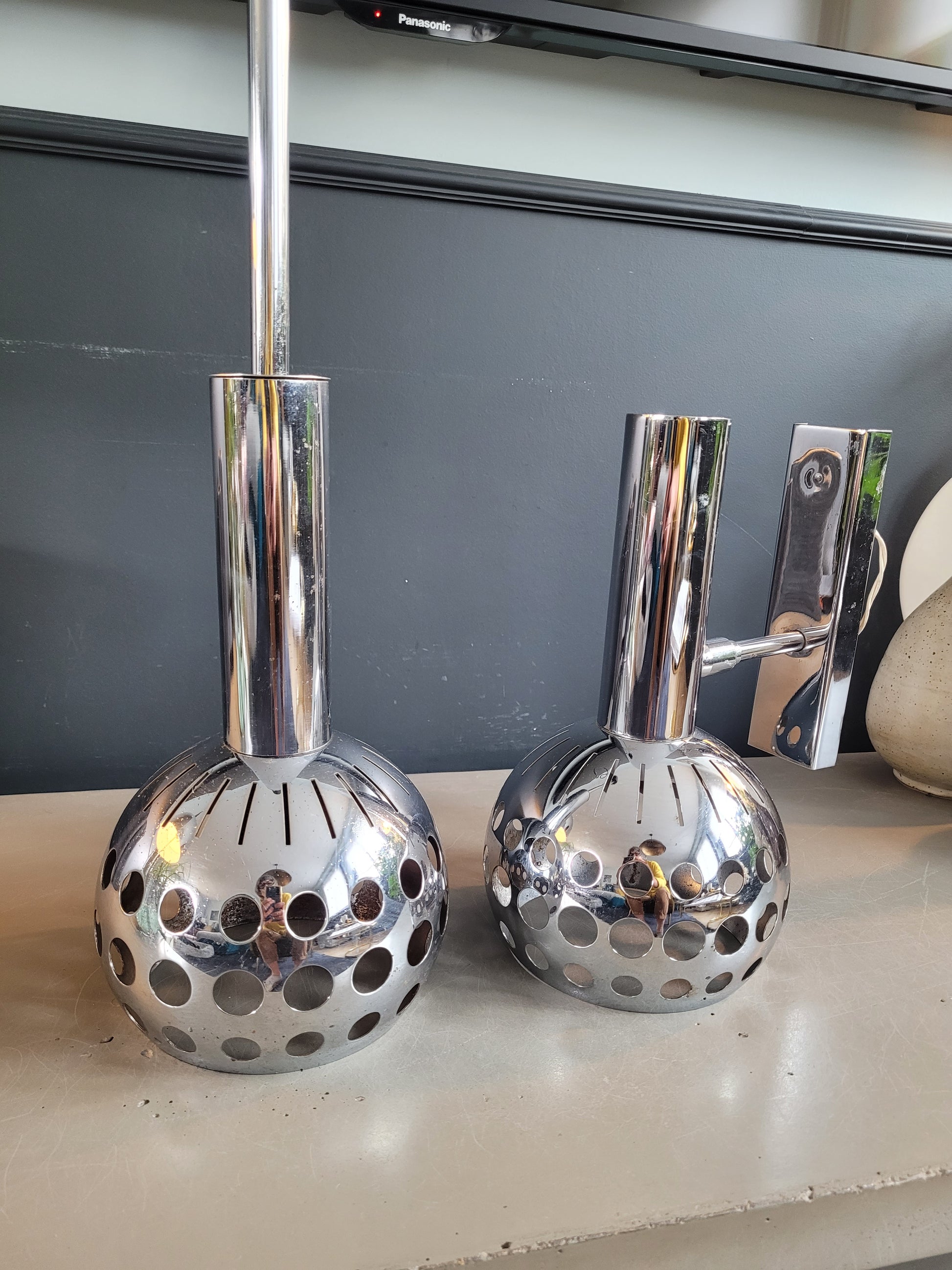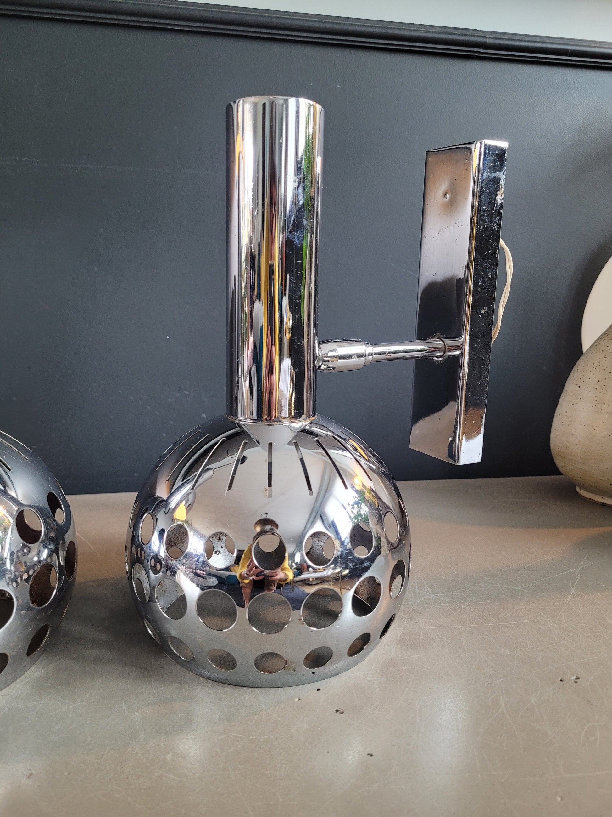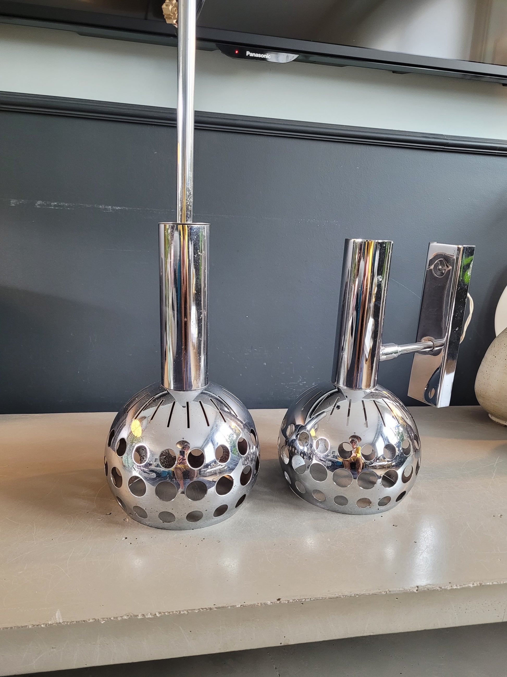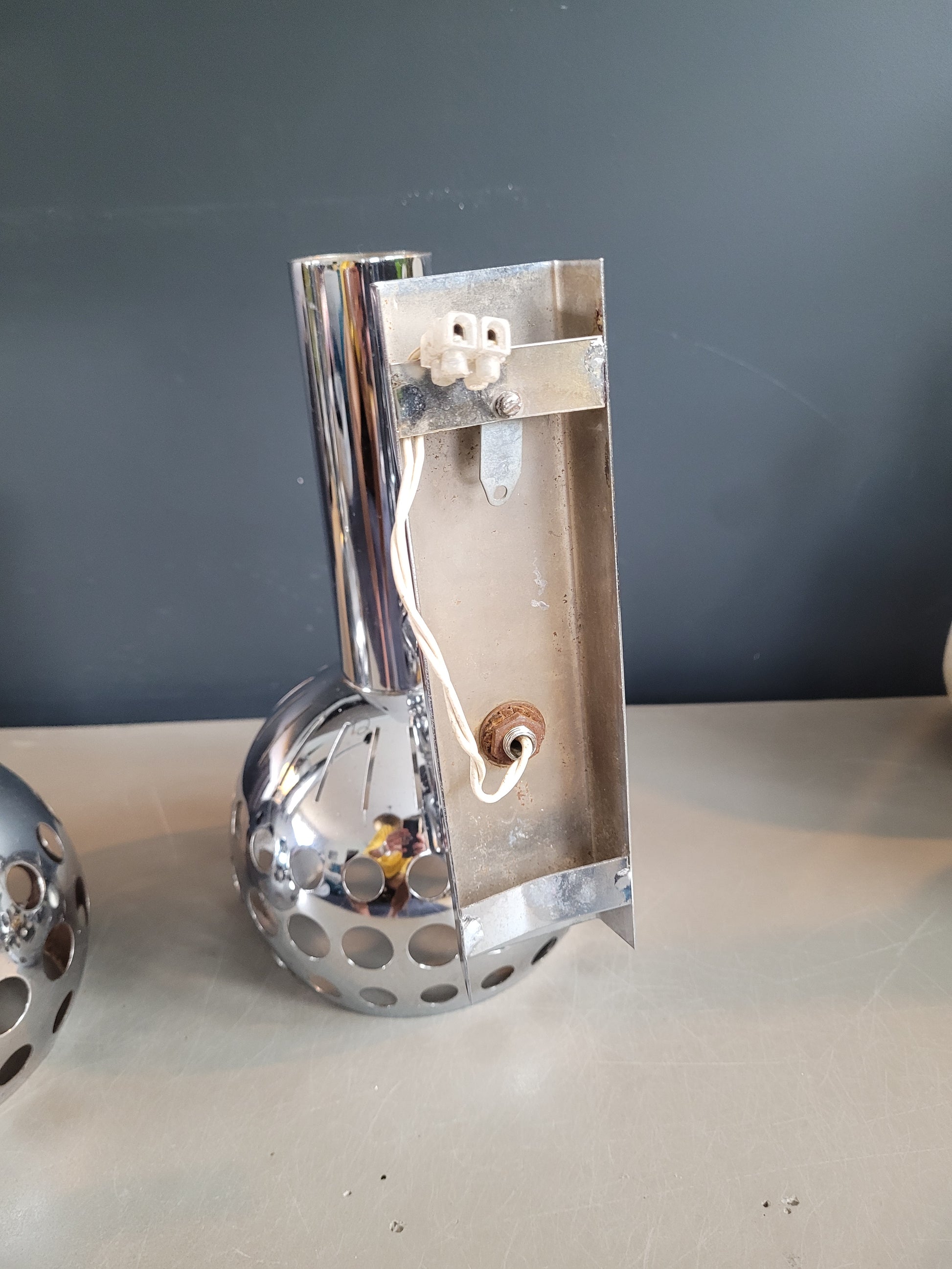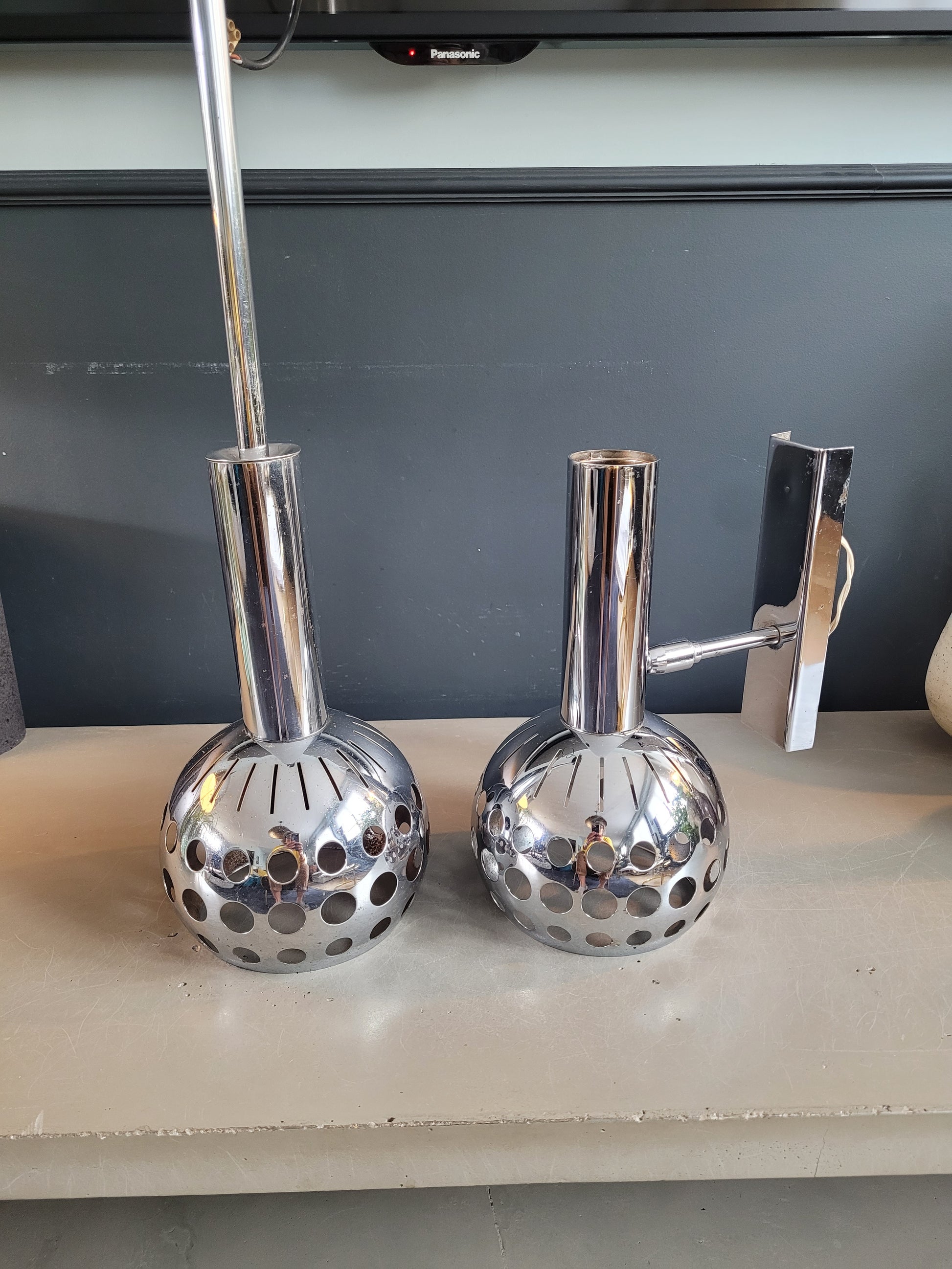 Sublime et rare, ensemble composé d'une applique orientable et une suspension, en métal chromé en forme de boules ajourées.