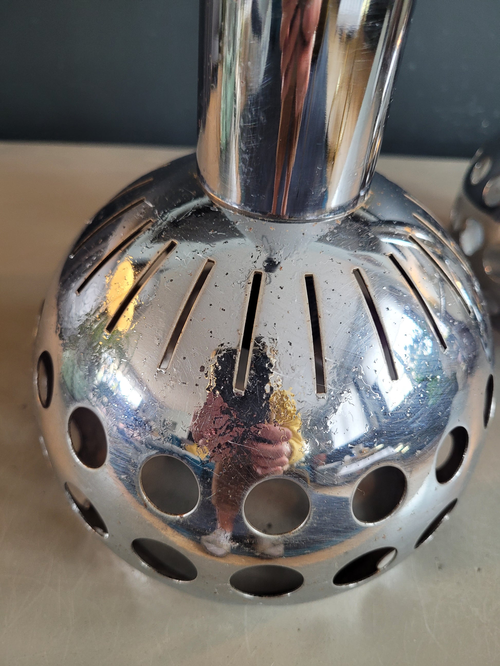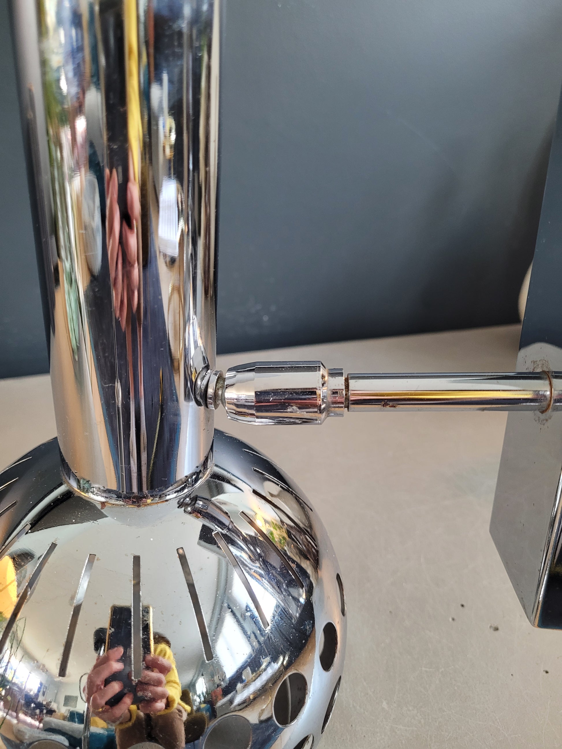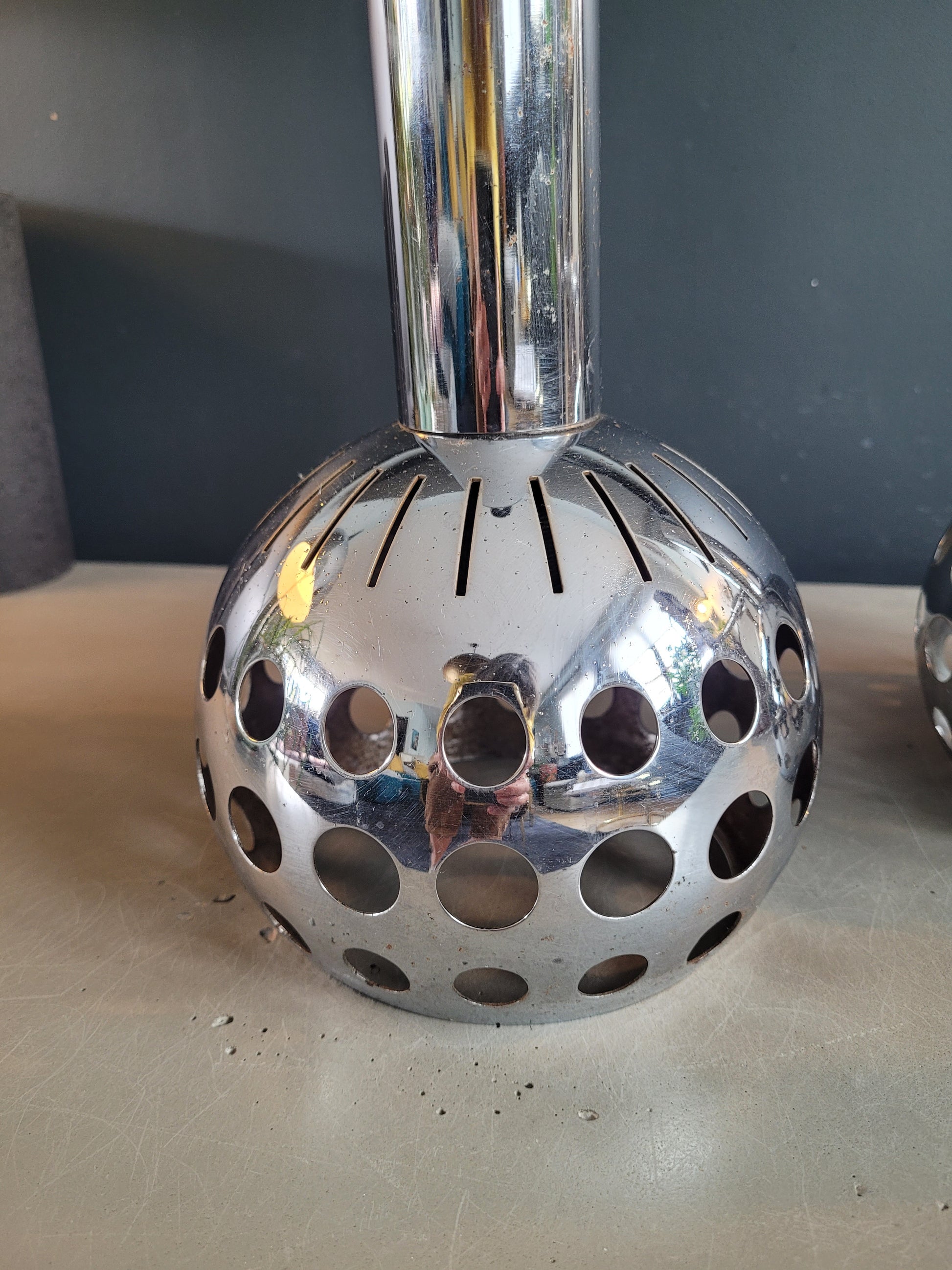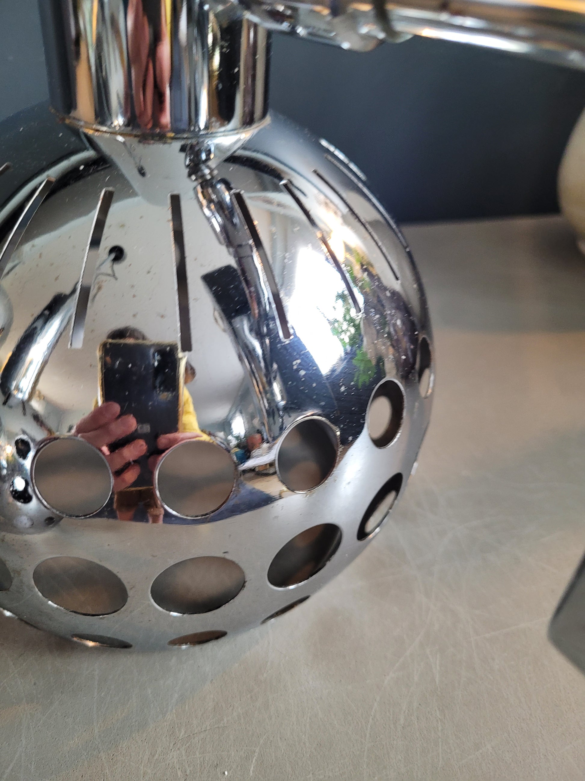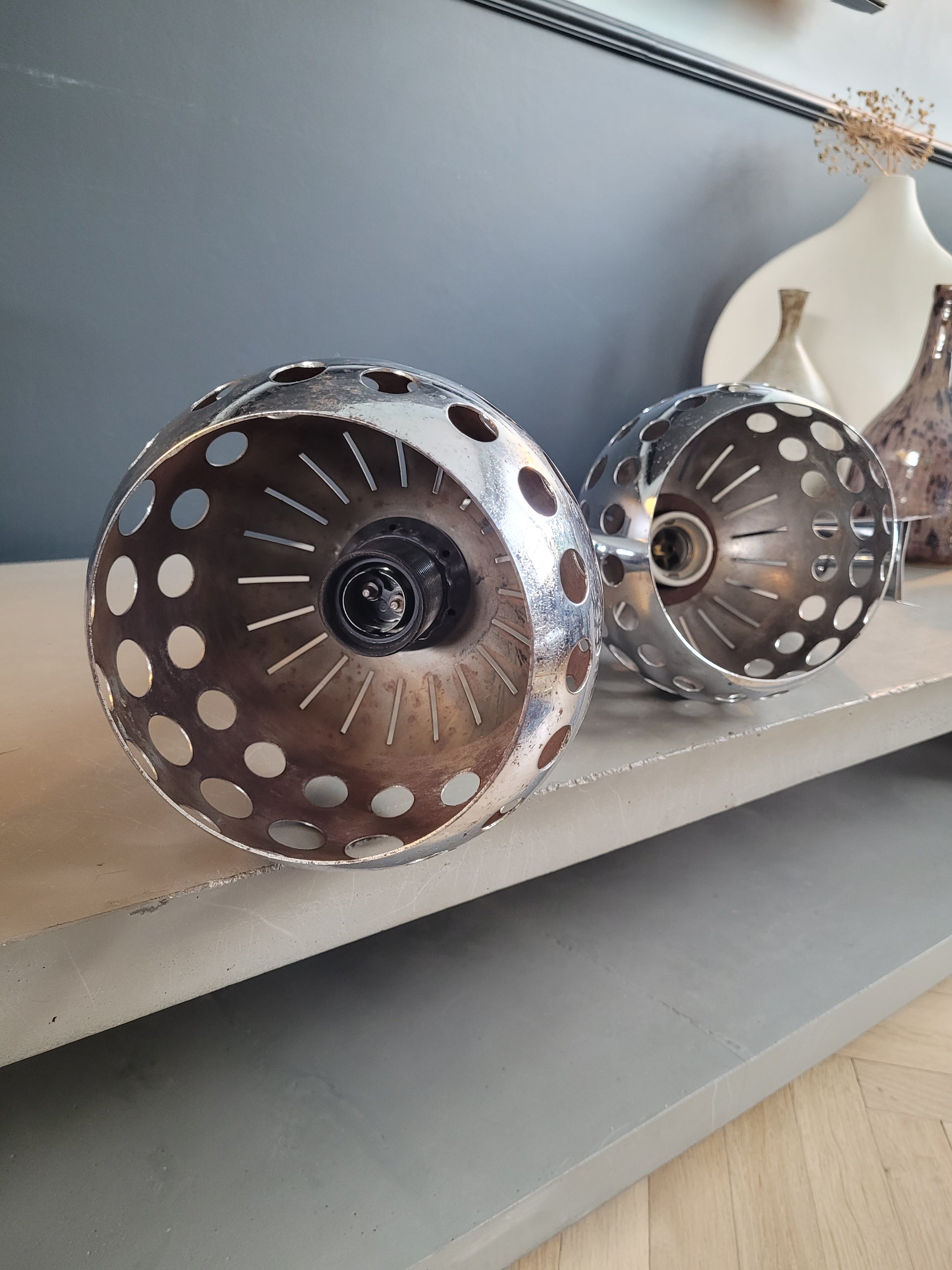 Sublime et rare, ensemble composé d'une applique orientable et une suspension, en métal chromé en forme de boules ajourées.