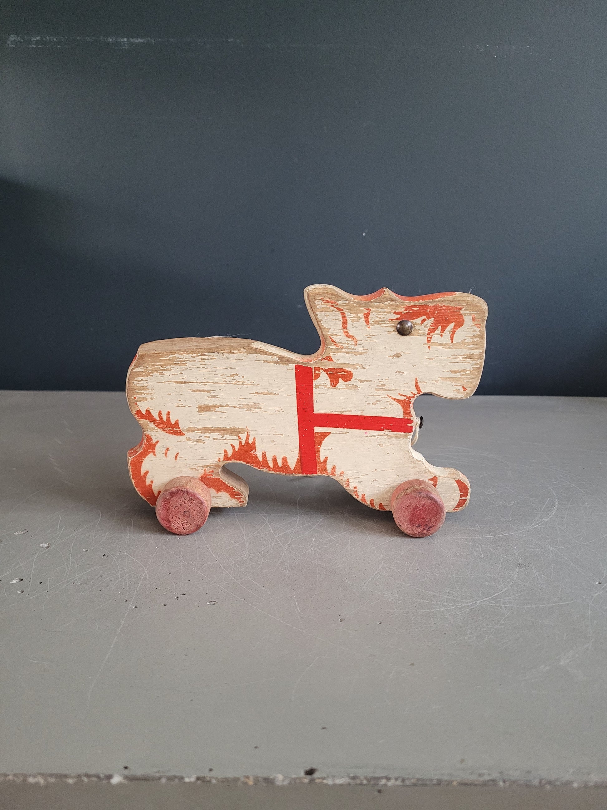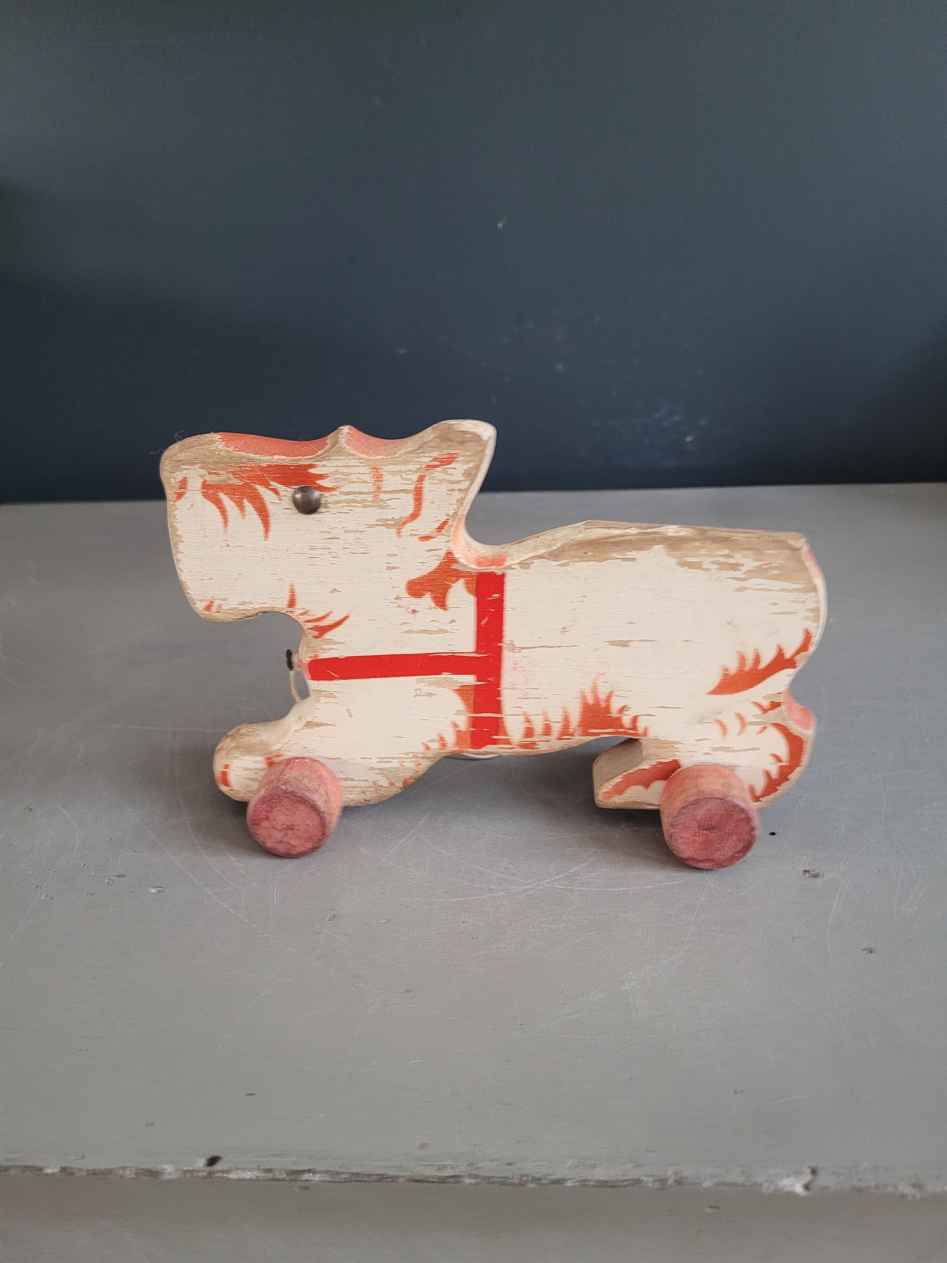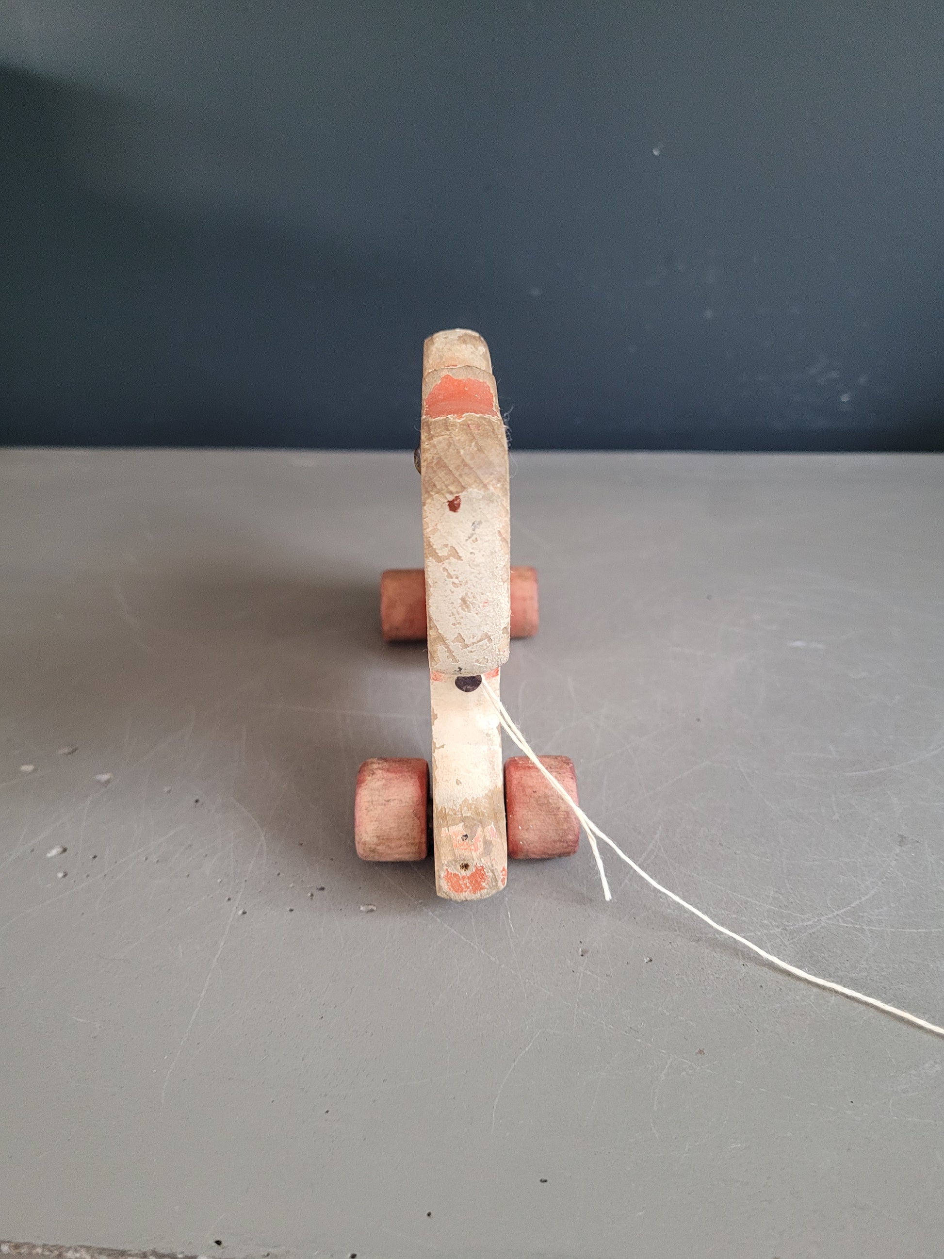 Chien à tirer ancien en bois peint. Un objet plein de charme, aussi décoratif que ludique!