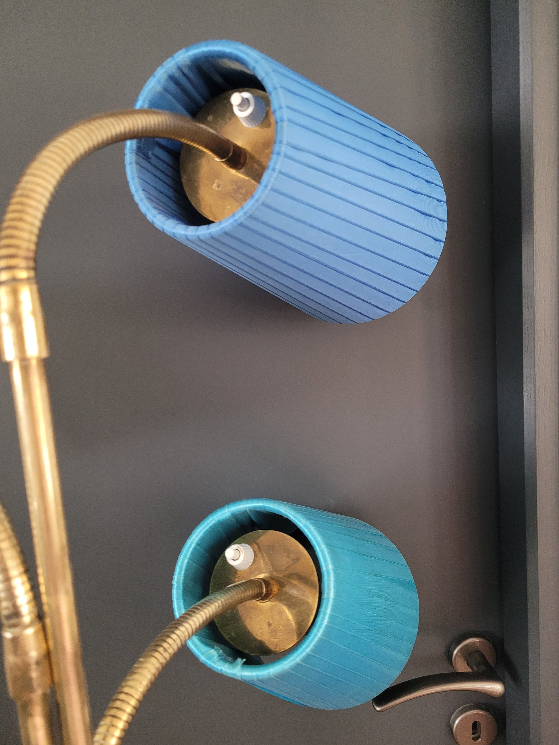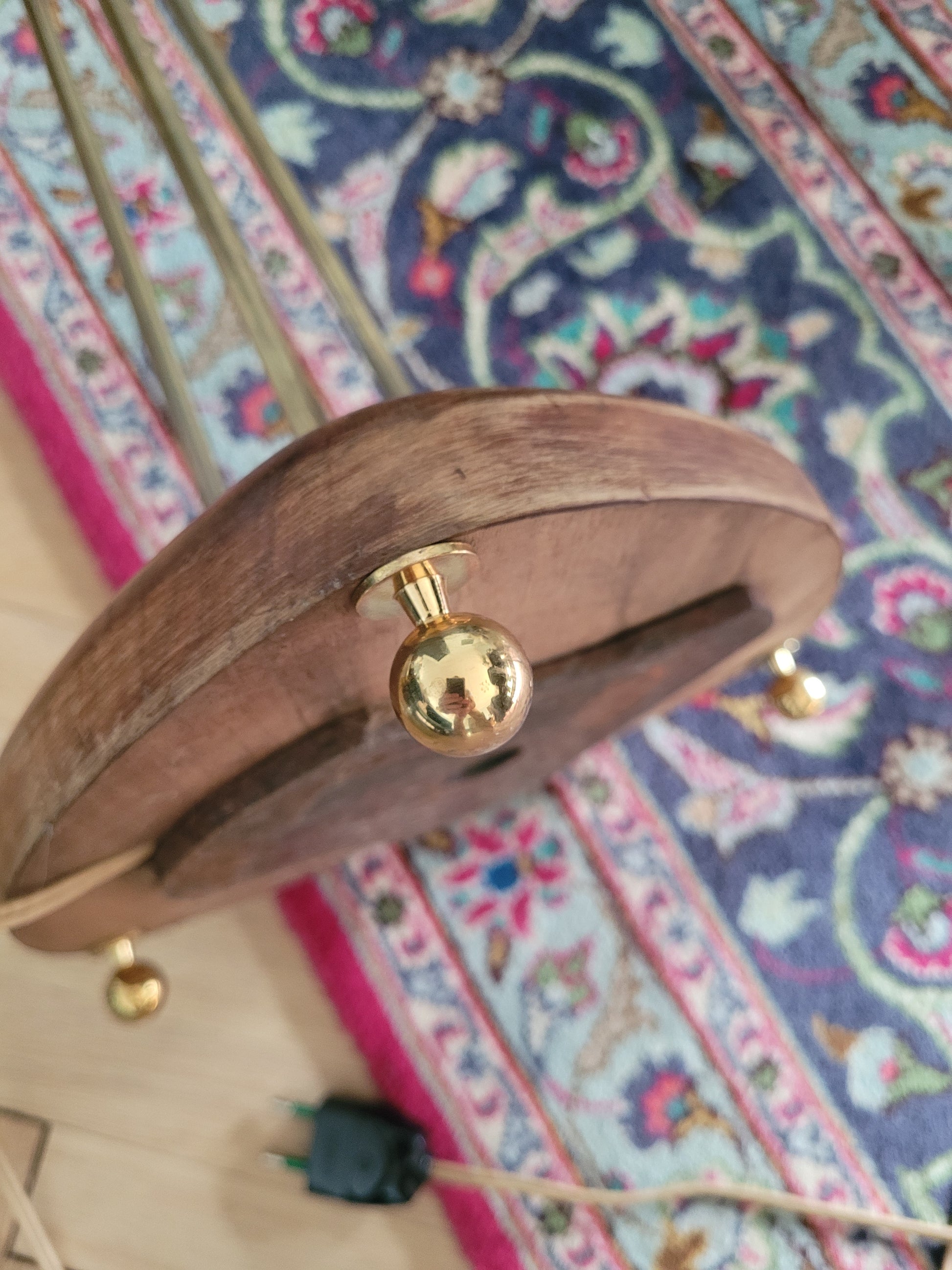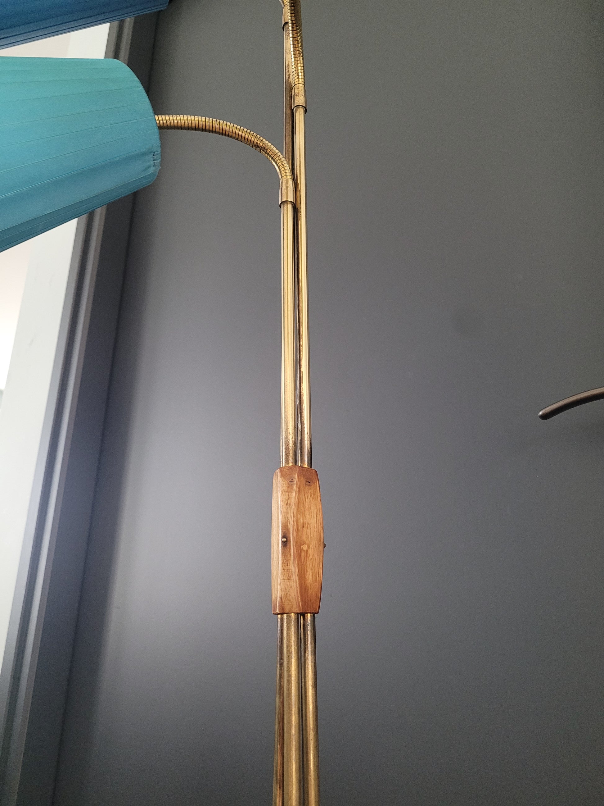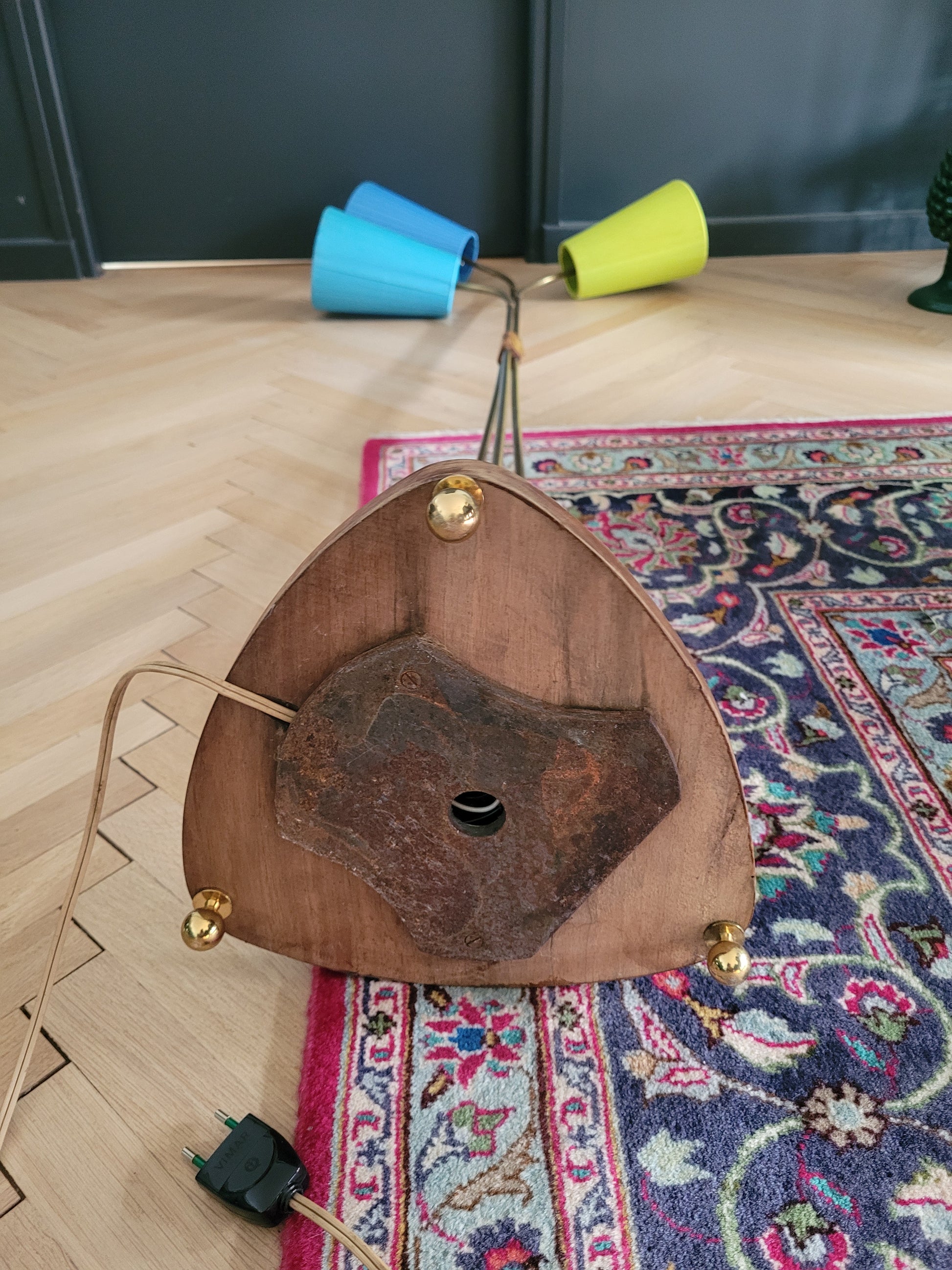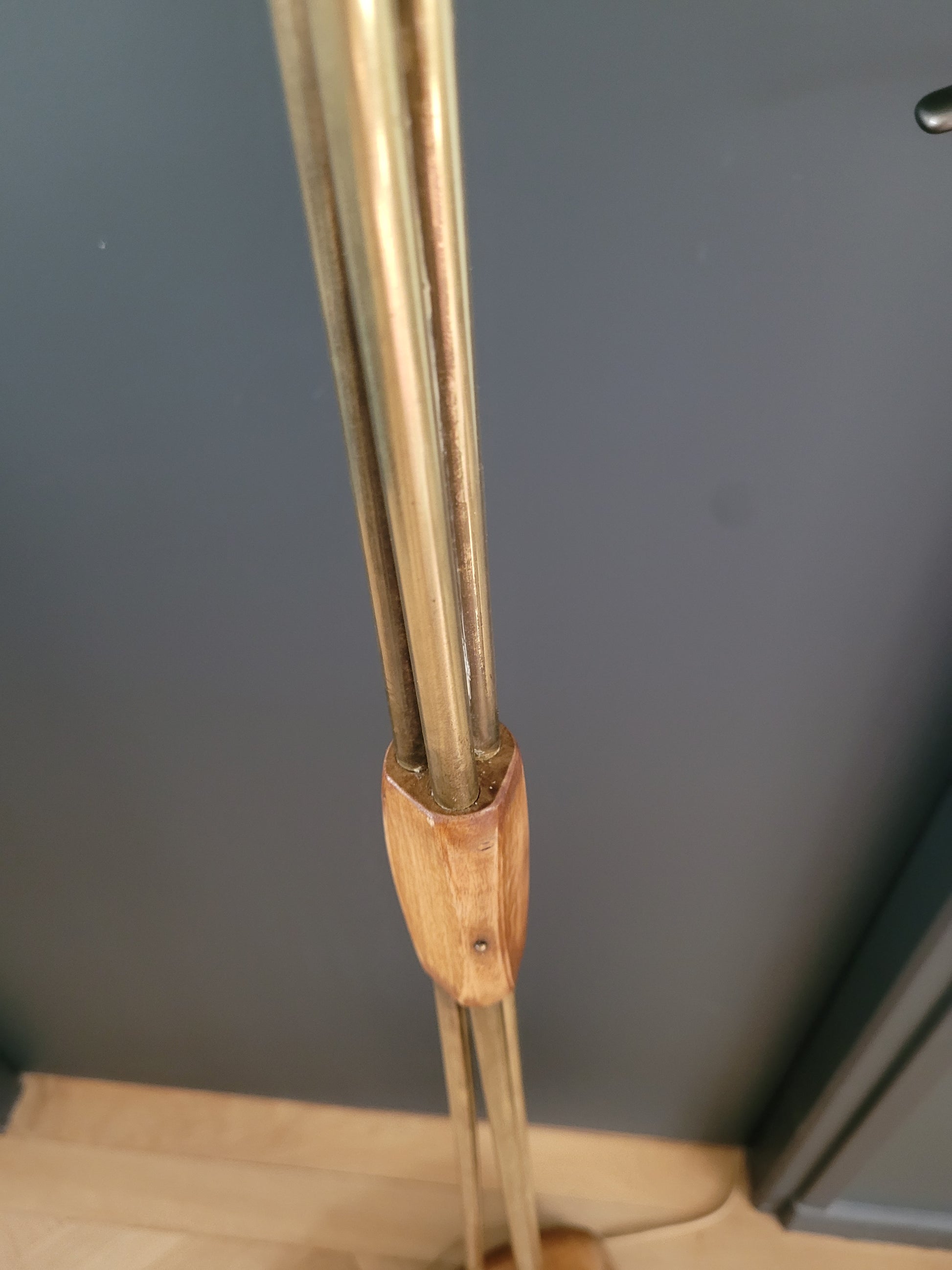 La base en bois posée sur 3 pieds est très stable, elle soutient les 3 tiges en laiton rigides sur la partie verticale puis articulées sur la fin, rendant les 3 têtes orientables dans toutes les directions.