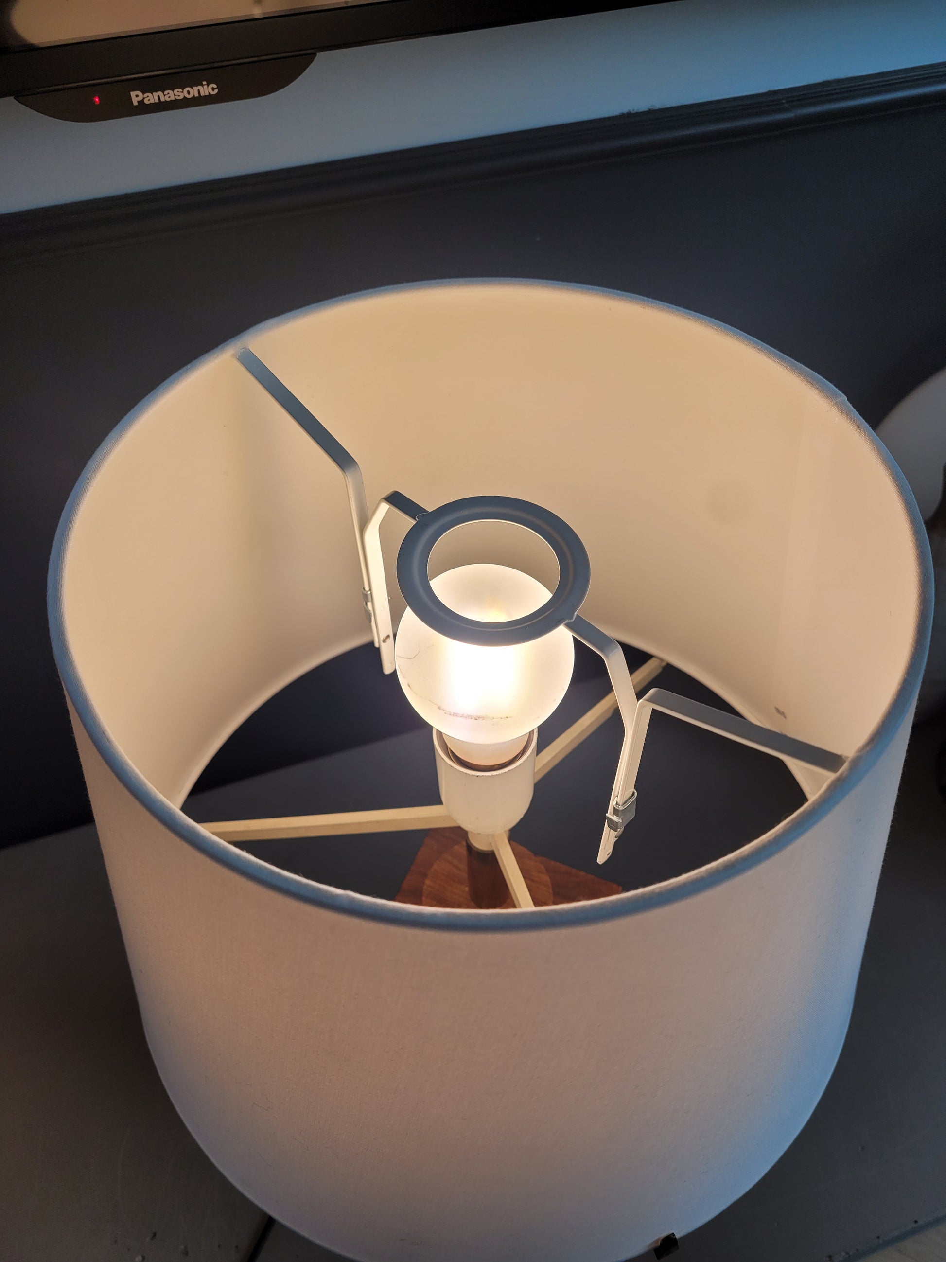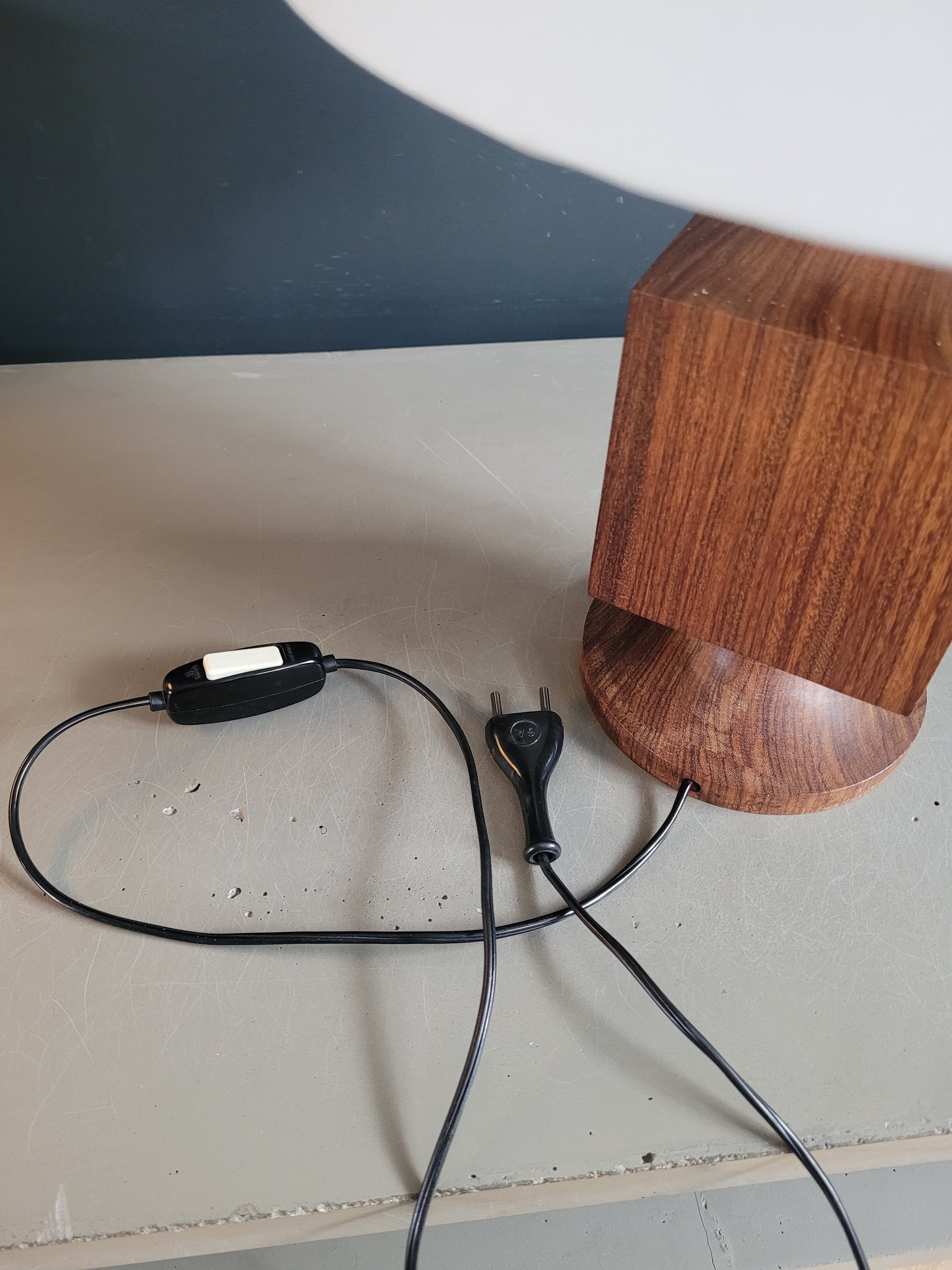 Le pied est presque une œuvre d'art, le dessin est très réussi, les lignes sont élégantes, cossues et légères en même temps. Les proportions avec l'abat-jour sont équilibrées et la couleur crème se marie parfaitement avec celle du teck.