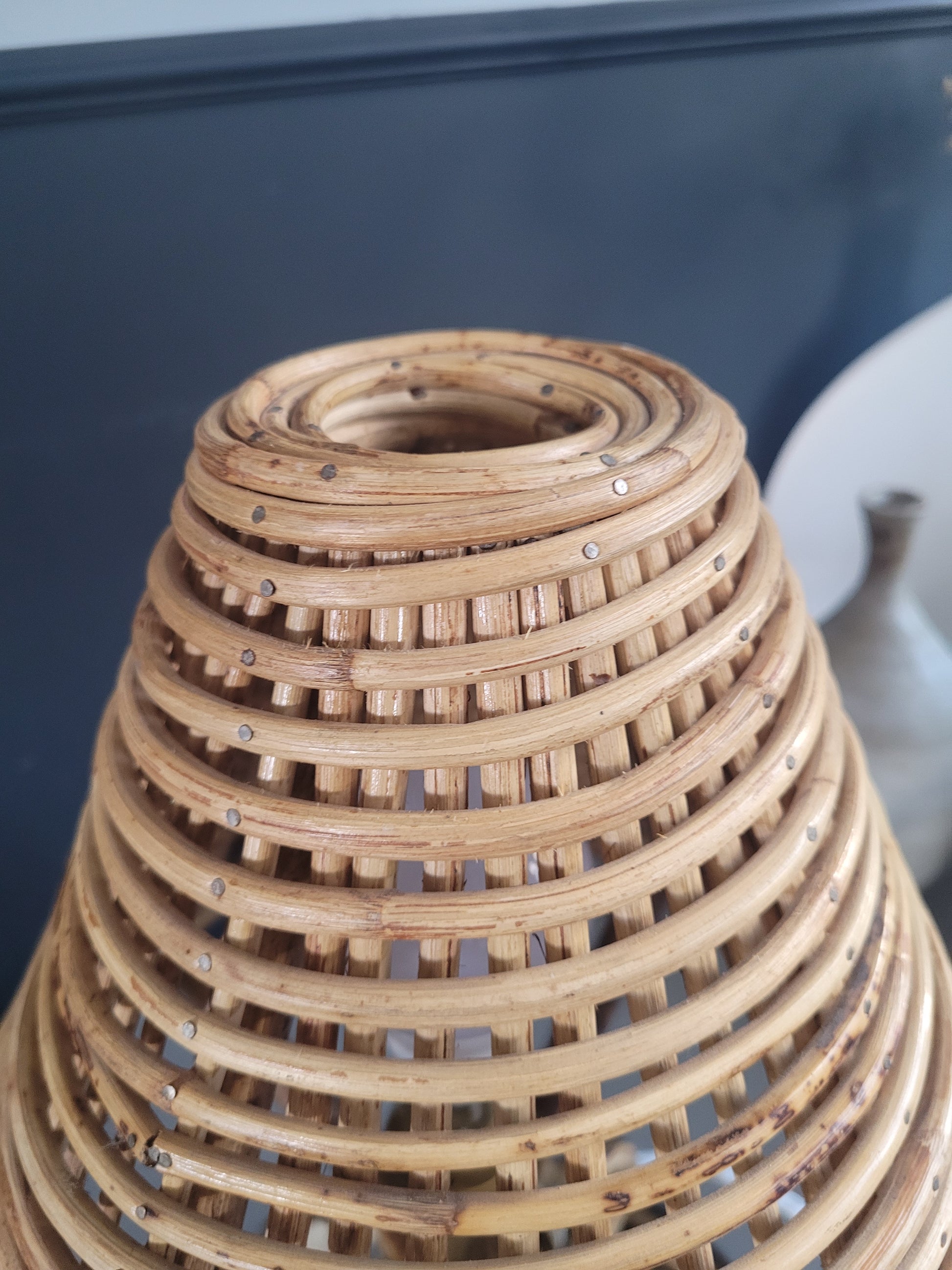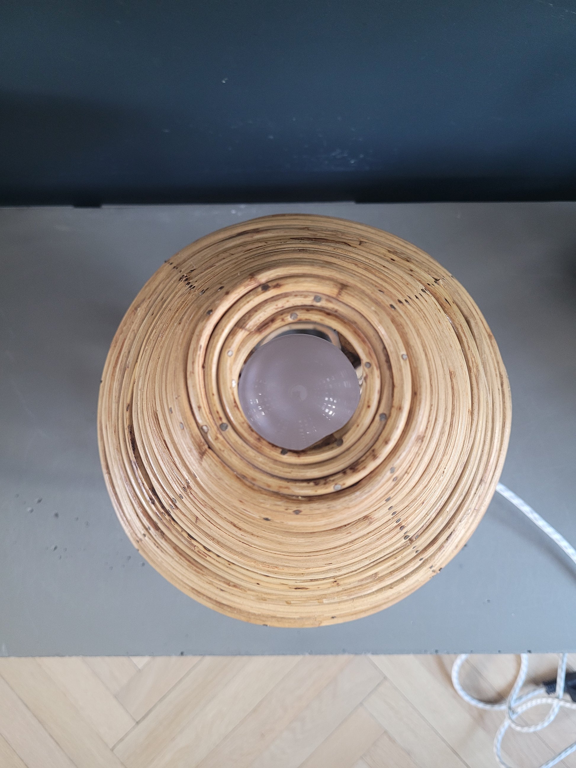 Travail exceptionnel, de l'abat-jour bien sûr, mais le pied n'est pas en reste ! Posé sur une base, façonné en bambou courbé, il interpelle autant que l'abat-jour, composé de 2 structures en bambou d'abord puis rotin, et d'une spirale de rotin.