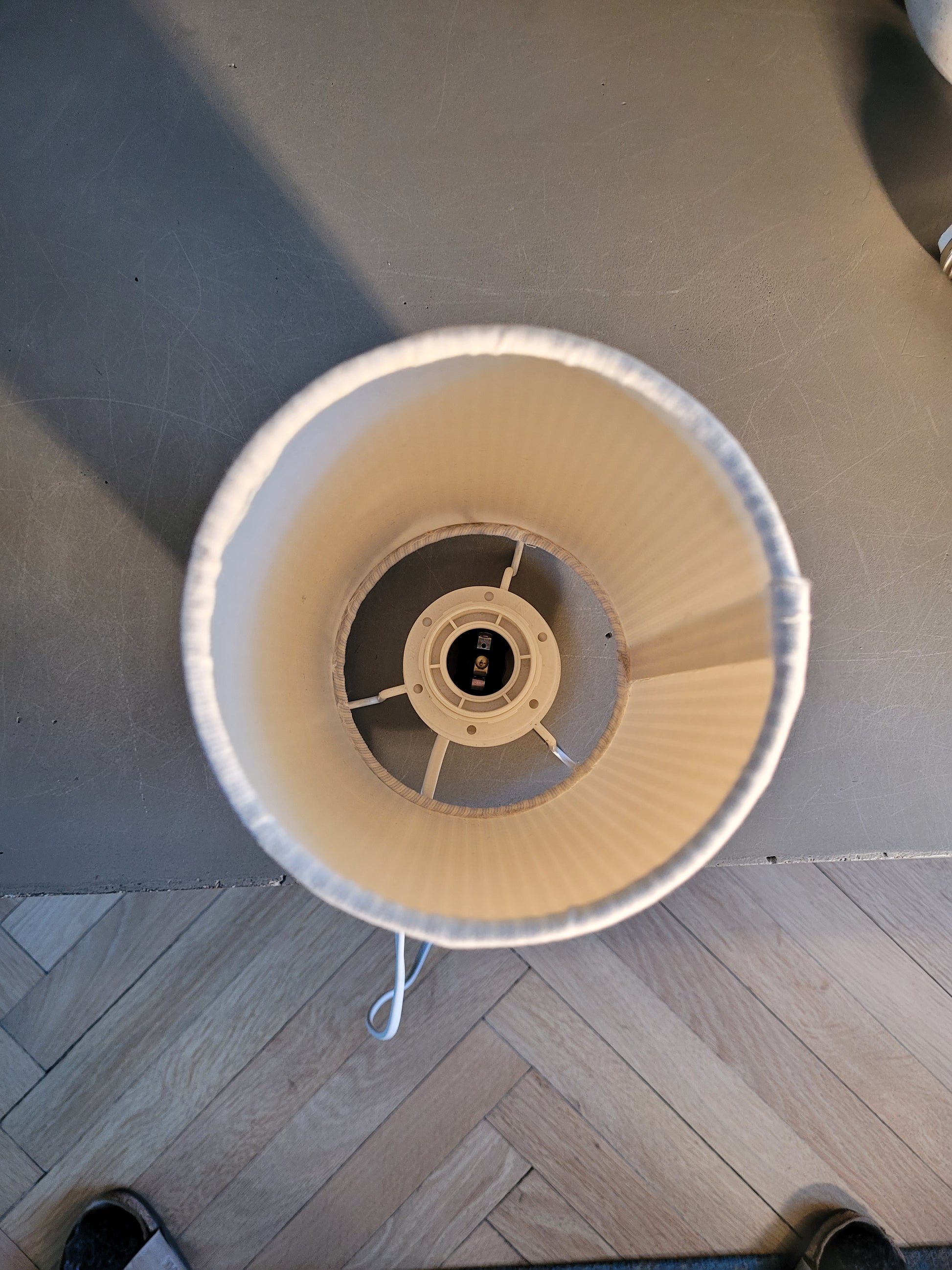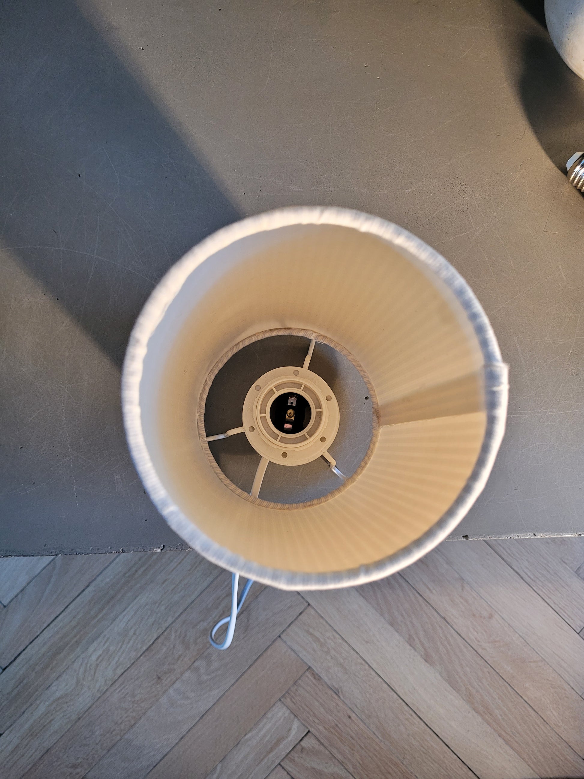 Les pieds en métal laqué, hauts de 1 cm, sont à peine visibles et constituent le support de la lampe et de la douille.