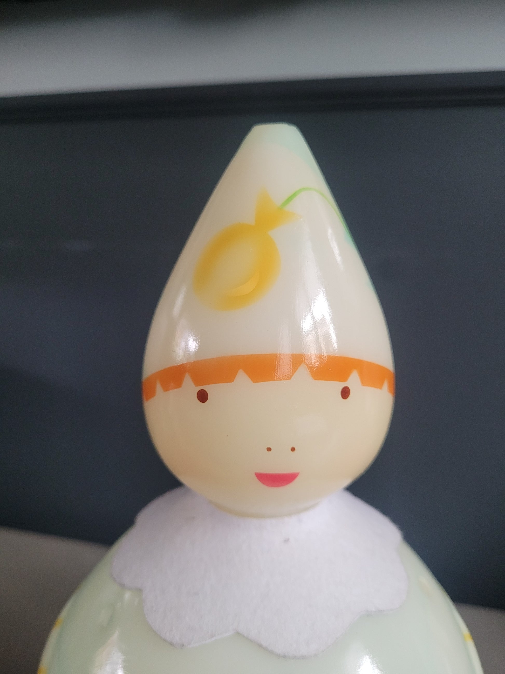 Sa résine peinte, incassable, diffuse une lumière apaisante, mettant en valeur ses illustrations poétiques et son visage souriant.