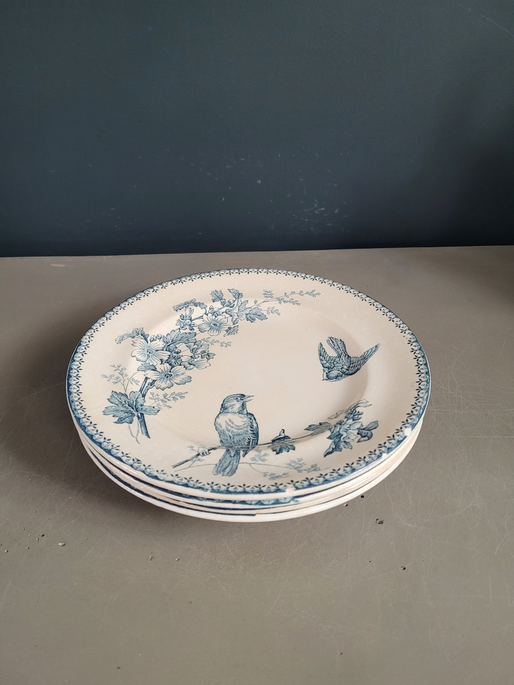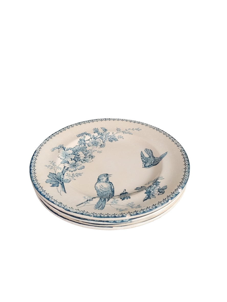 Lot de 4 assiettes, 3 assiettes plates + 1 creuse, en faïence émaillée de Longwy, à motifs bleus collection Mésange.