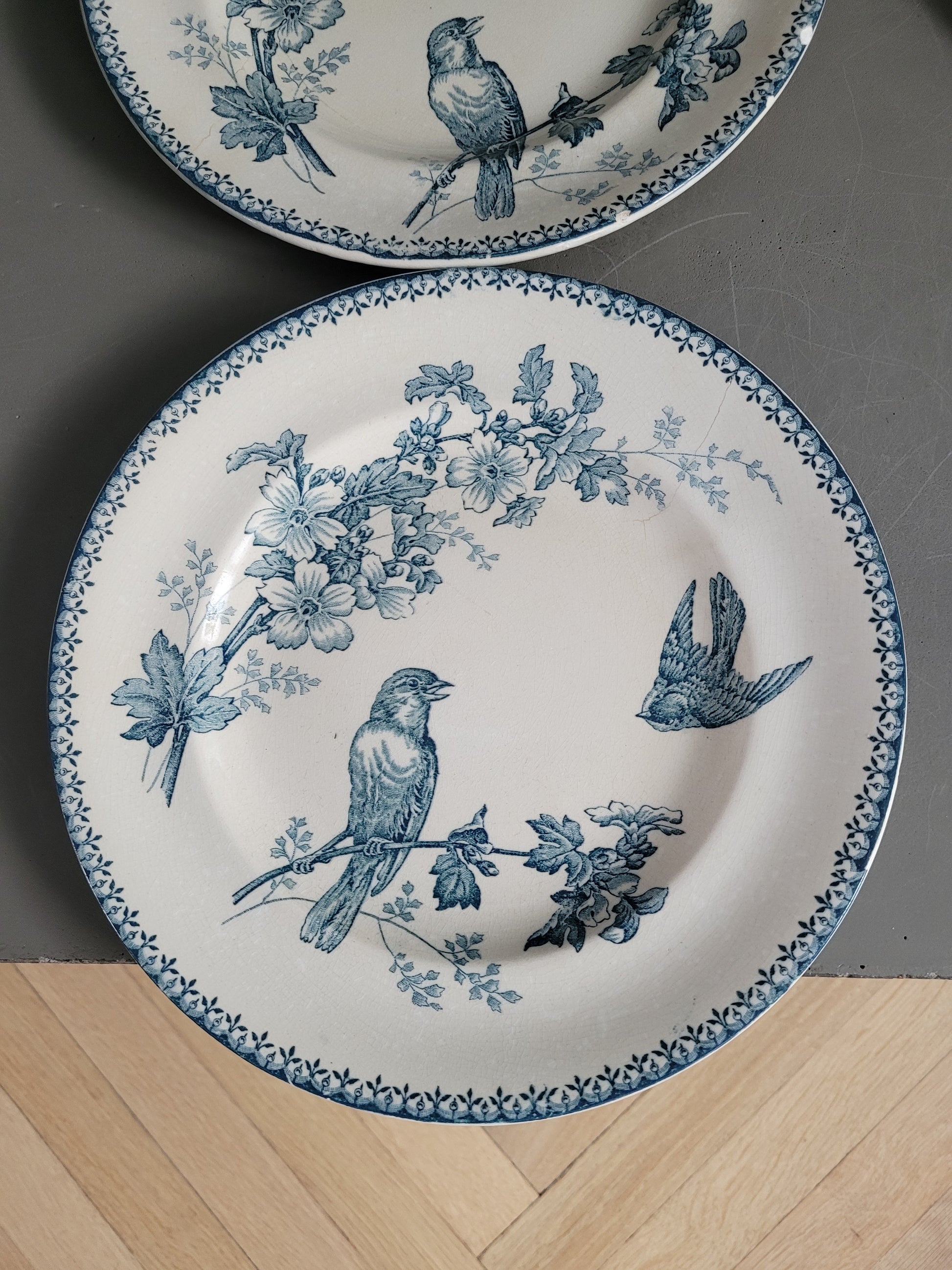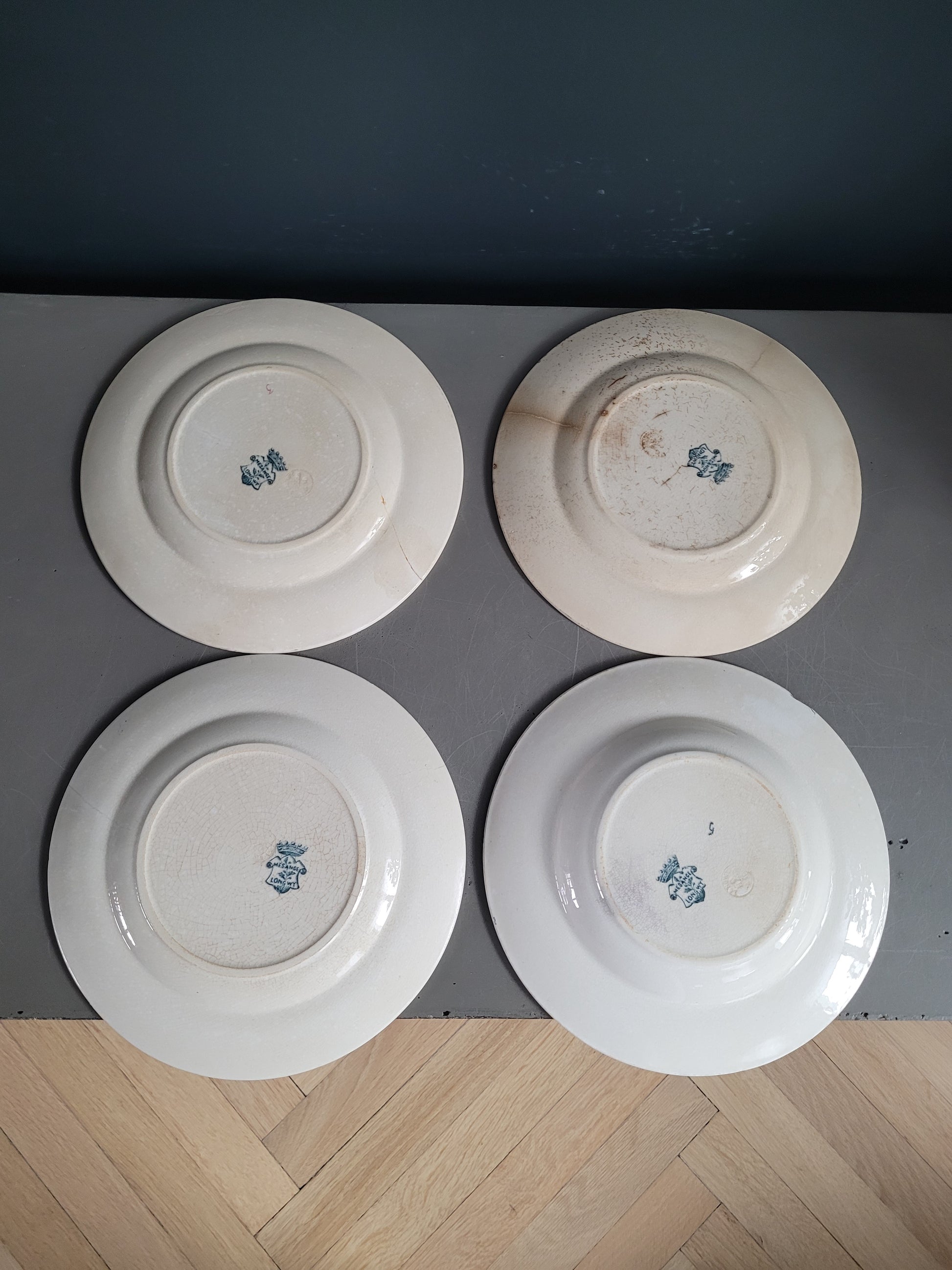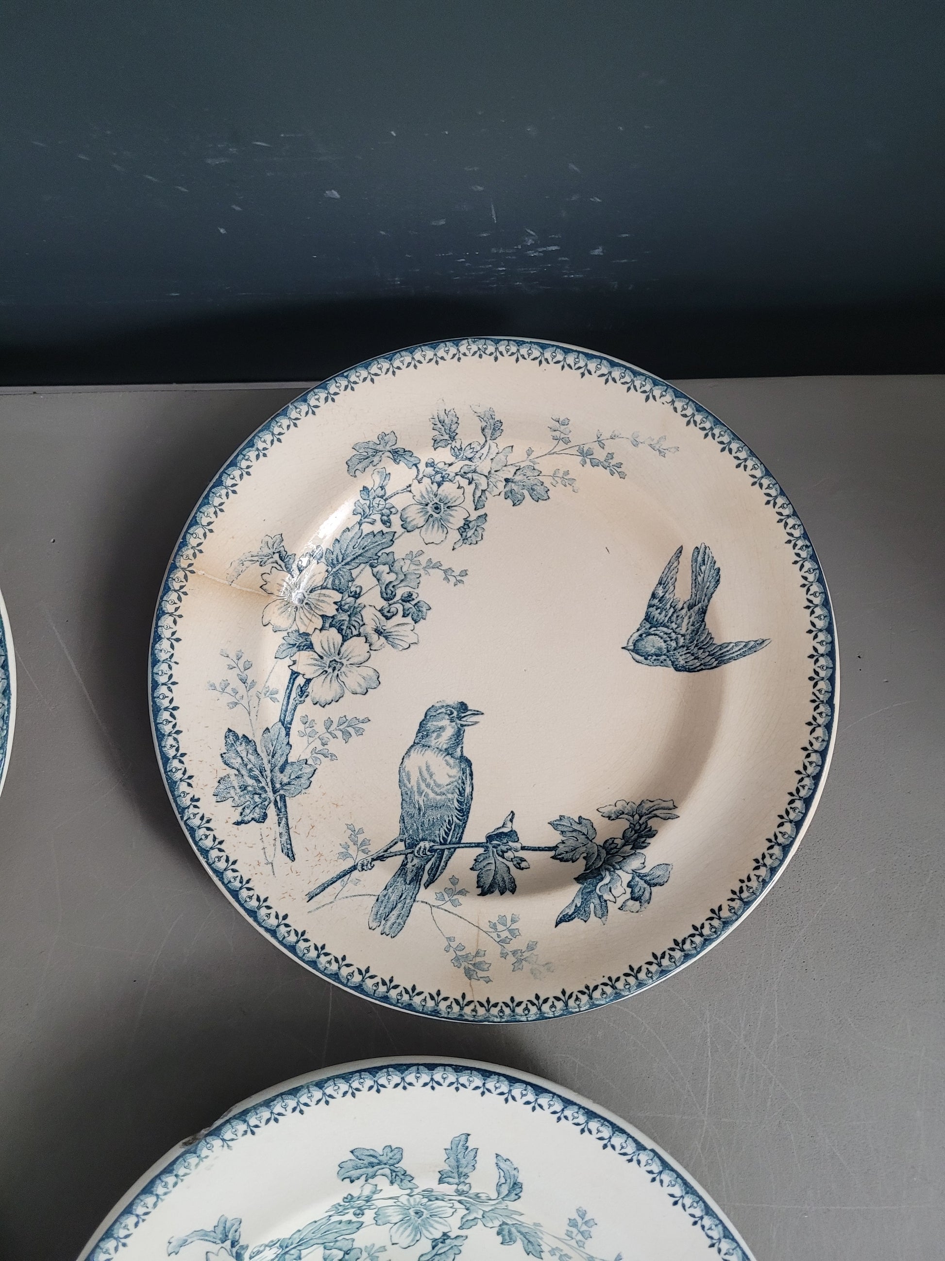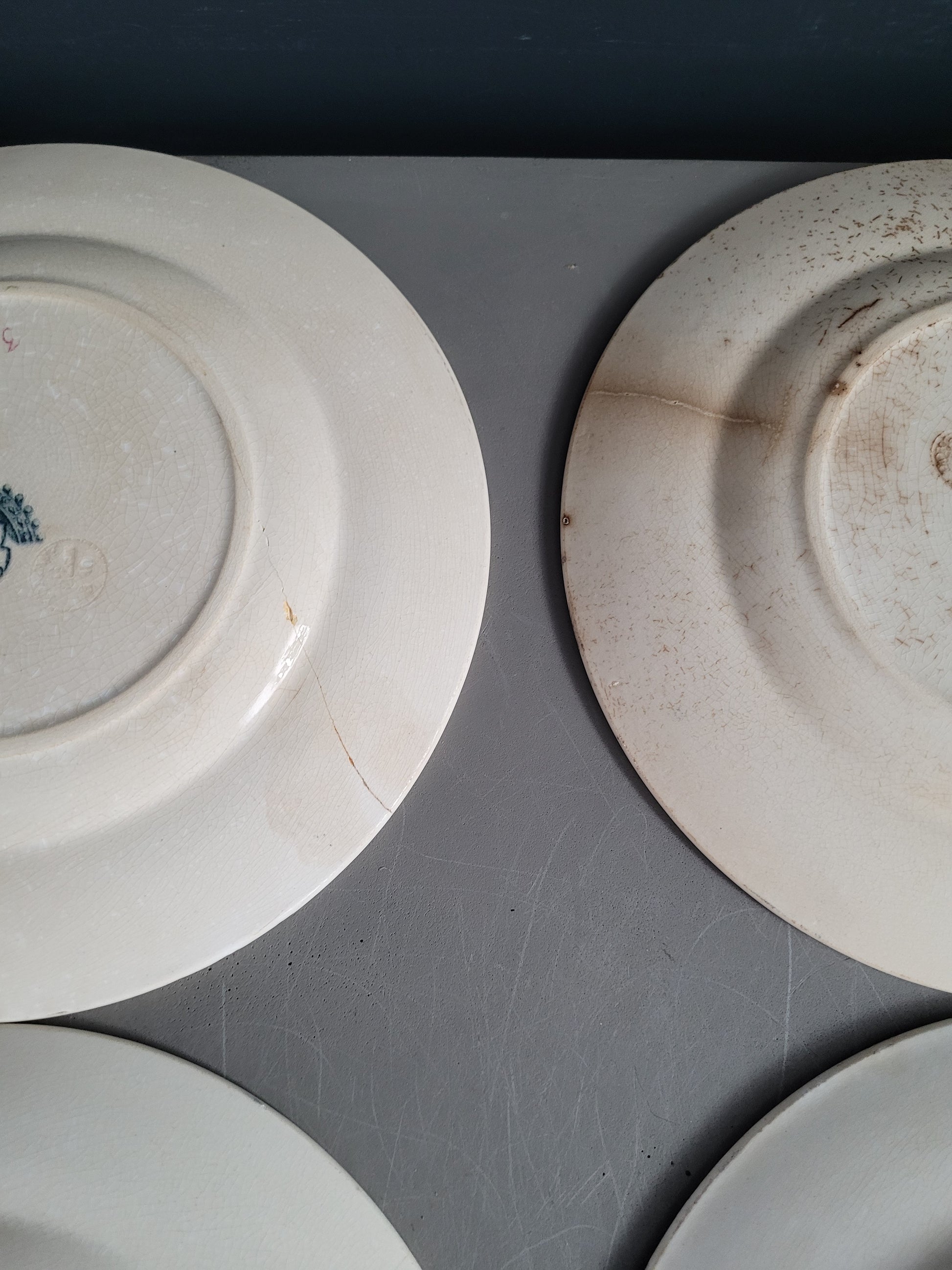 Les assiettes sont anciennes et dans leur jus. 2 des planches présentent des fissures. Elles ne semblent pas trop fragilisées et peuvent être utilisées telles quelles, et elles ont bien sûr gardées tout leur potentiel décoratif !