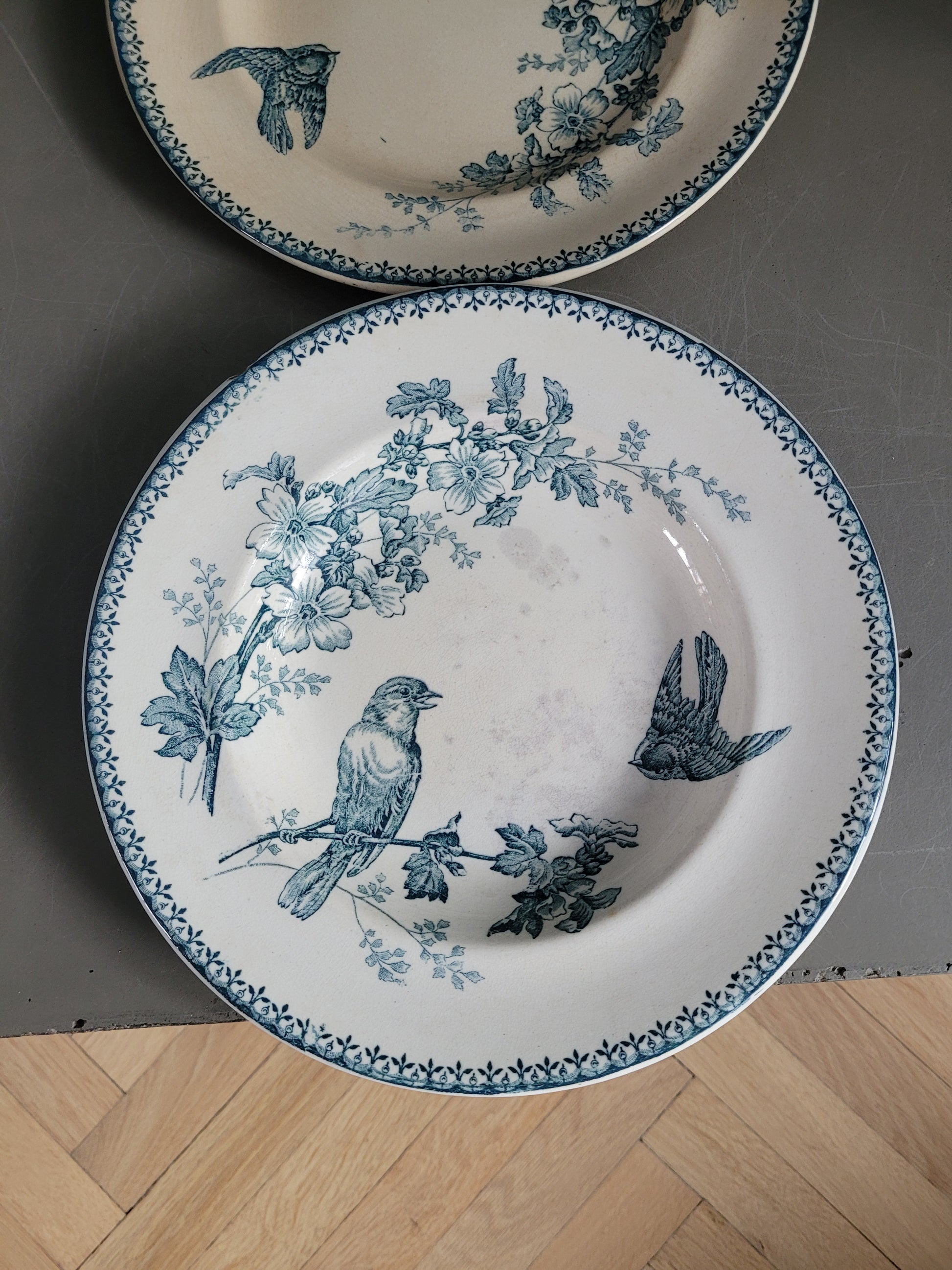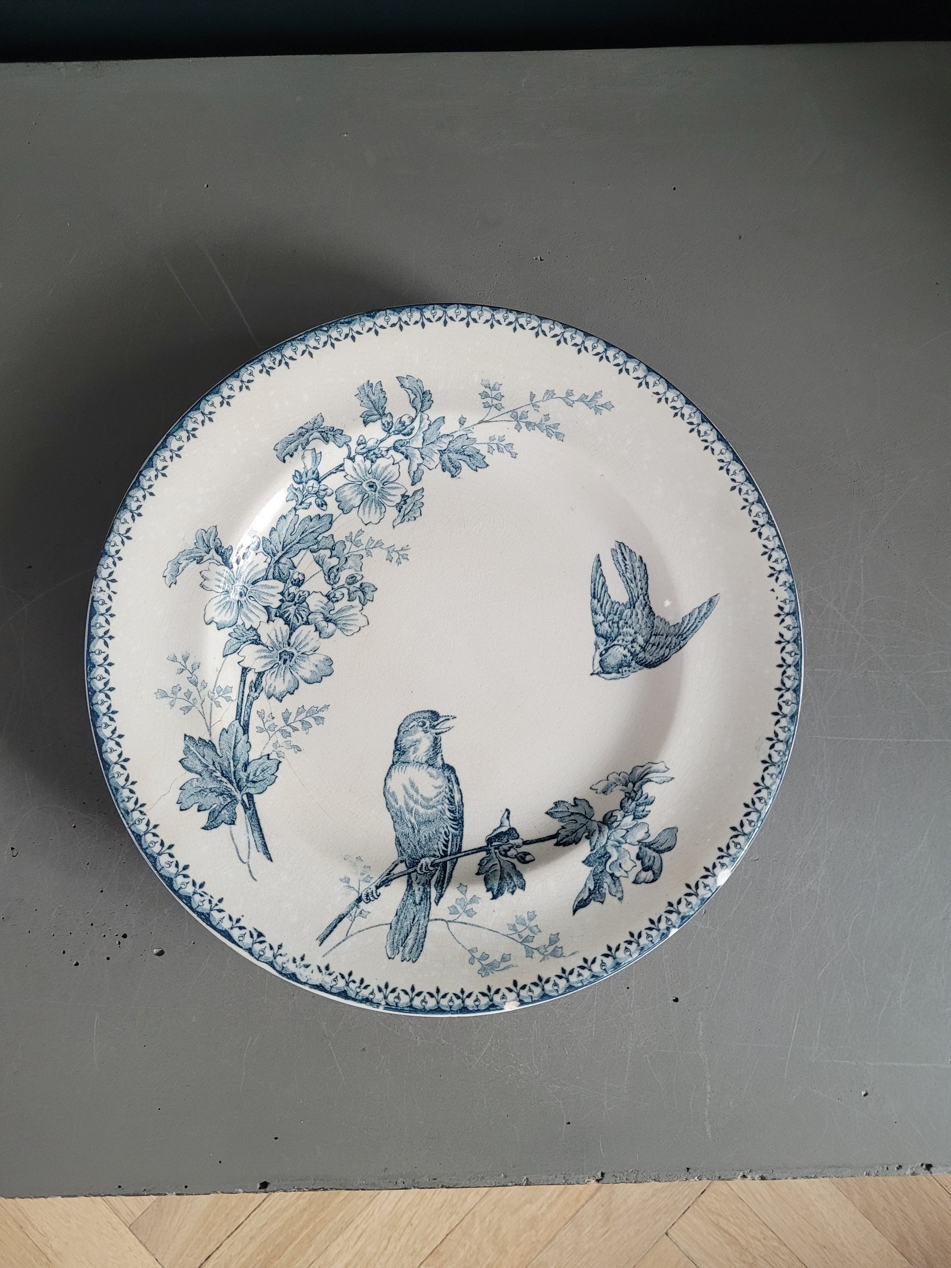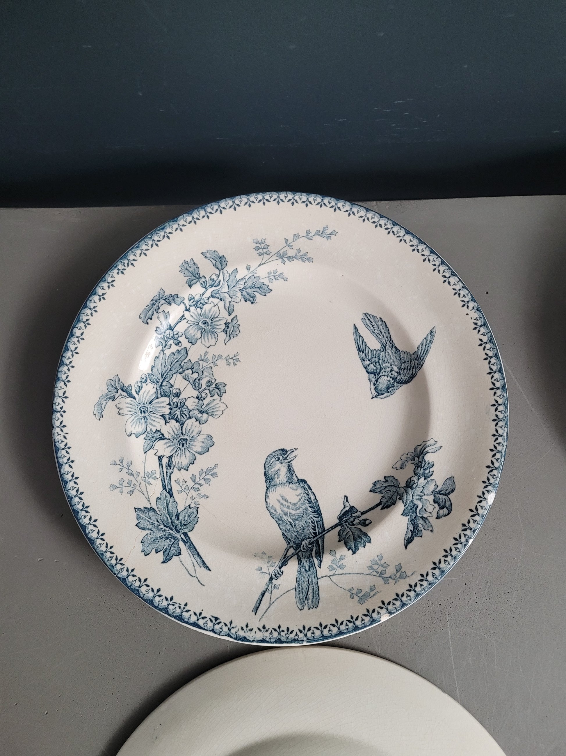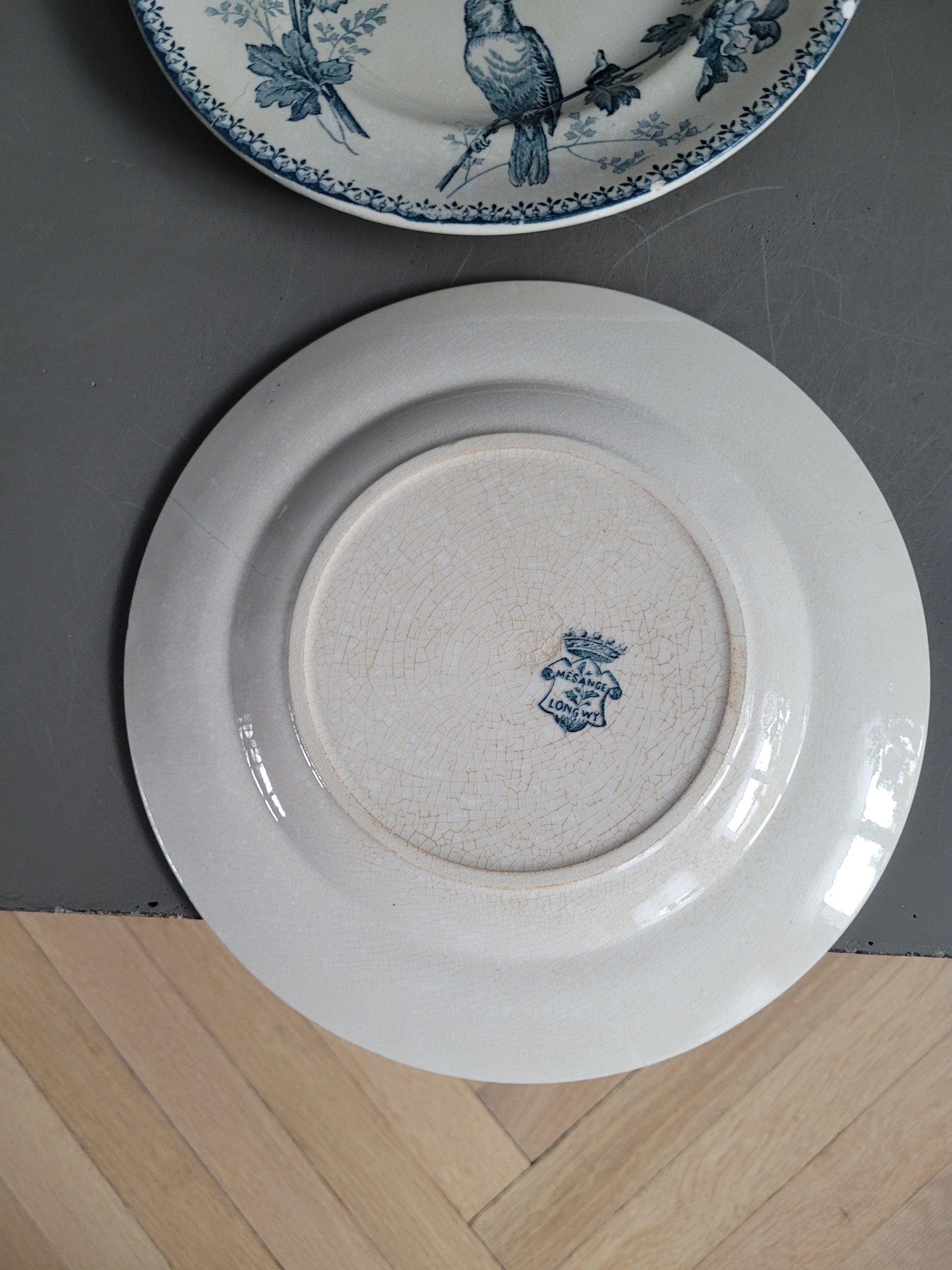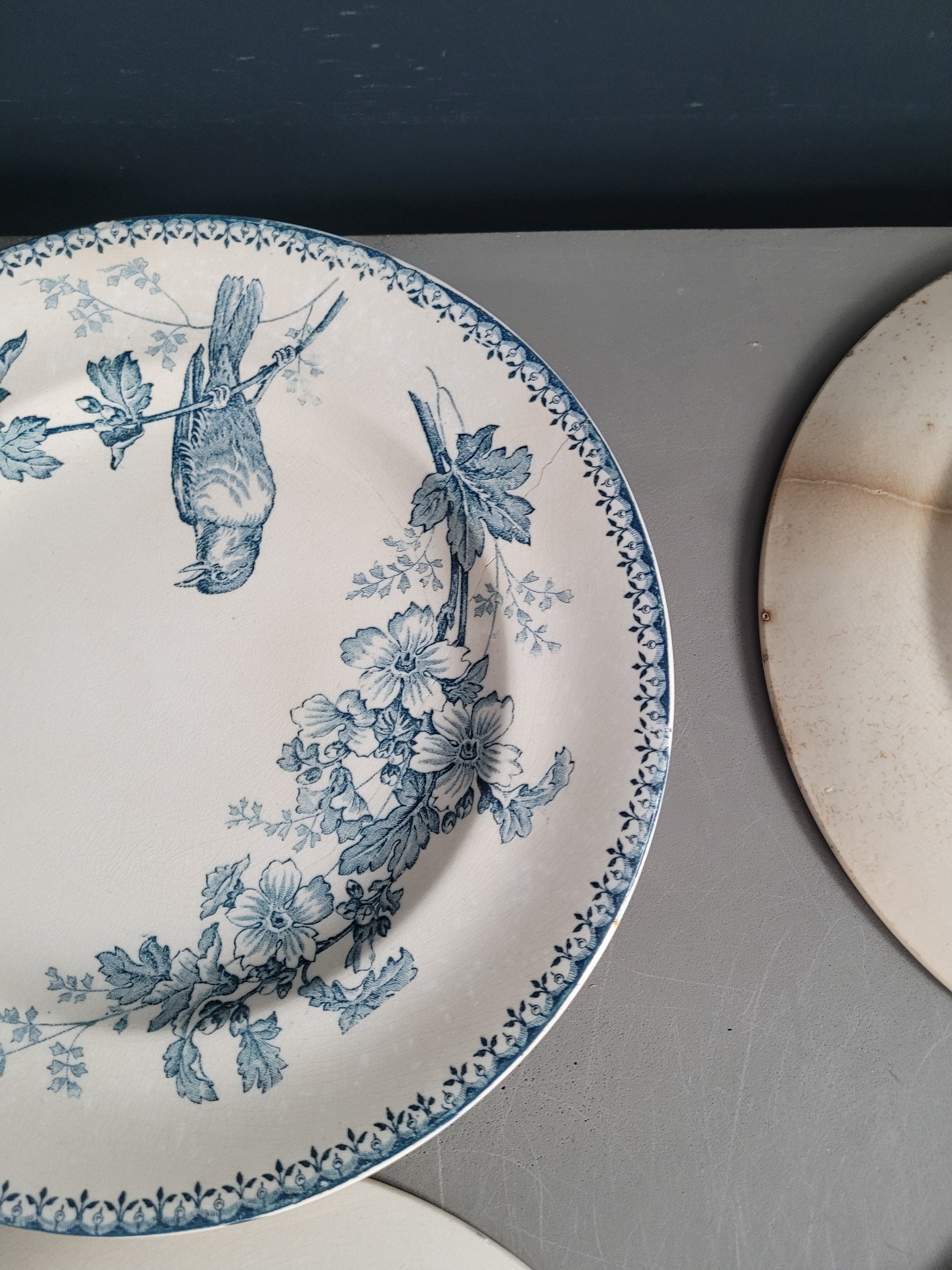 Les assiettes sont anciennes et dans leur jus. 2 des planches présentent des fissures. Elles ne semblent pas trop fragilisées et peuvent être utilisées telles quelles, et elles ont bien sûr gardées tout leur potentiel décoratif !
