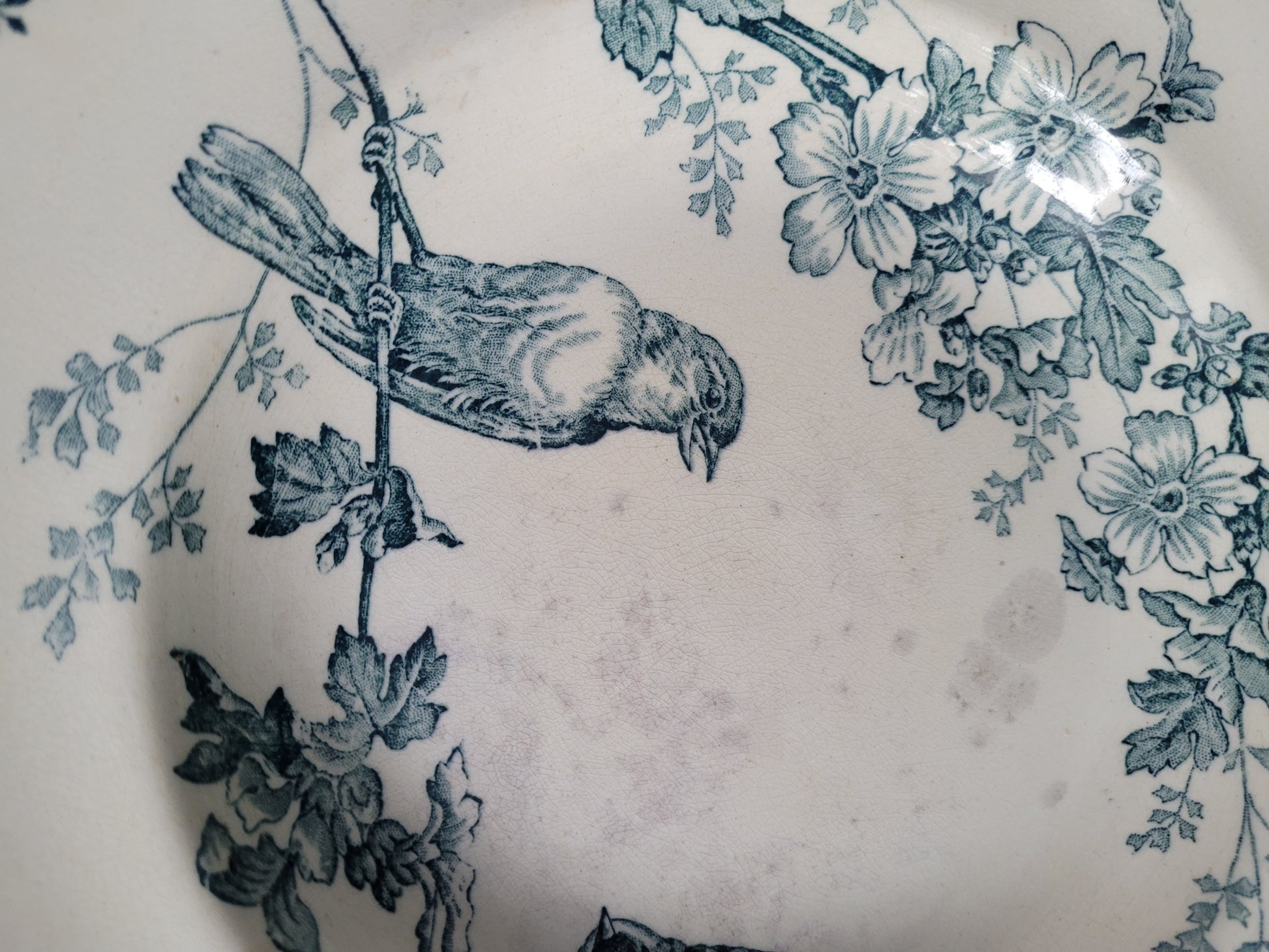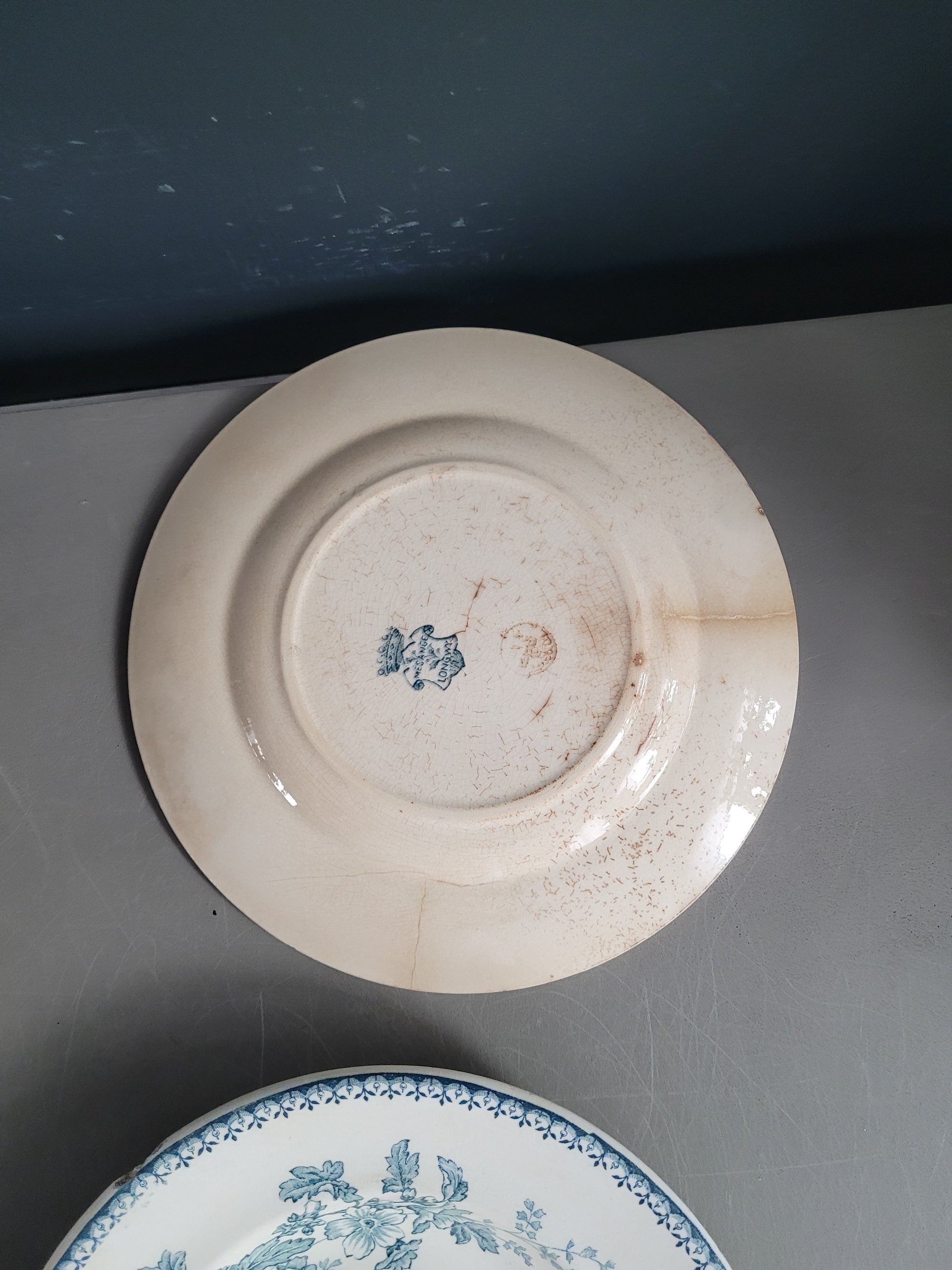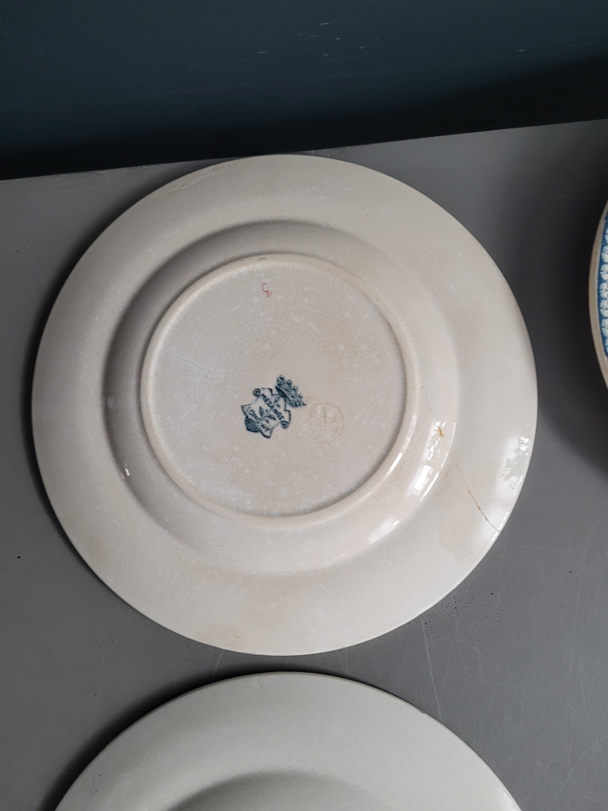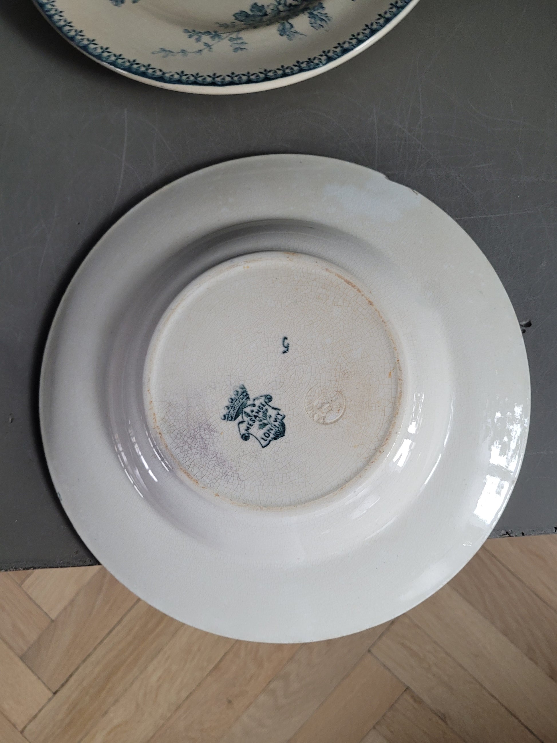 Les assiettes sont anciennes et dans leur jus. 2 des planches présentent des fissures. Elles ne semblent pas trop fragilisées et peuvent être utilisées telles quelles, et elles ont bien sûr gardées tout leur potentiel décoratif !