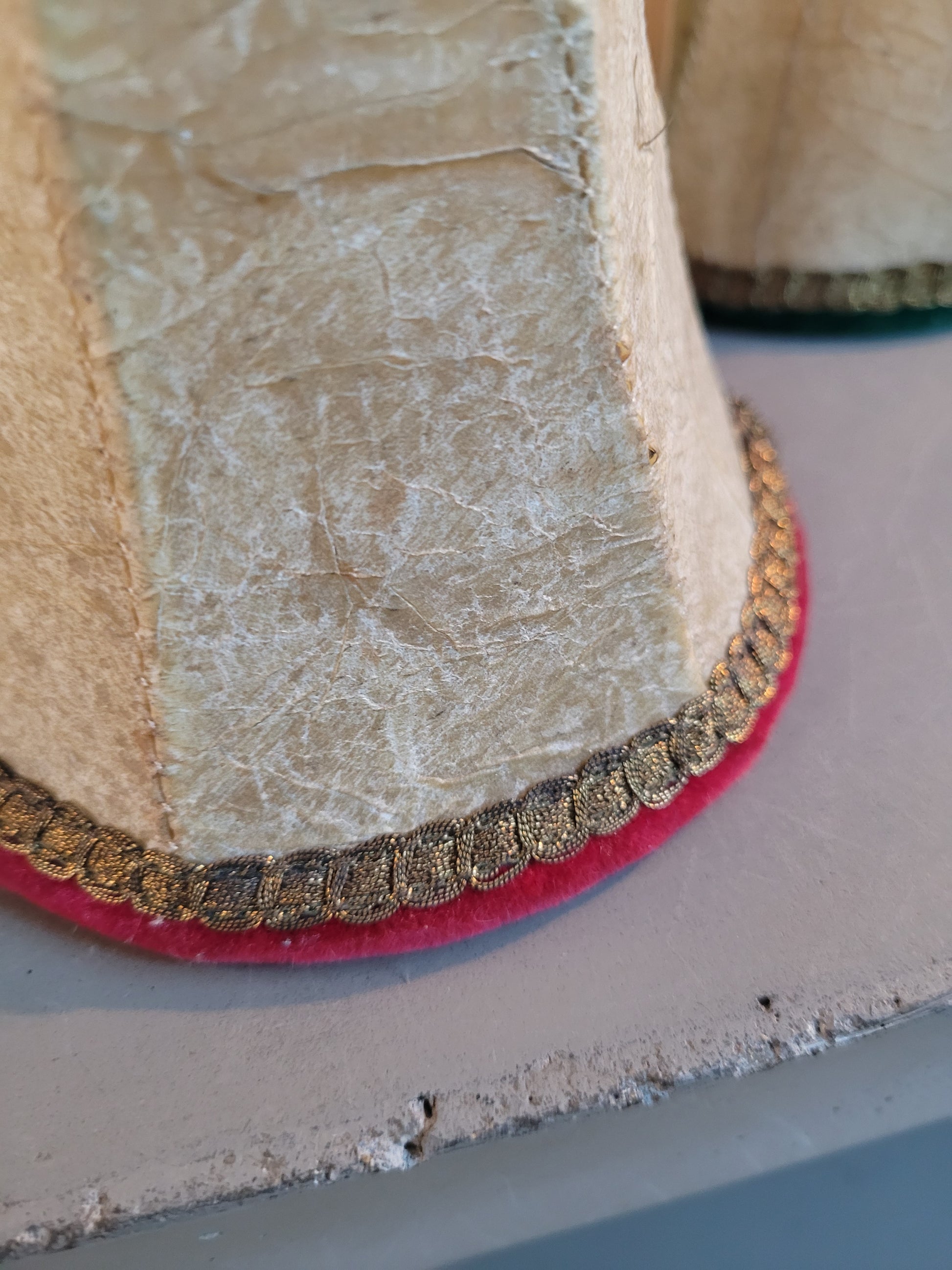 En tissus satiné ou vessie de porc selon les modèles, de différentes formes et couleurs, voir photos.