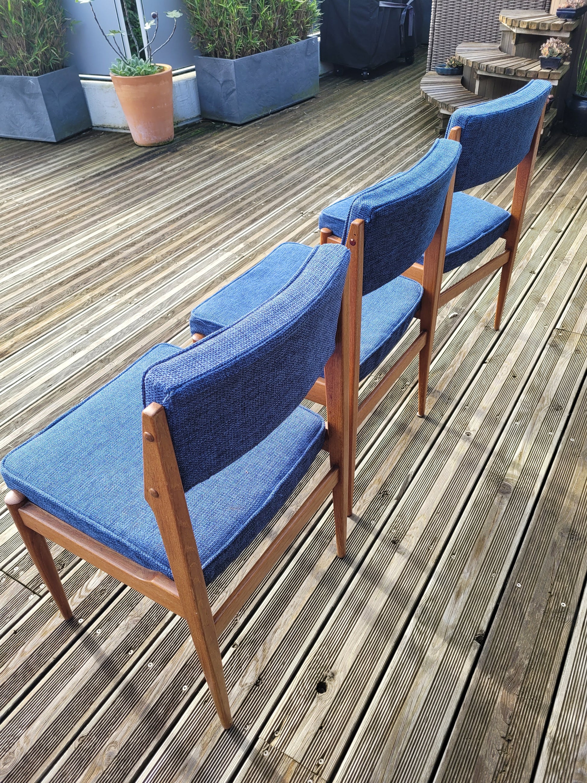 Lot de 3 chaises vintage, assise matelassée recouverte de tissu épais bleu électrique.