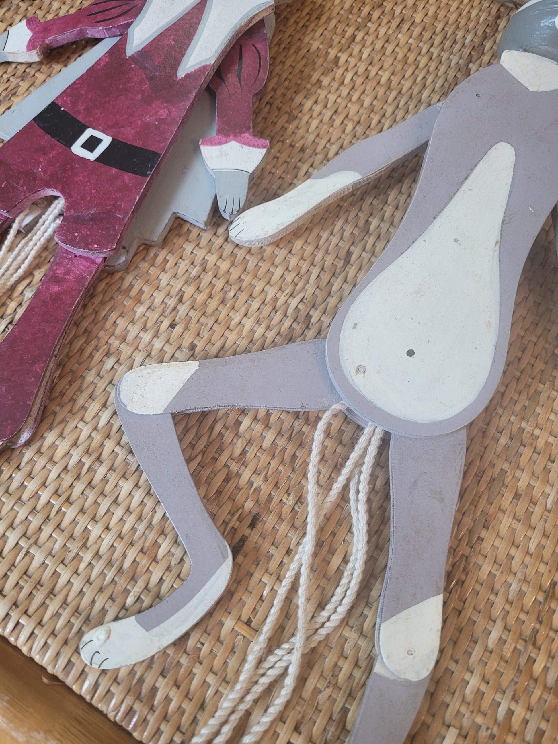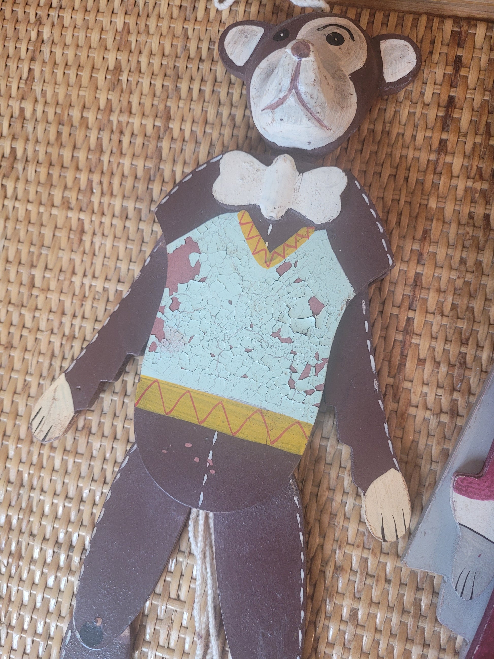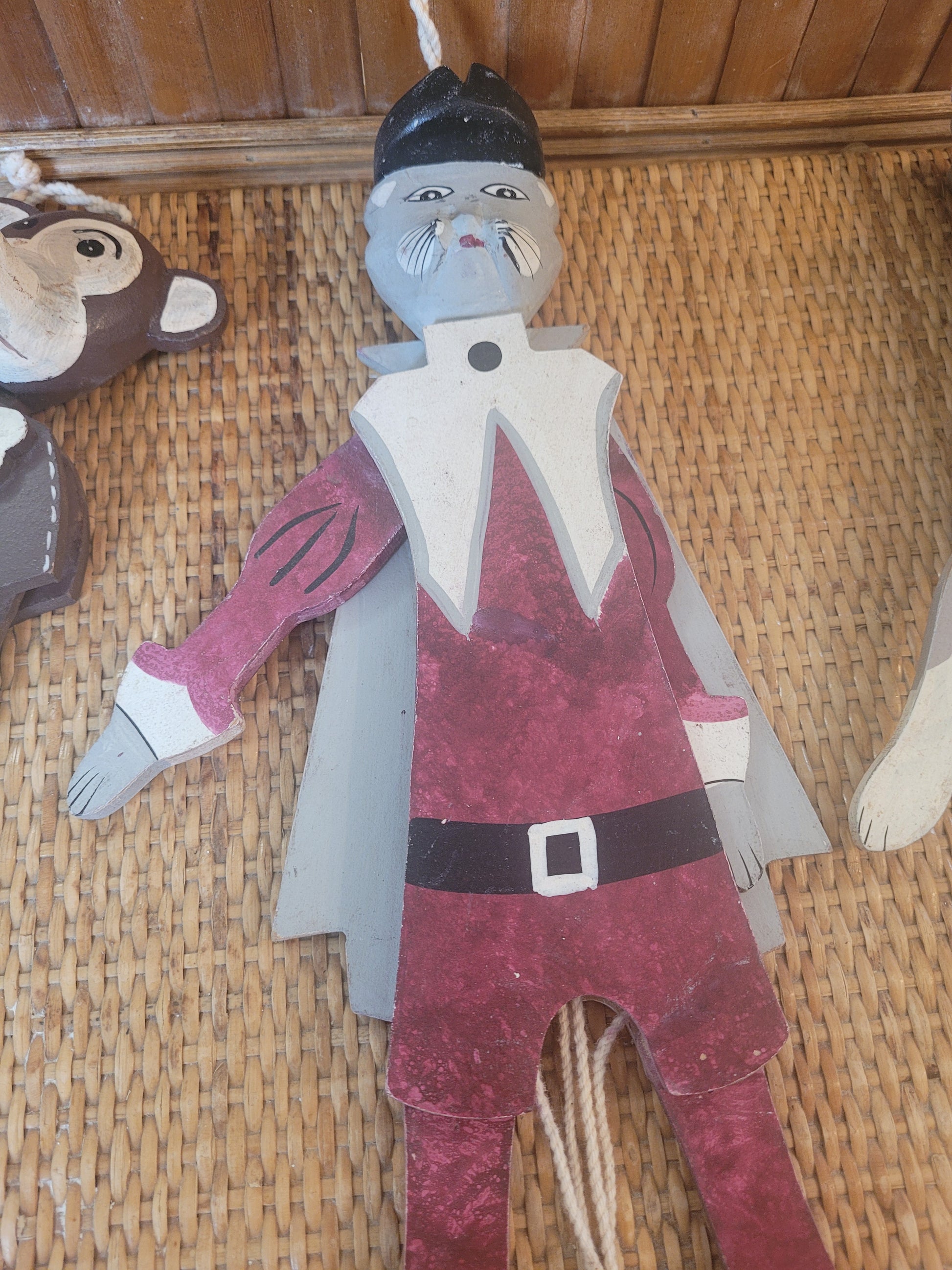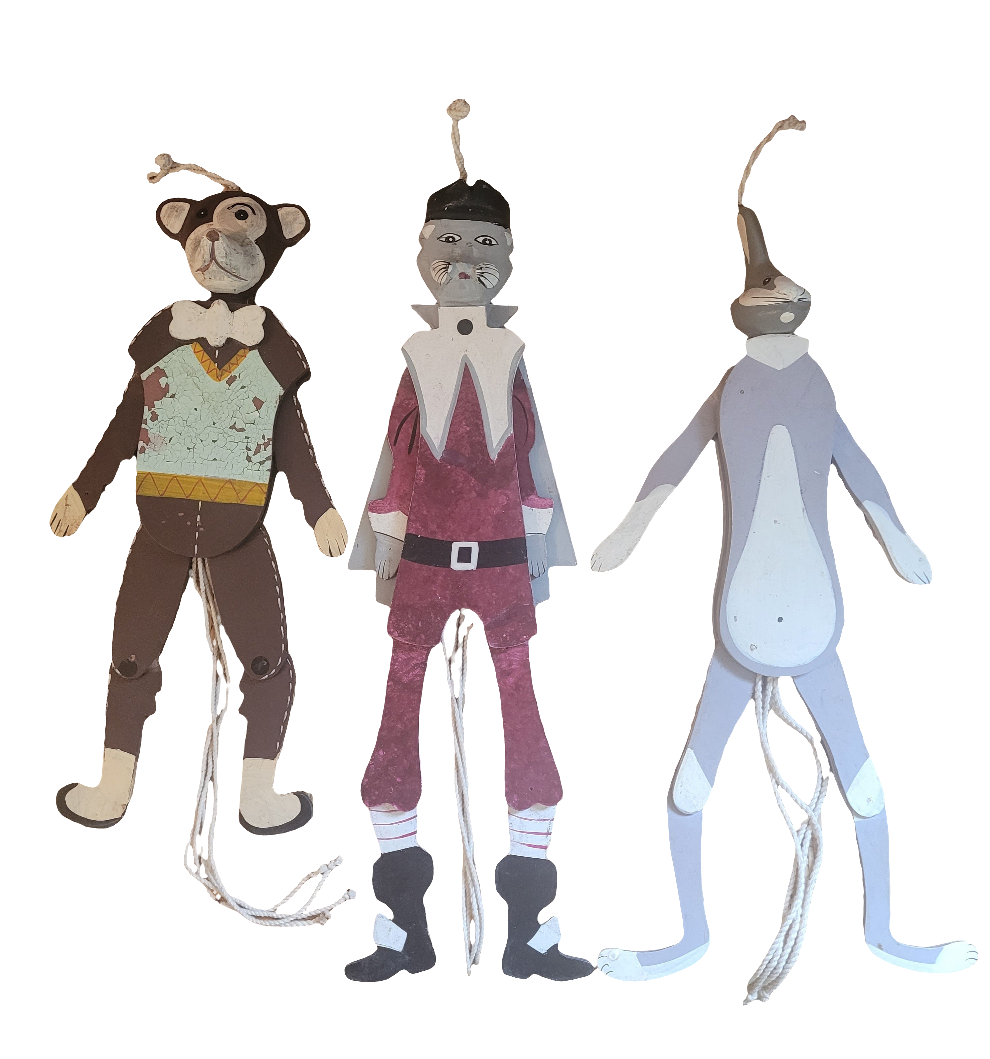 Magnifique lot de 3 marionnettes à fils articulées en bois peint à la main, avec des têtes d'animaux ( singe chat et lapin)