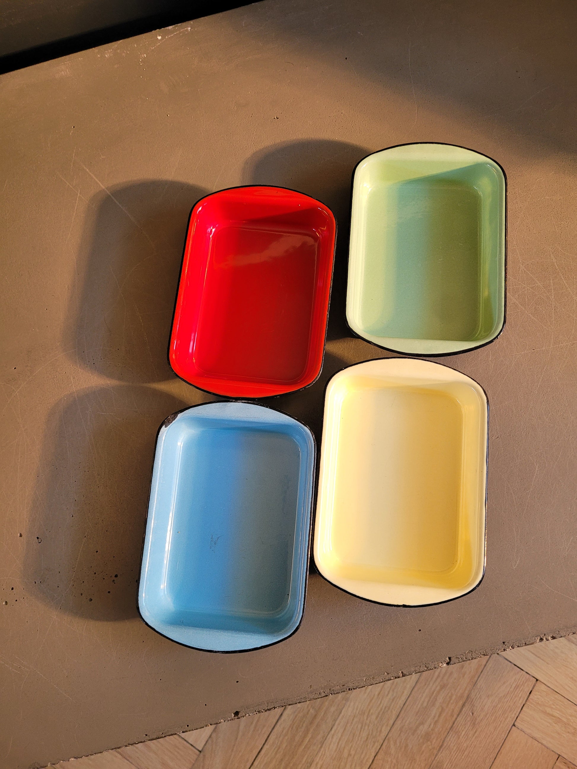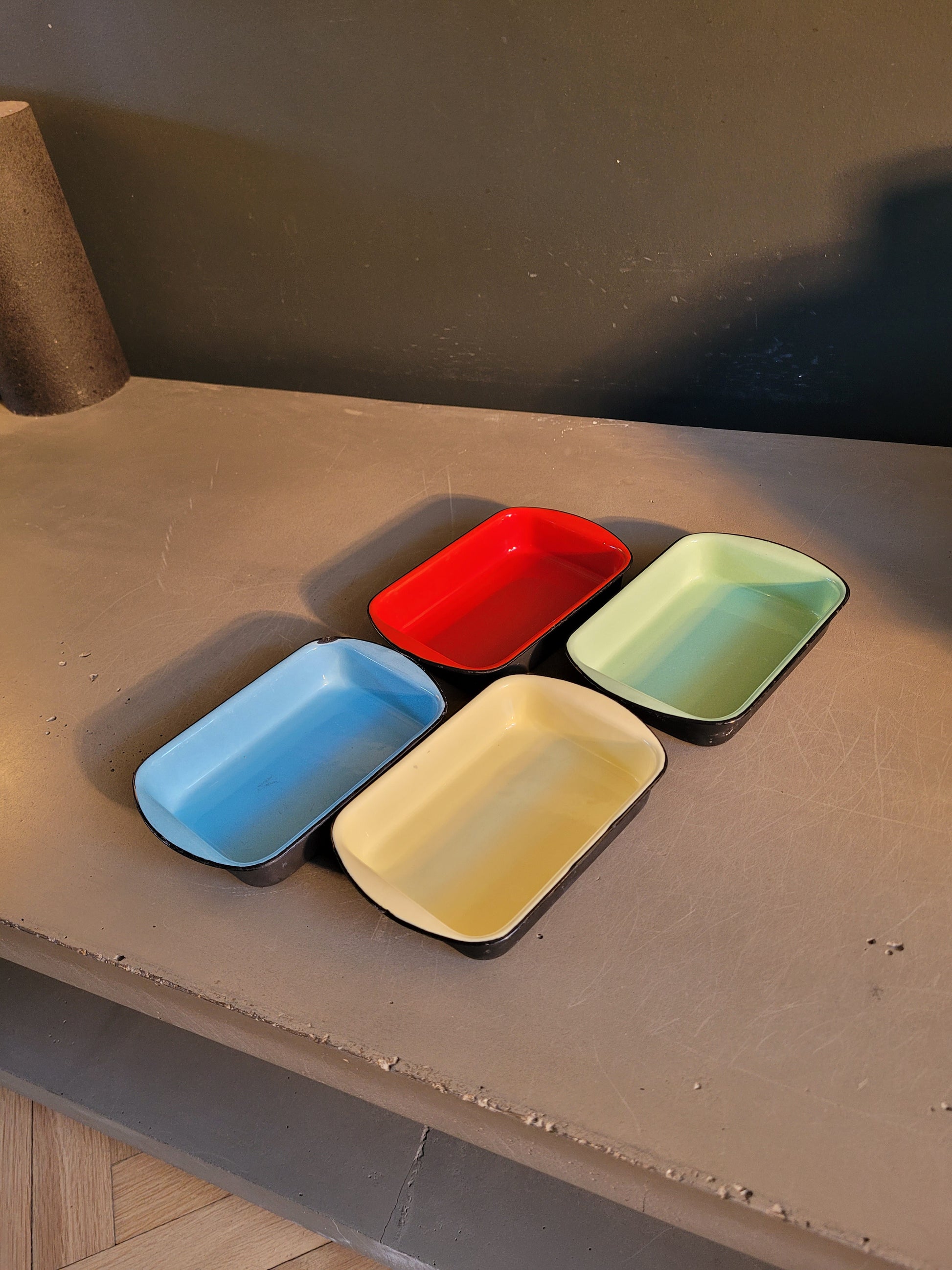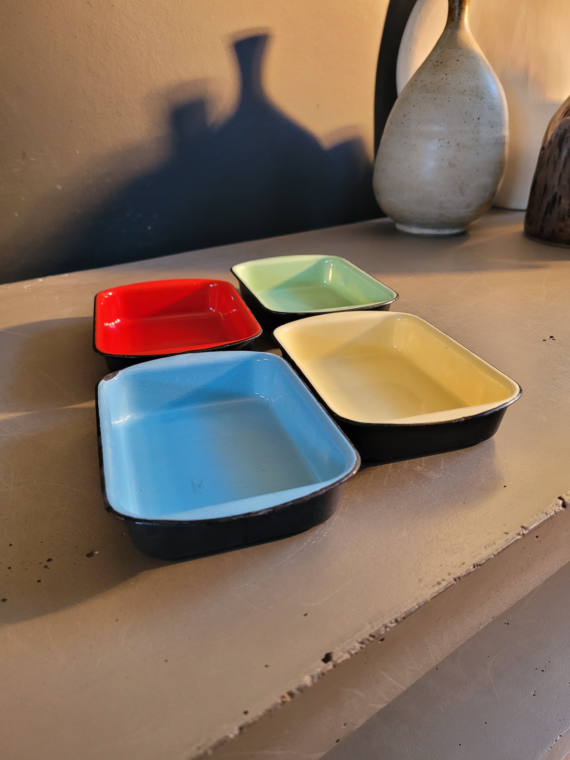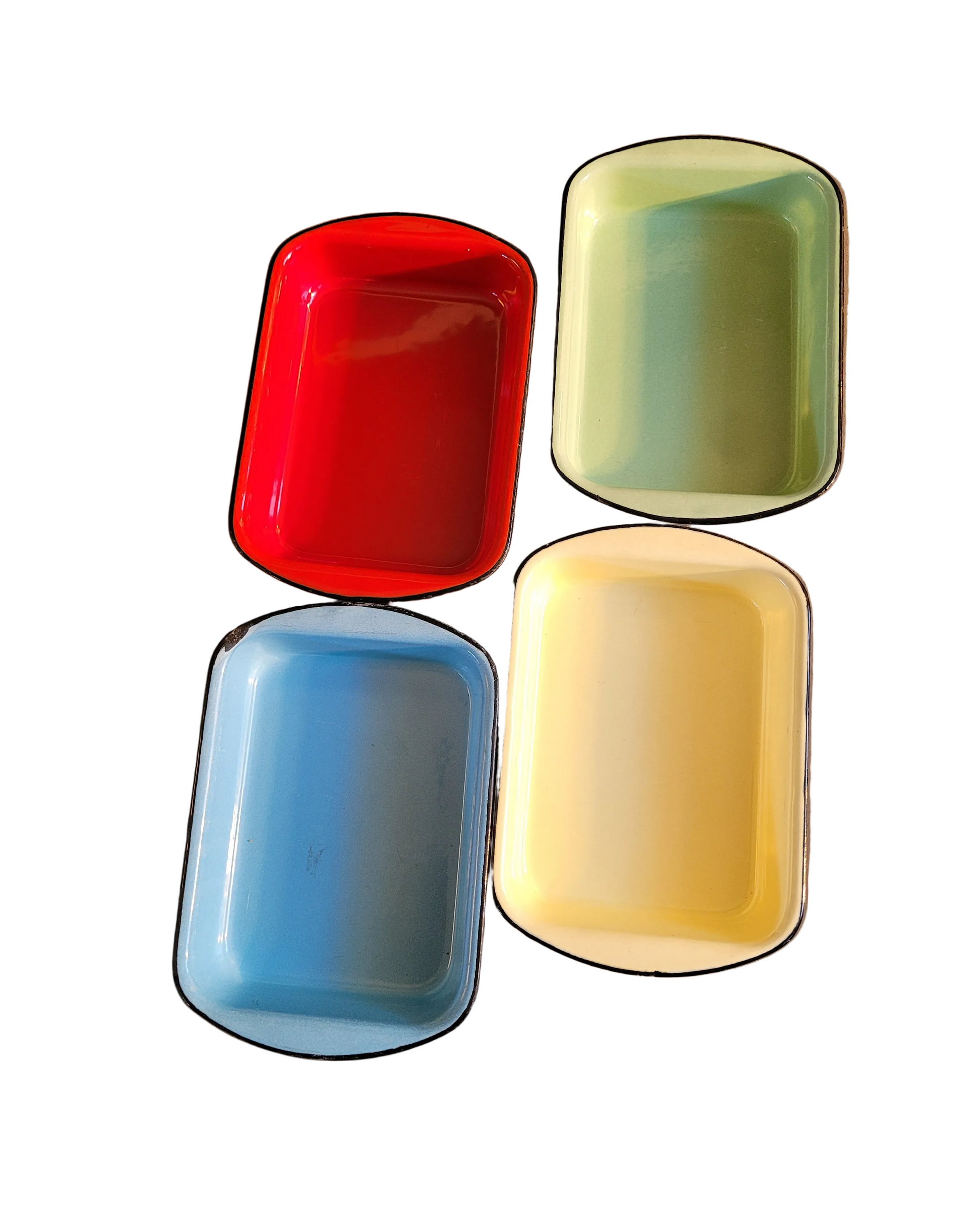 Très bel ensemble vintage de 4 petits plats en fonte noire émaillée de 4 couleurs différentes.