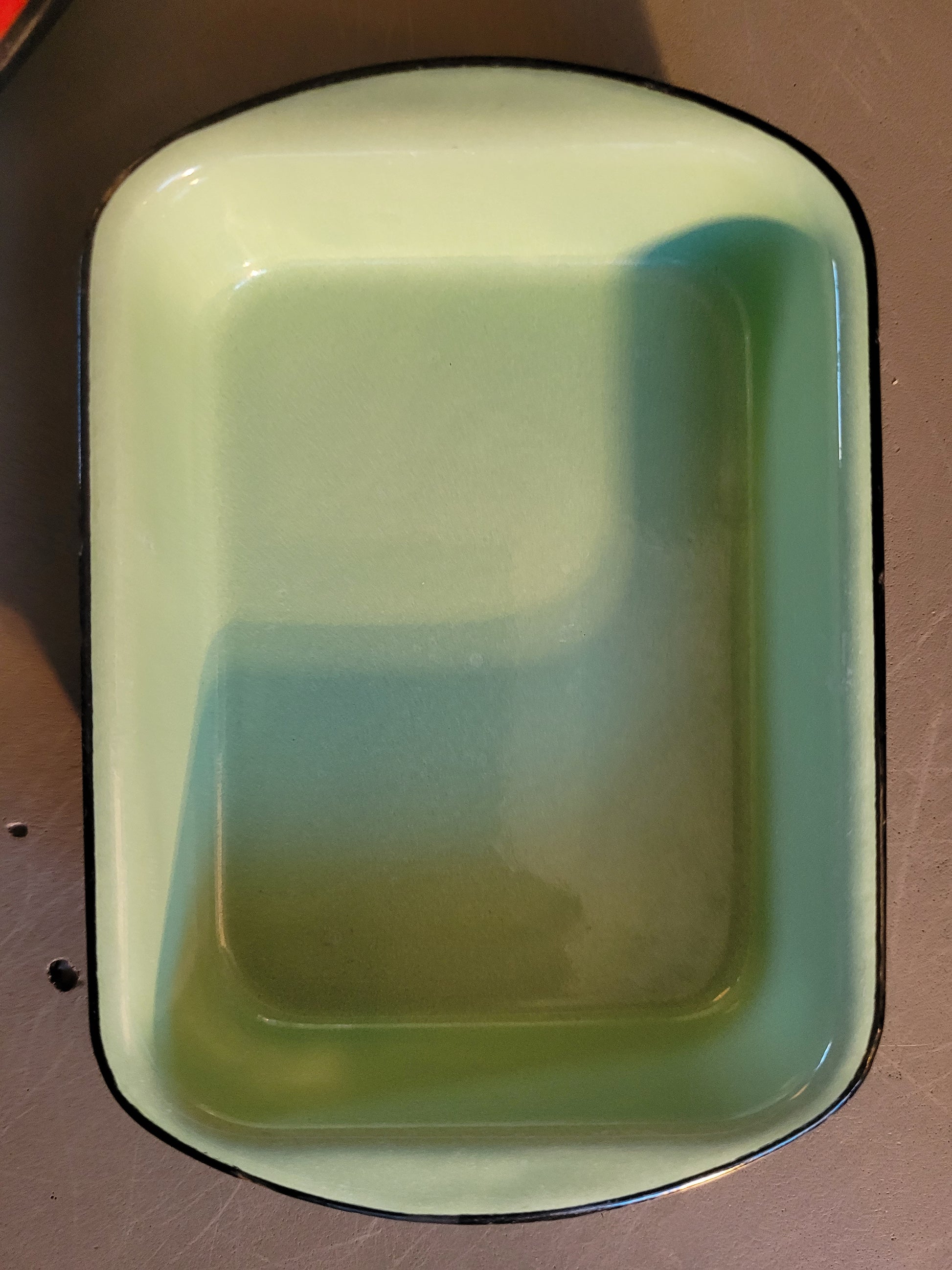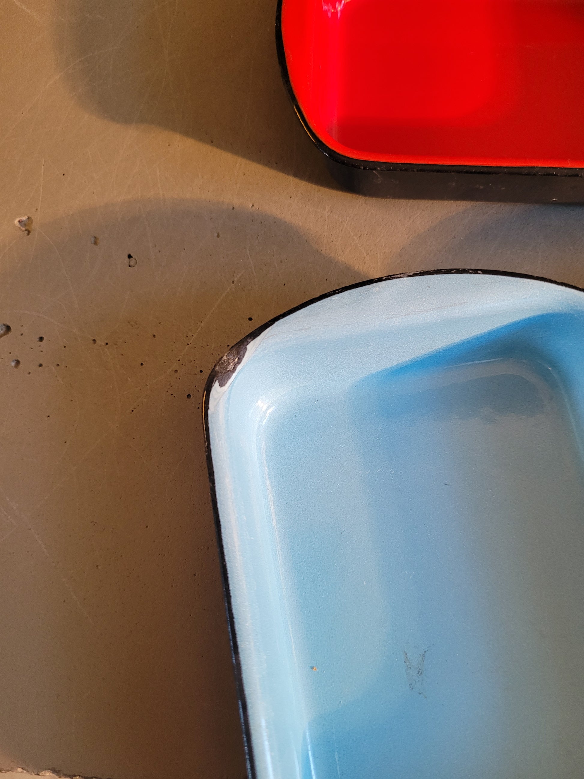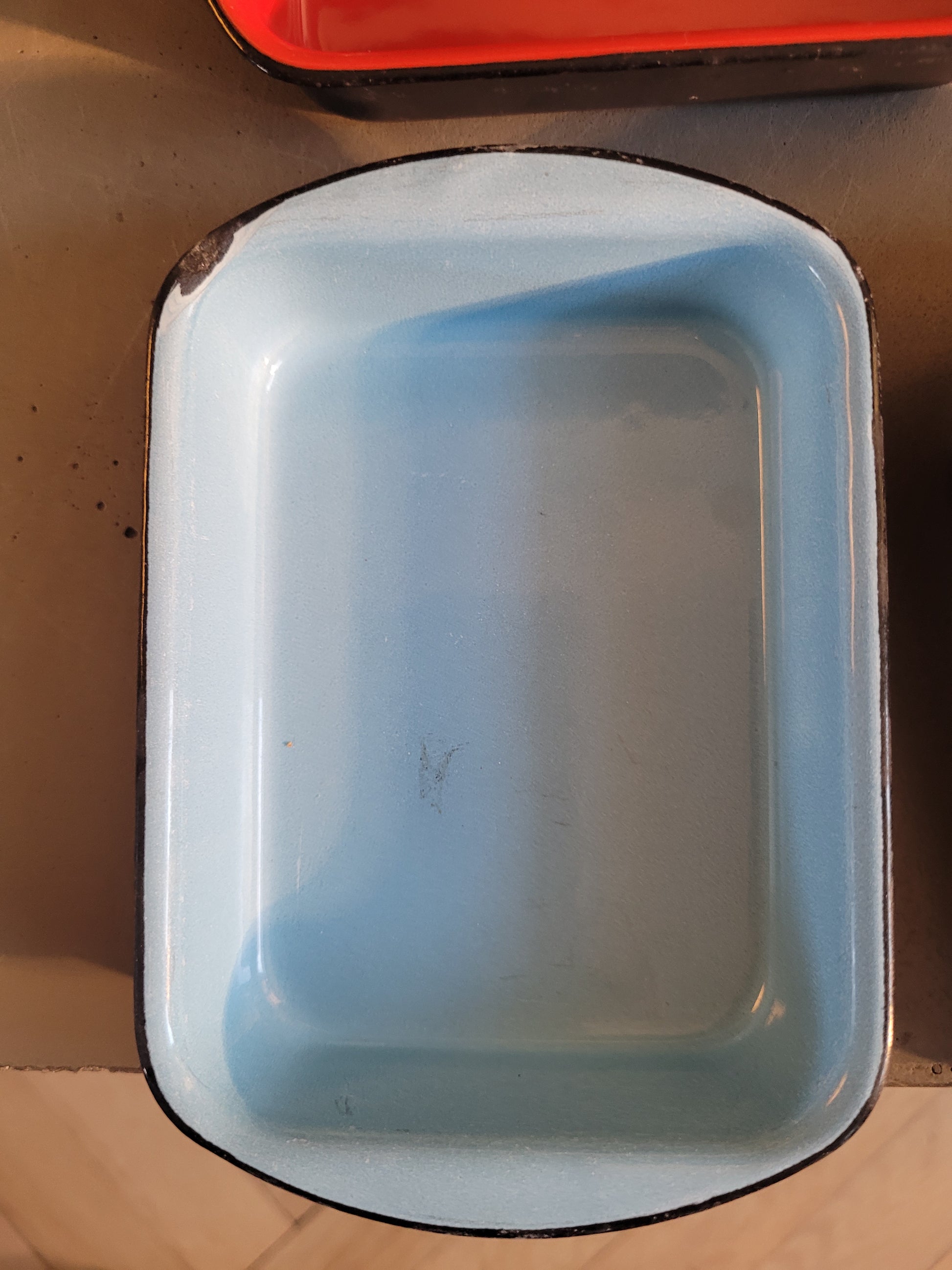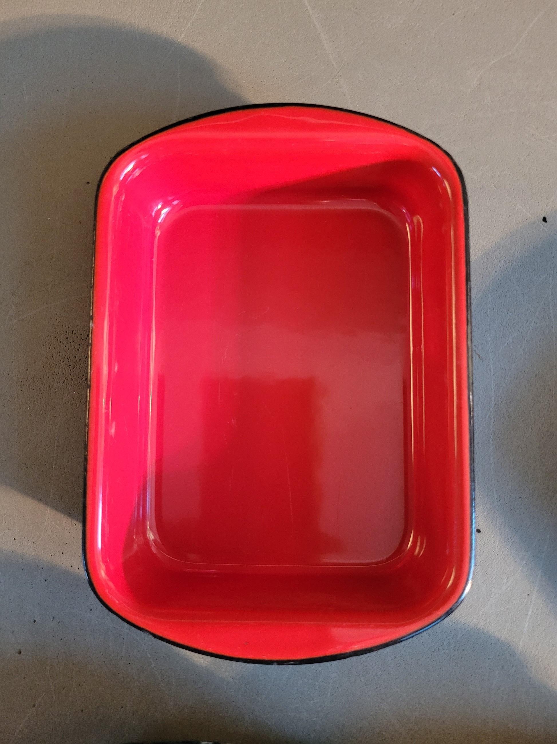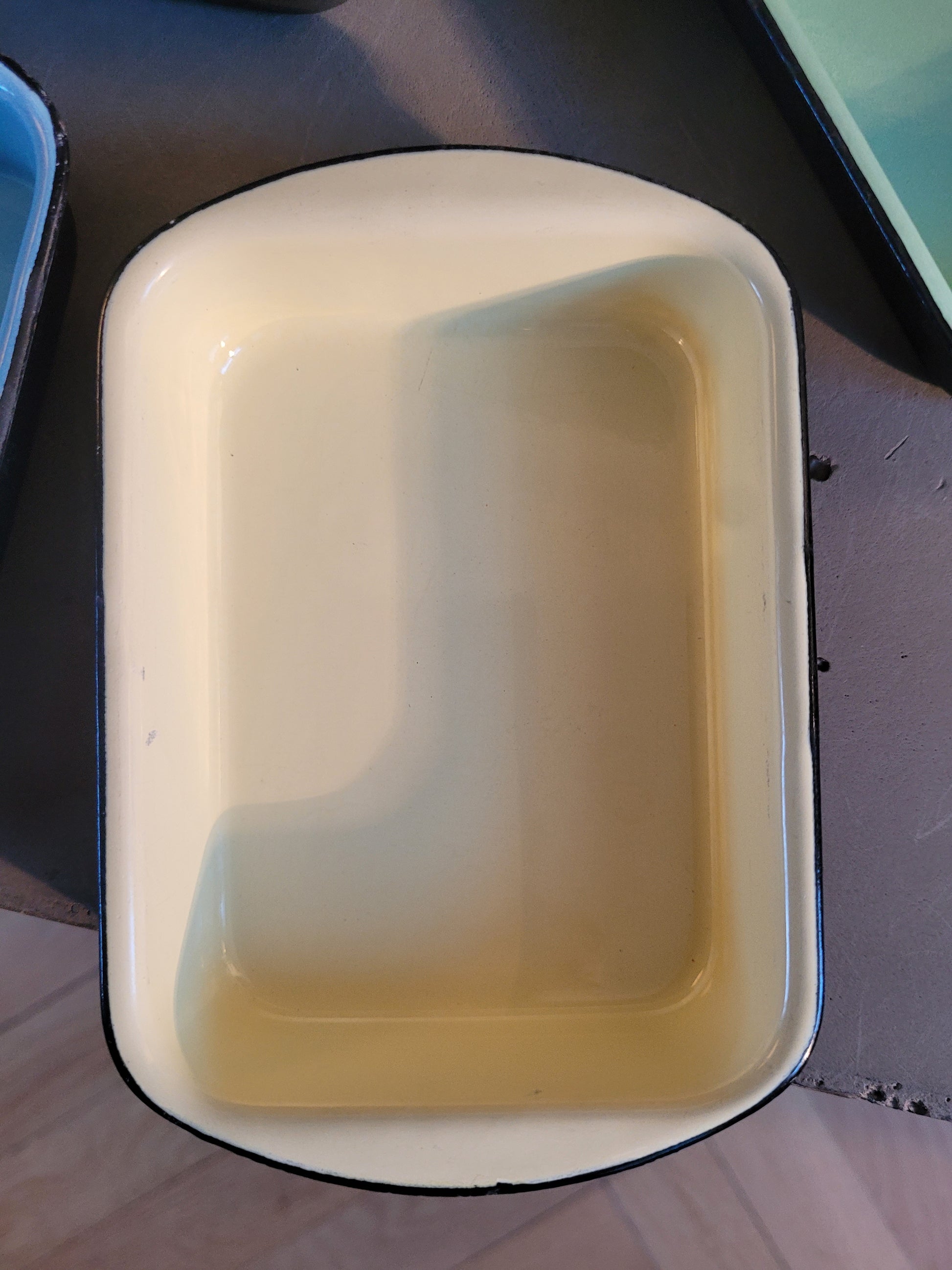 Très bel ensemble vintage de 4 petits plats en fonte noire émaillée de 4 couleurs différentes.