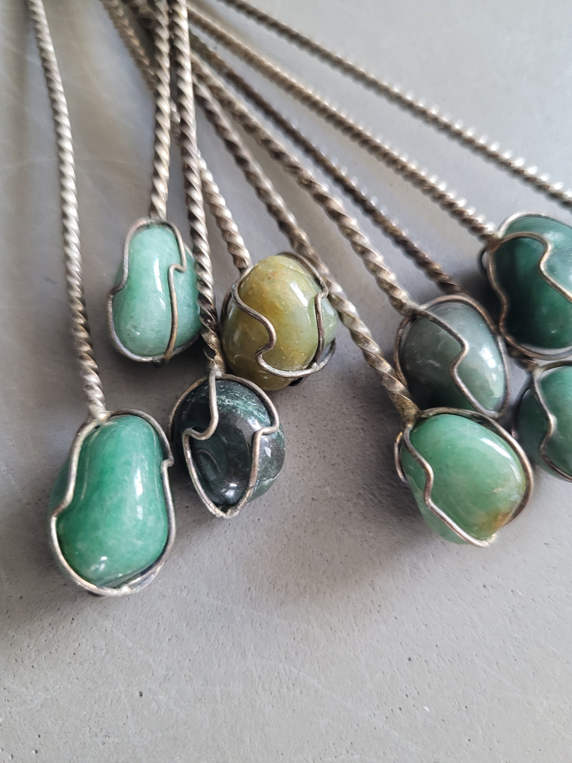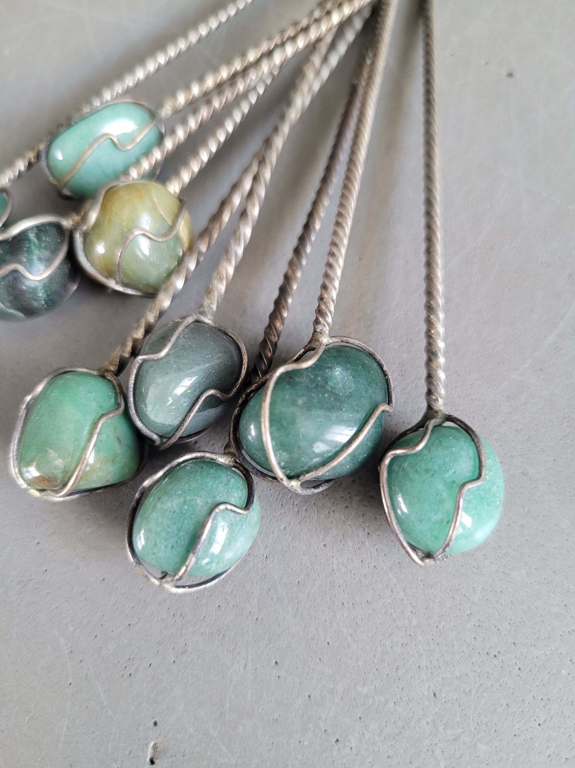Lot de 9 piques à apéritif en métal argenté torsadé et pierres semi-précieuses.