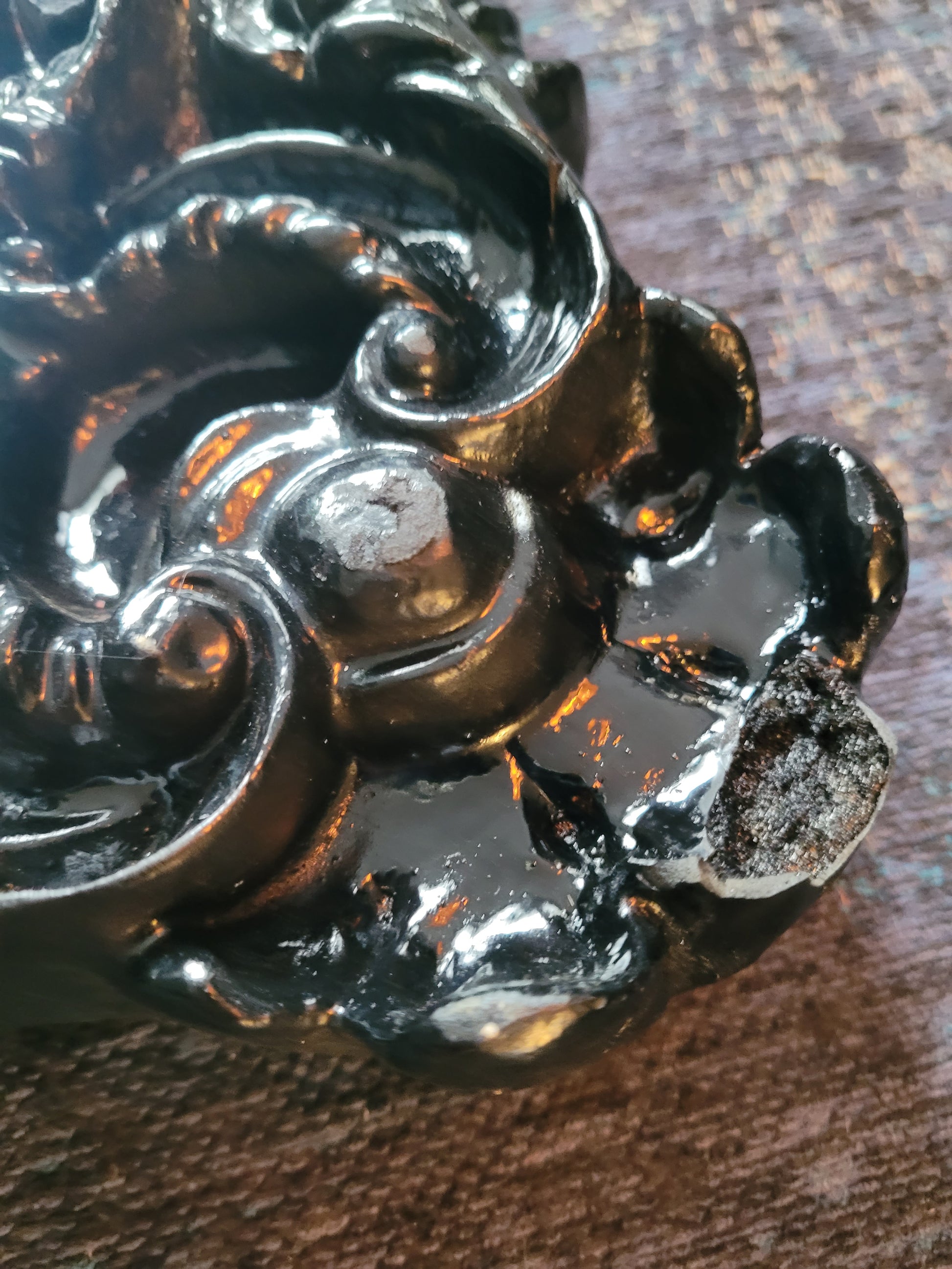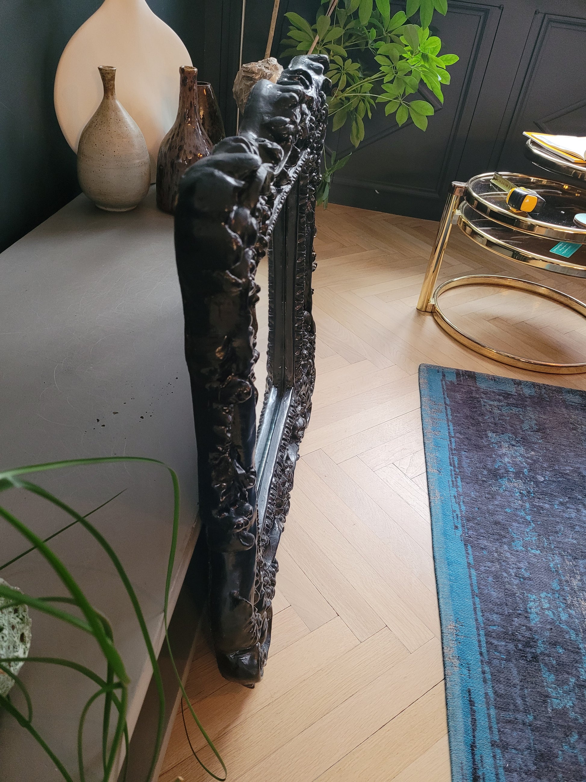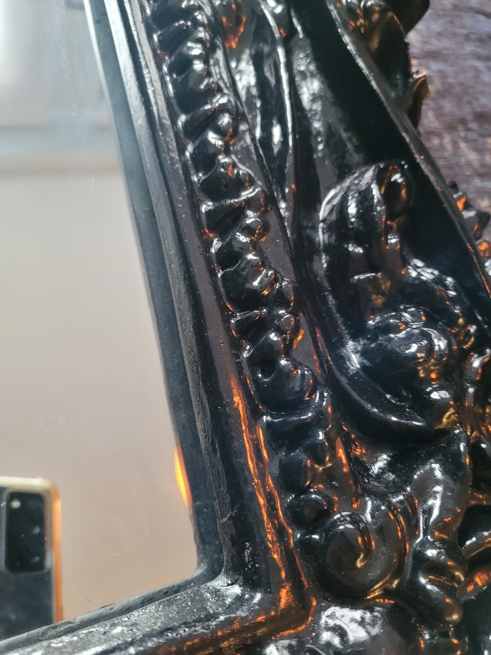 La peinture noire brillante souligne les volumes et les motifs richement ouvragés du décor.