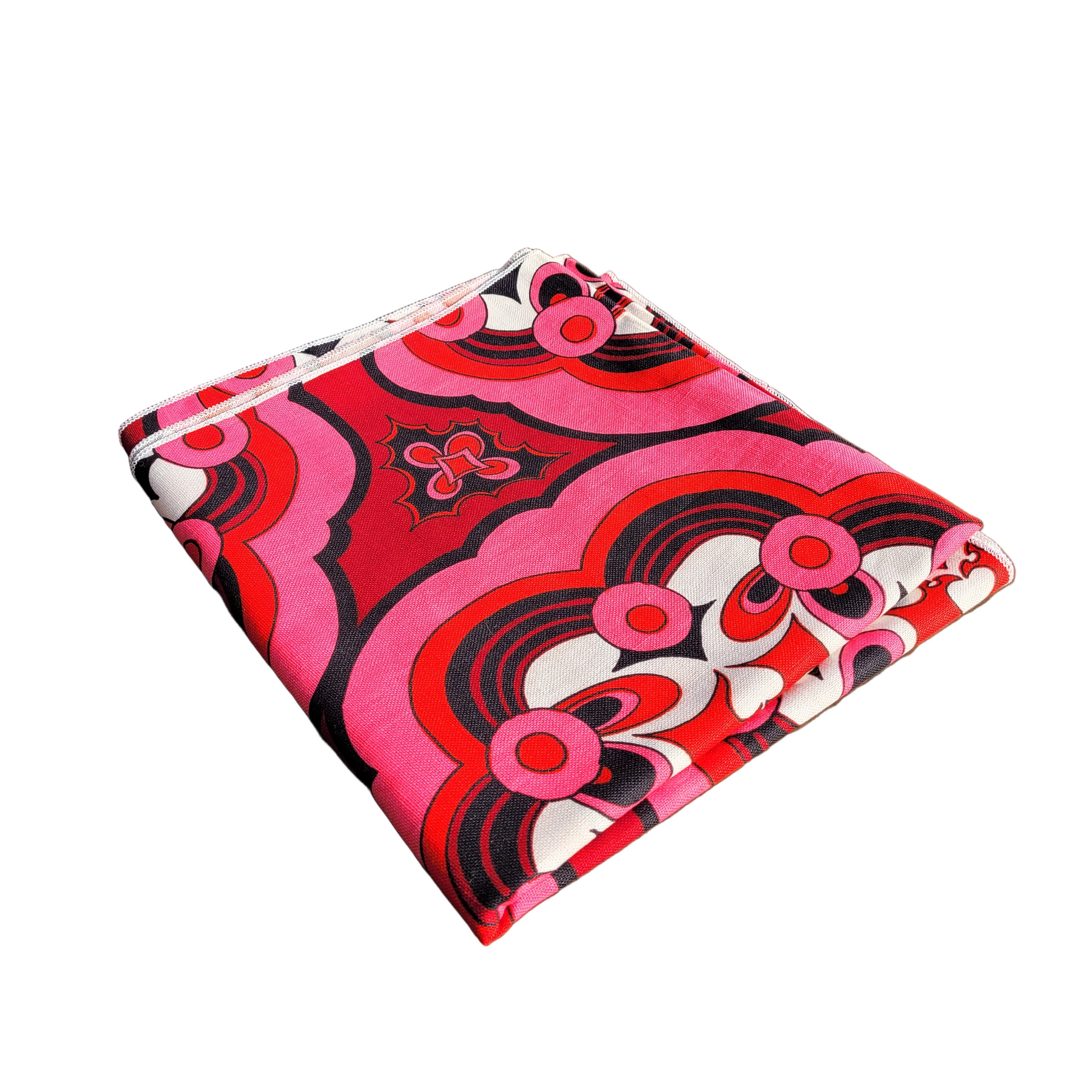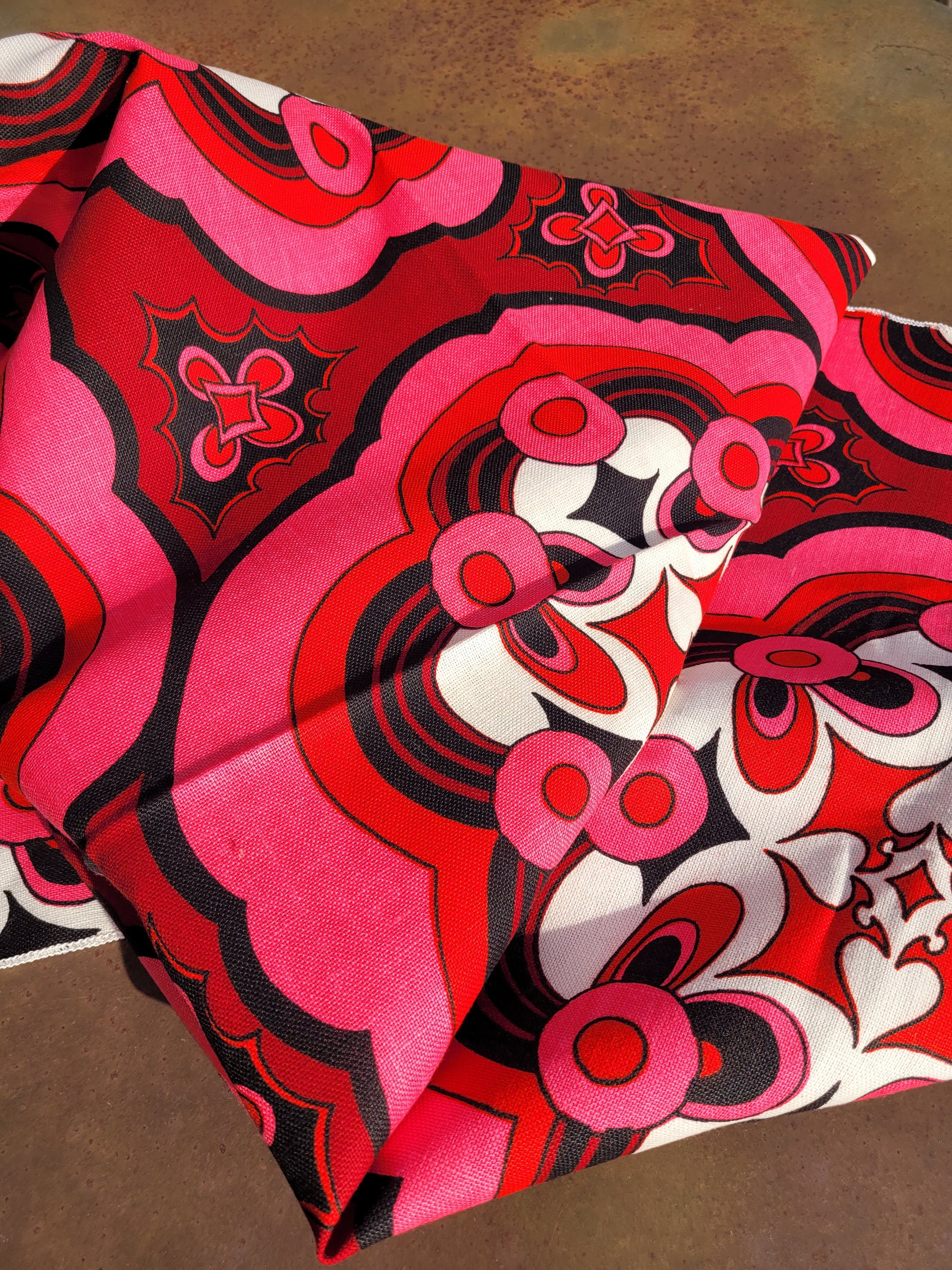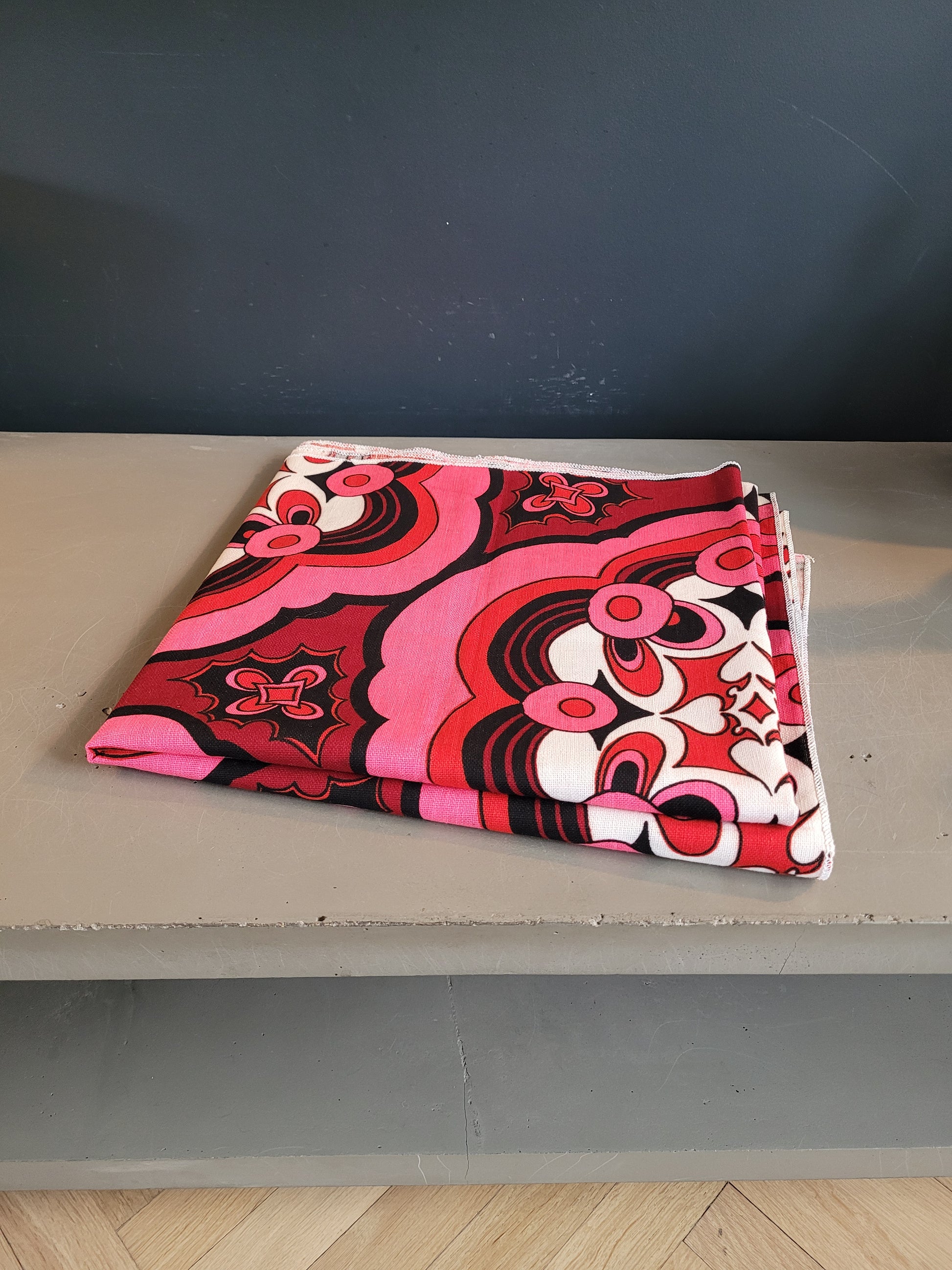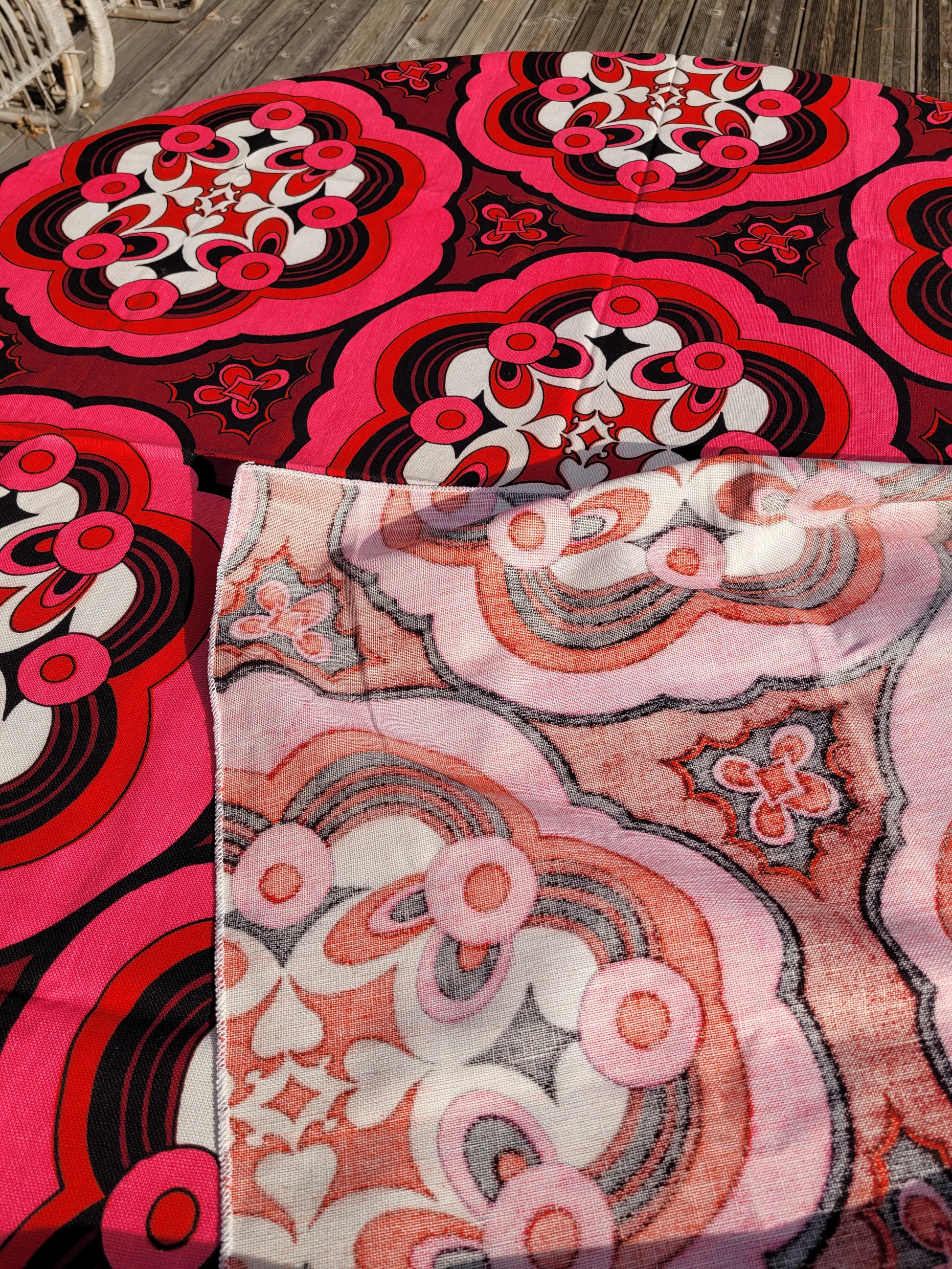 Sublime nappe en tissus imprimés vintage, dans les tons rose/rouge/prune/noir et blanc.