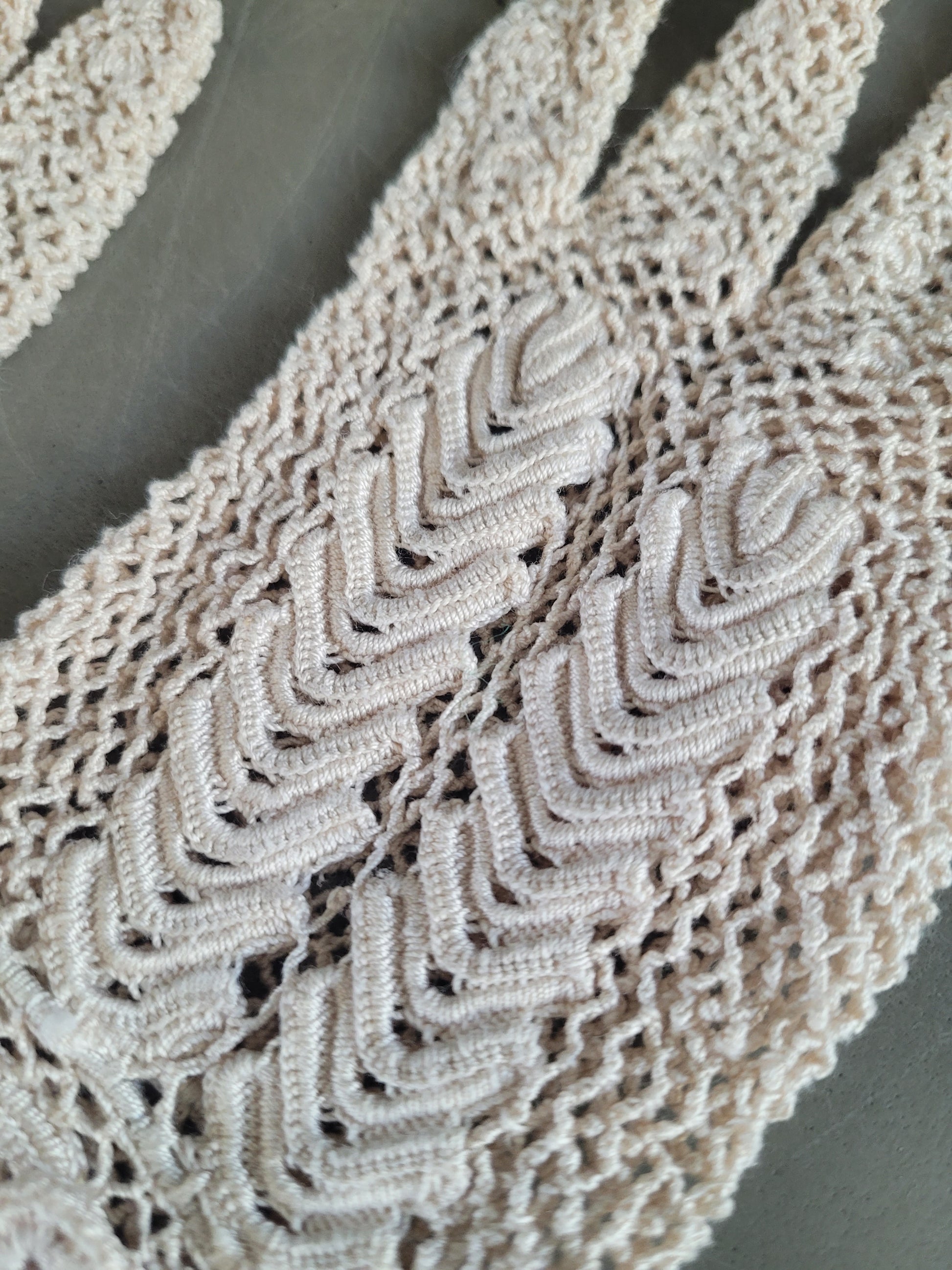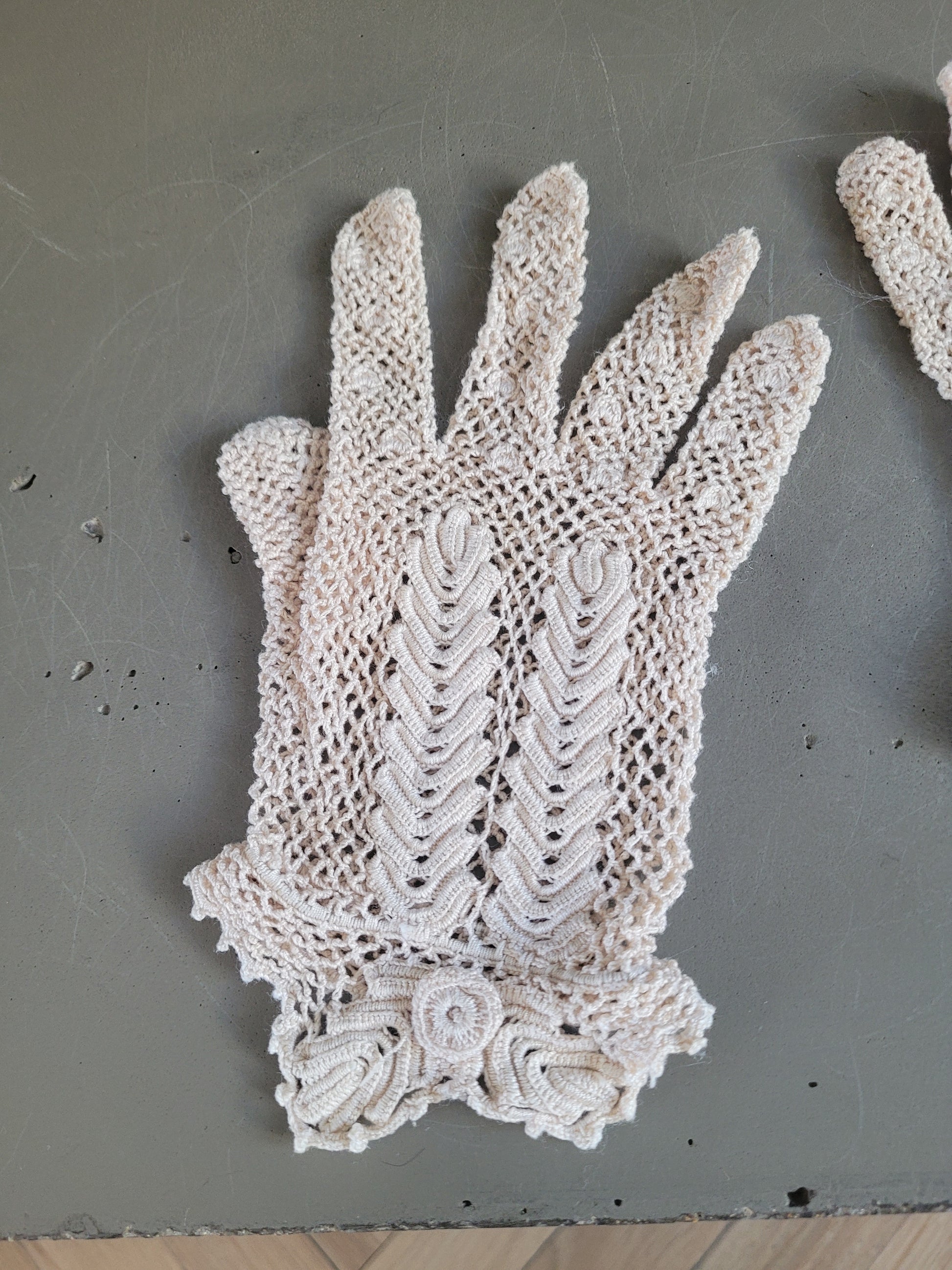 Délicats et infiniment poétiques, ces gants anciens en fil crème sont entièrement réalisés au crochet, avec un remarquable travail ajouré.