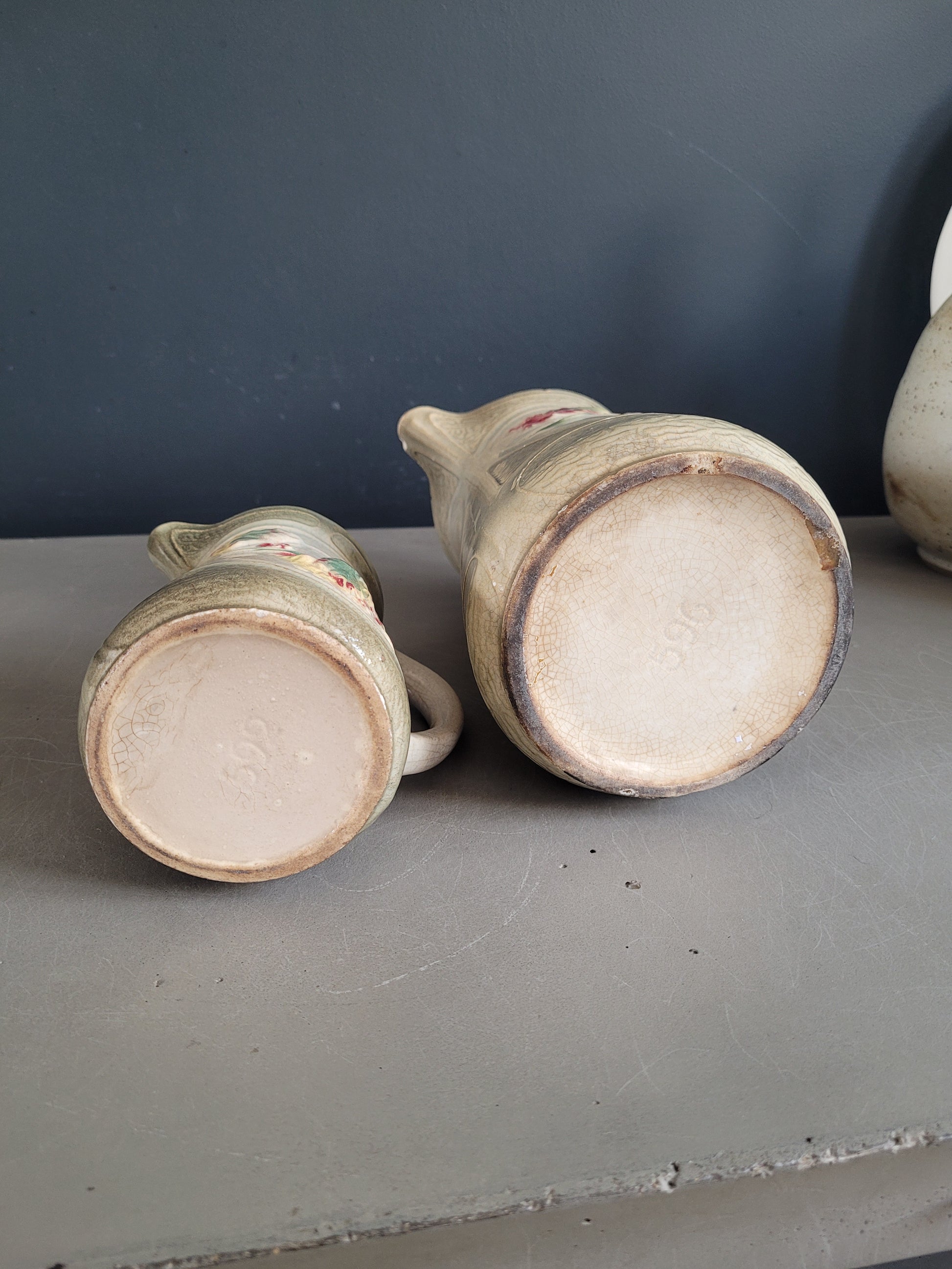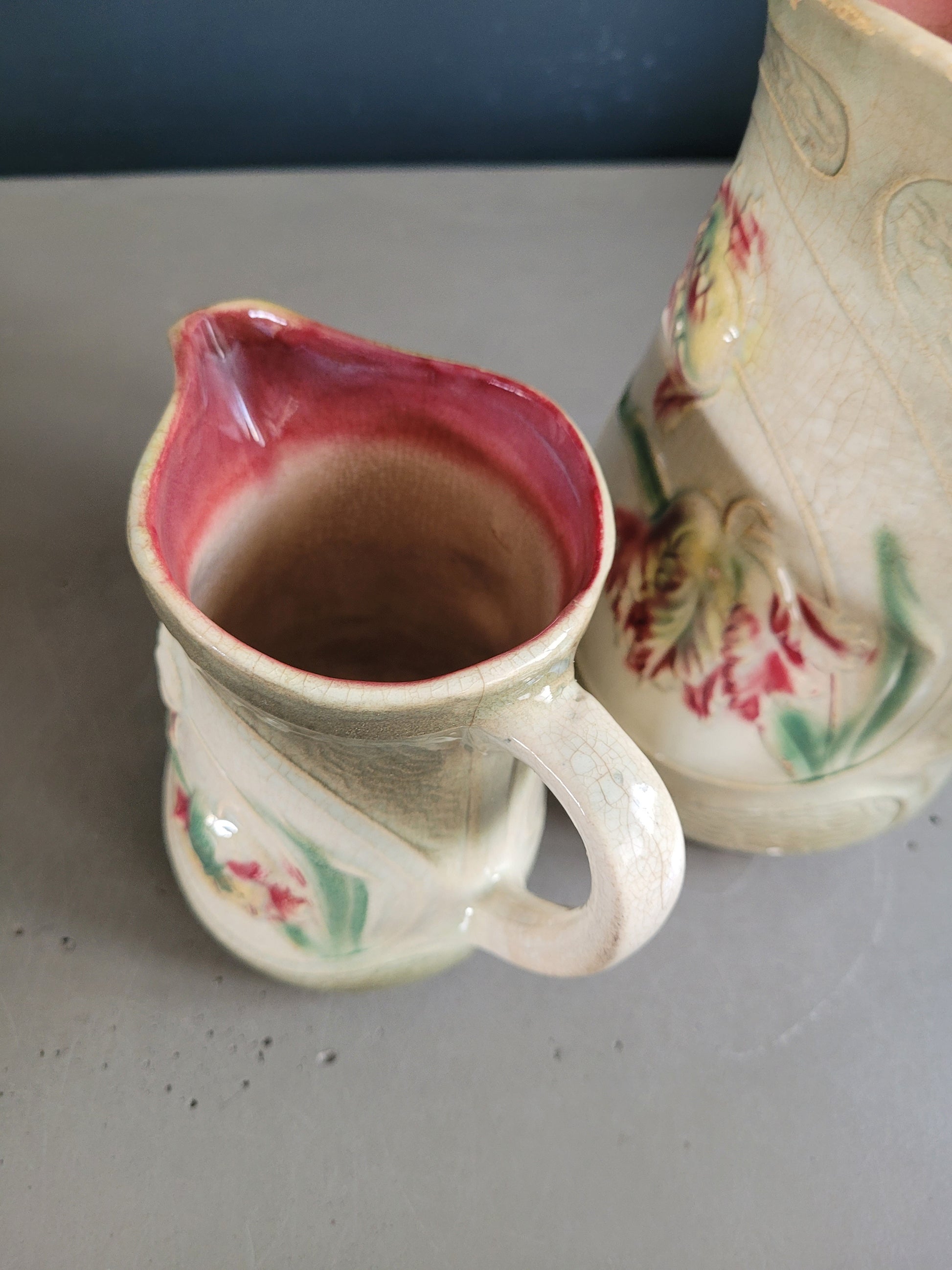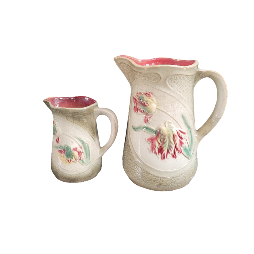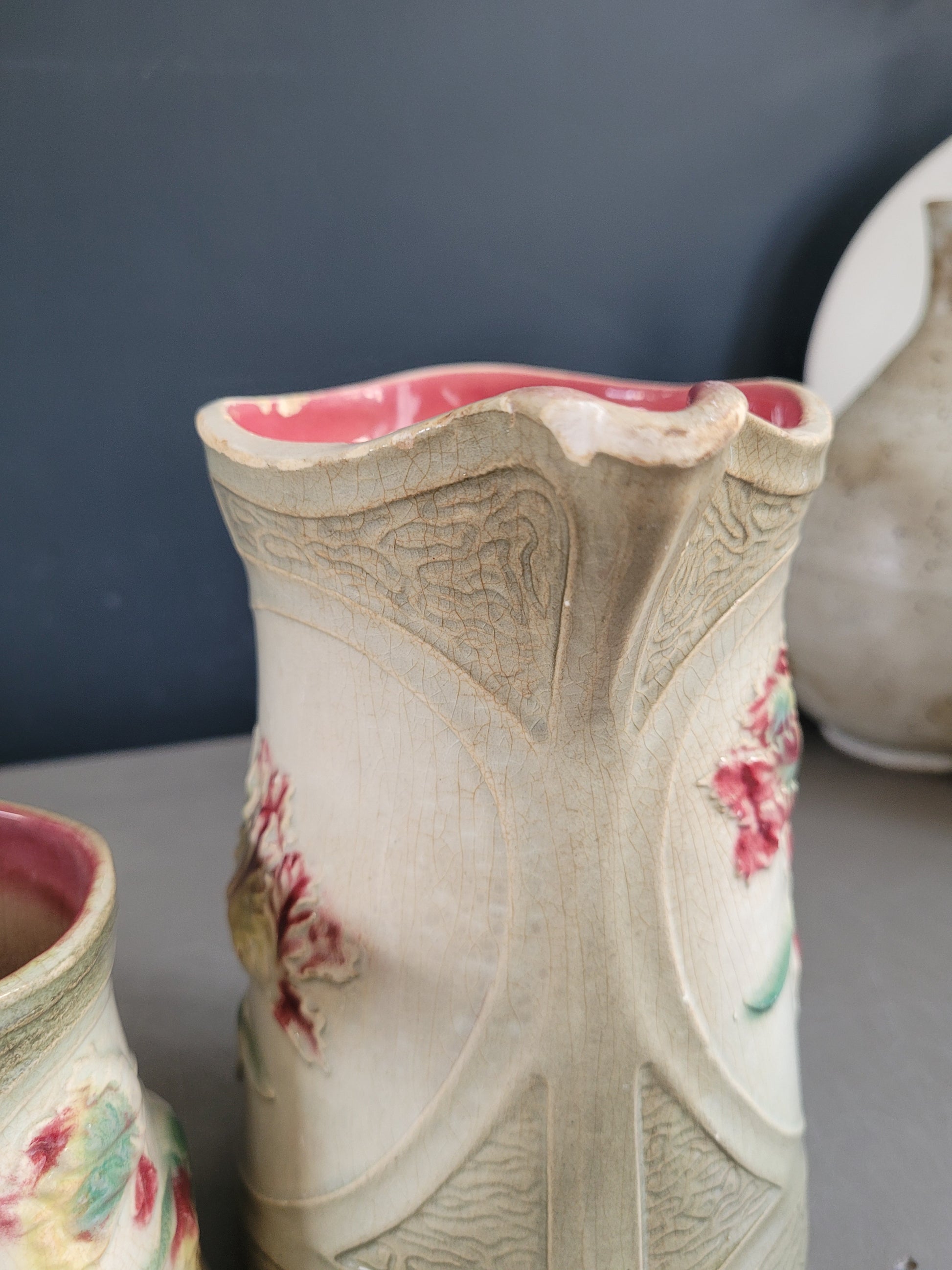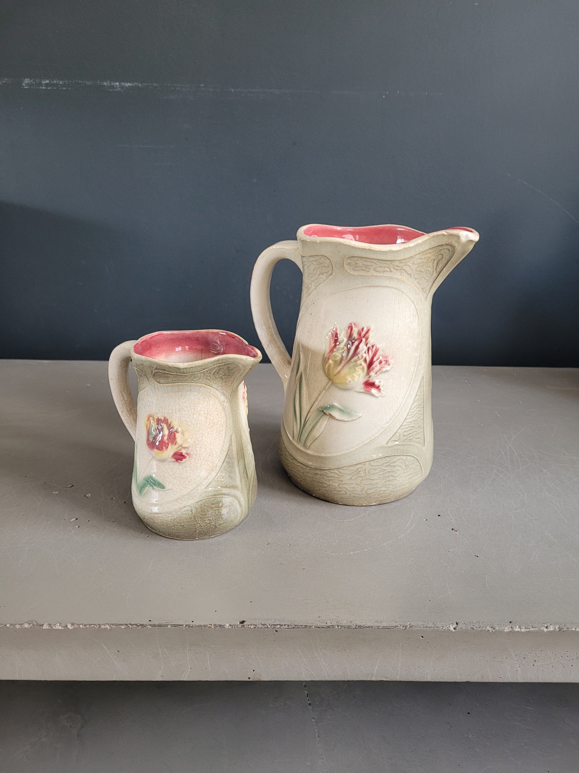 Magnifique paire de pichets anciens avec 2 motifs différents de tulipes en barbotine de part et d'autre, et ornés de décors sur toute la surface.
